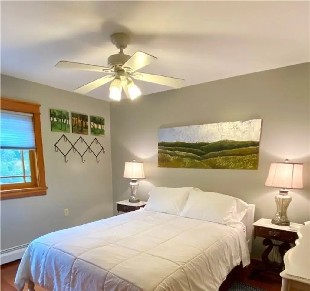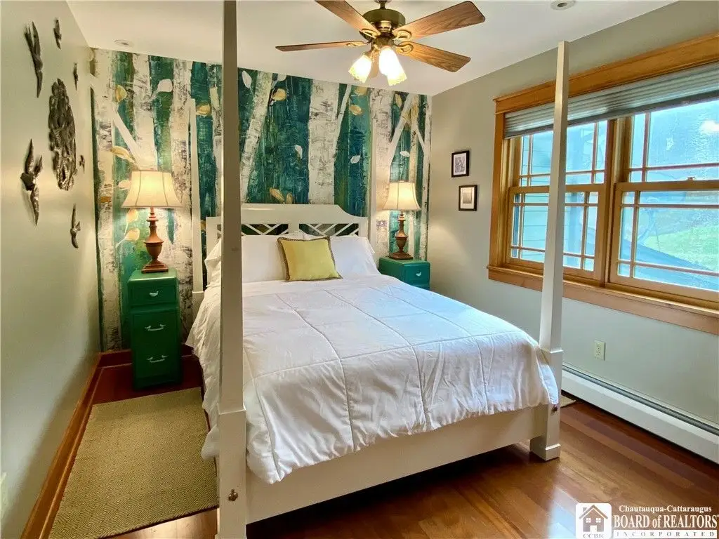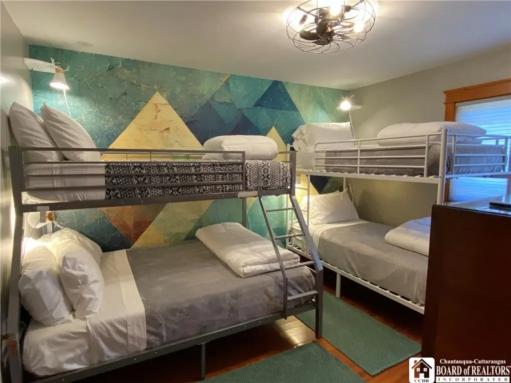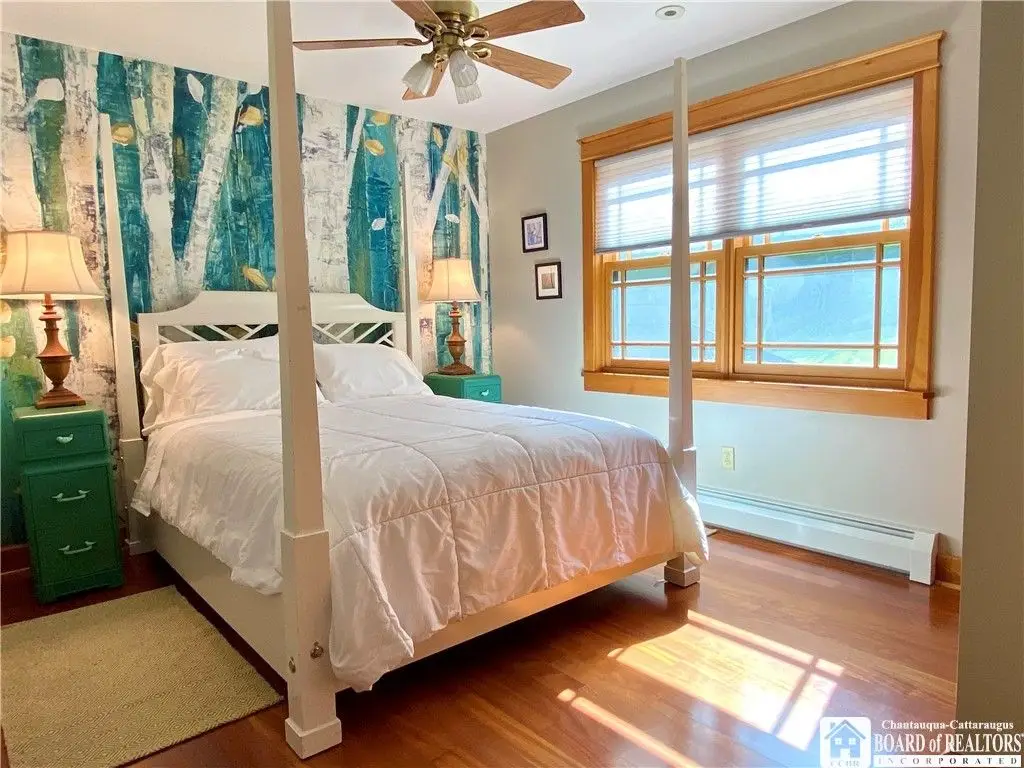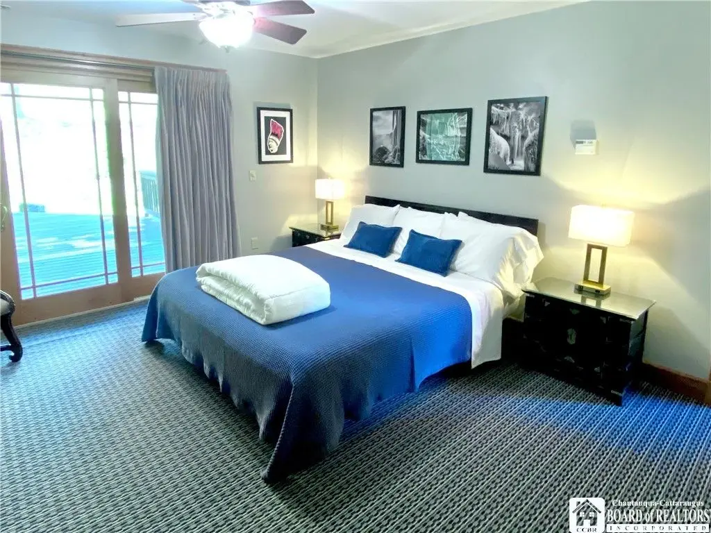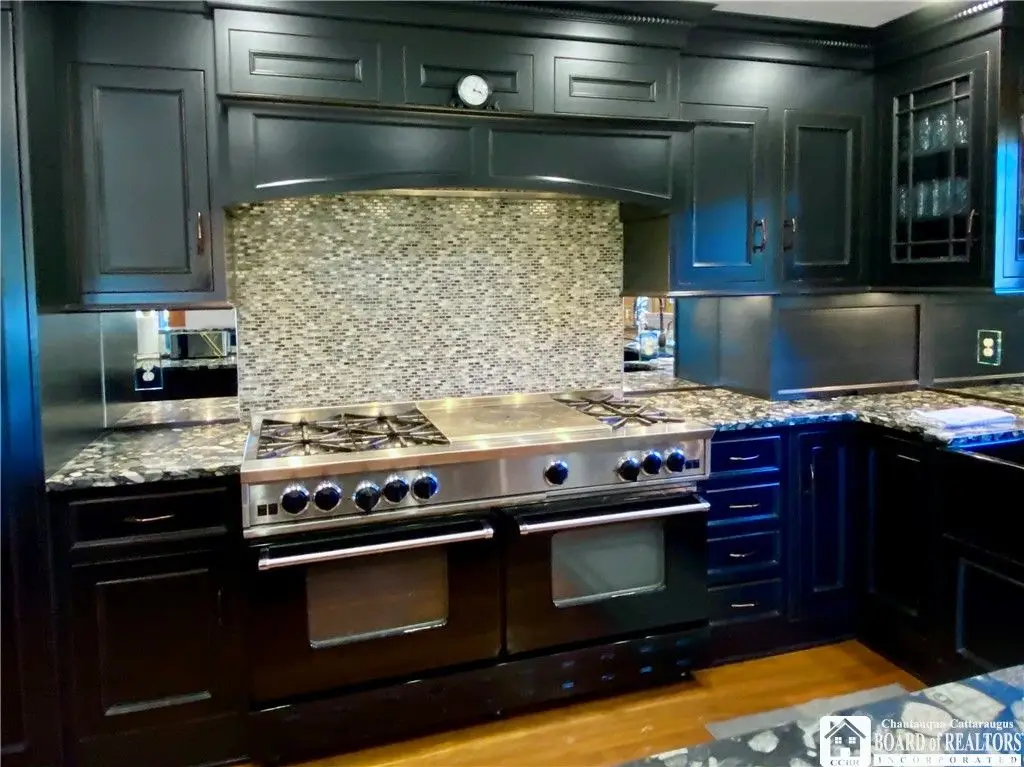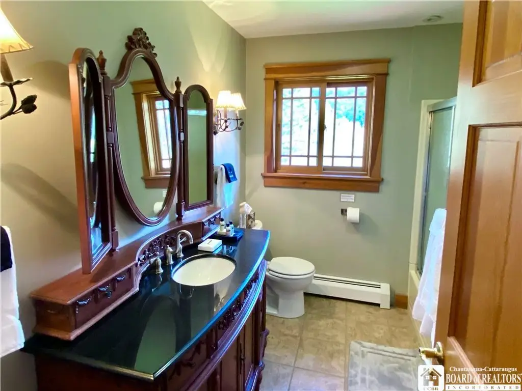 Tucked away on 20 acres of land, just 1 mi. from the Village of Ellicottville and 10 minutes from skiing, this unique home offers the space you need and the amenities you deserve. 5600+ sq/ft of interior space includes a spacious primary suite on the main floor, a spacious junior suite (with balcony overlooking the pond and slopes at Holiday Valley), 5 guest rooms, for a total of 7 bedrooms and 6 full baths. The centerpiece of the house is the great room, with its vaulted ceilings, towering stone fireplace (1 of 3), wall of windows, wet bar, and magnificent chandelier. In-floor radiant heat keeps the large space feeling cozy in the coldest weather. Multiple doors lead out to deck that wraps around 3 sides of the house, including a covered porch in back with an outdoor fireplace. Custom, chef's kitchen, equipped to feed a crowd, with a 6-burner Blue Star range, double ovens, two warming drawers, an extra deep farmhouse sink (instant hot water), 20+ ft of granite countertop, large island workspace/breakfast bar, & plenty of storage. Lower level includes a mudroom & 2 1/2 car garage. Laundry room, firewood-storage room, party-sized wet bar & seating area with a w/b fireplace & home theater system (projector, 110" screen, high-end surround sound system (professionally tuned for the space), and rack-mounted entertainment system - except for Roku and gaming consoles - included with the house). 17 zones of separately-controlled radiant, hot-water heat. 2 central Unico-type air conditioning systems. A whole-home generator. Alarm system, with sensors throughout the house. This 20 acre property includes 2 ponds (1 swimmable), an apple orchard (also plenty of wild apple trees, berry bushes, etc.), woods (mostly maple), and a separate, climate controlled, toy garage/workshop. Additional 3000 sq/ft "barn" with finished 2nd floor!