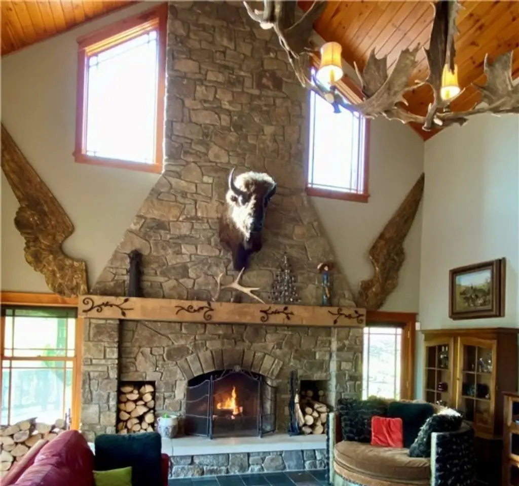 Vaulted ceilings with towering stone fireplace