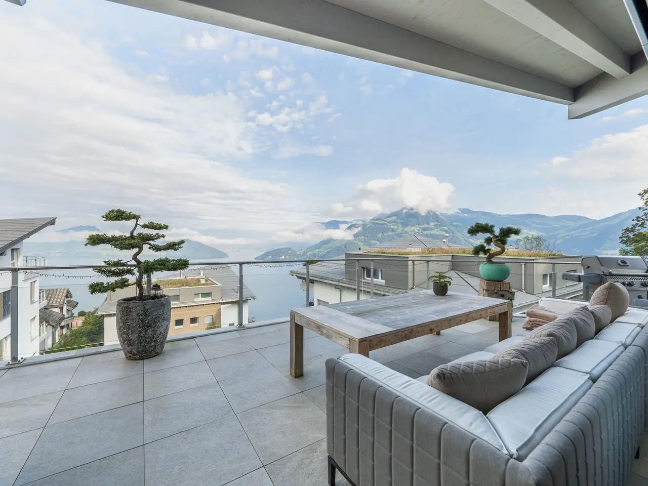 Expansive terrace with breathtaking lake and Alpine views