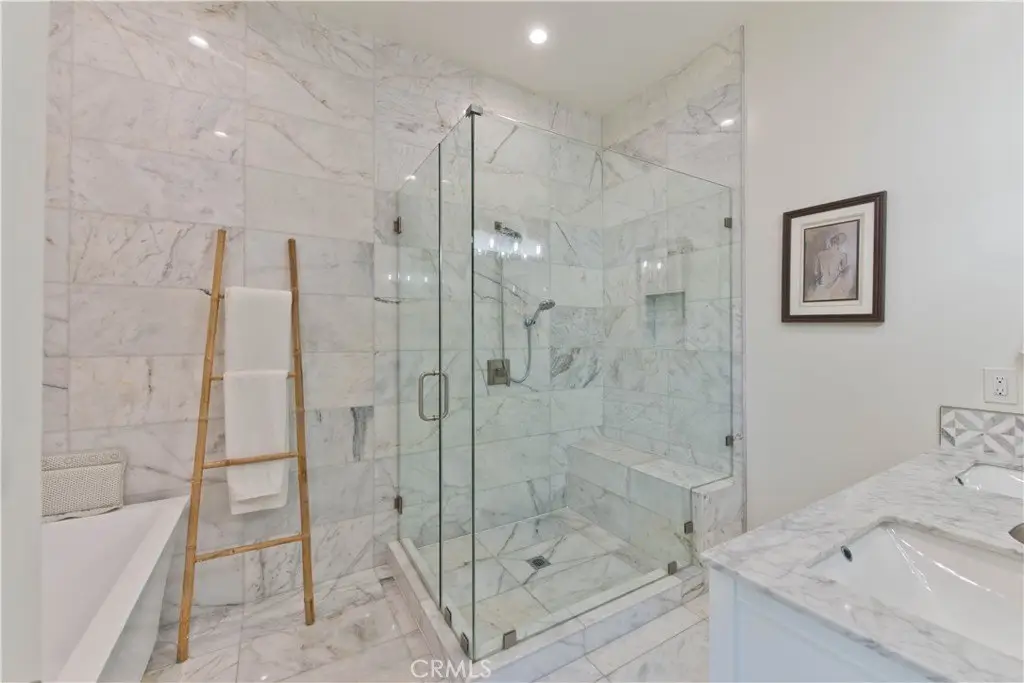 Stunning Remodeled Encino Park Home with Modern Upgrades and Energy Efficiency. Welcome to this beautifully remodeled and expanded 5-bedroom Encino Park gem, offering a seamless open floor plan flooded with natural light and highlighted by a striking exposed wood beam ceiling. From the moment you enter, you’ll be captivated by the expansive great room featuring wall-to-wall glass doors that open to a serene outdoor space. The chef’s kitchen is a showstopper — designed with quartz countertops, a spacious eat-in island with ample storage, soft-close white cabinetry, premium Thor stainless steel appliances, and a massive walk-in pantry for ultimate convenience. This home includes three generously sized bedrooms near the front of the house, accompanied by a large shared bathroom with double vanity. The luxurious primary suite is a private retreat with a walk-in closet, spa-like bathroom featuring an oversized shower, soaking tub, and dual sinks. An additional en-suite bedroom with its own walk-in closet and full bath adds flexibility for guests or extended family. Step outside to your private backyard oasis, complete with low-maintenance turf, a durable Trex deck perfect for entertaining, and lush landscaping. Enjoy energy efficiency year-round with fully owned solar panels and Tesla Powerwall batteries, keeping your electric bills low and your home powered even during outages. This move-in ready home blends comfort, luxury, and sustainability — don’t miss this rare opportunity in Encino Park!
