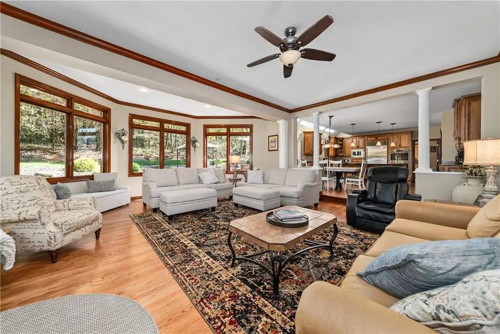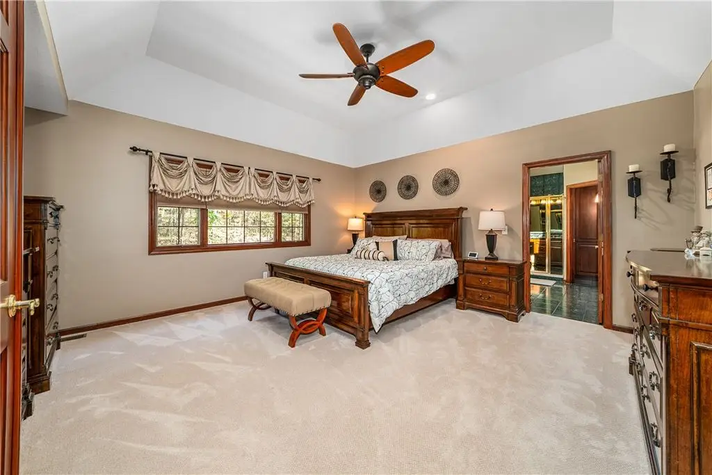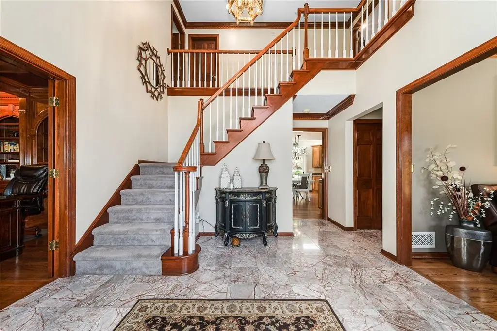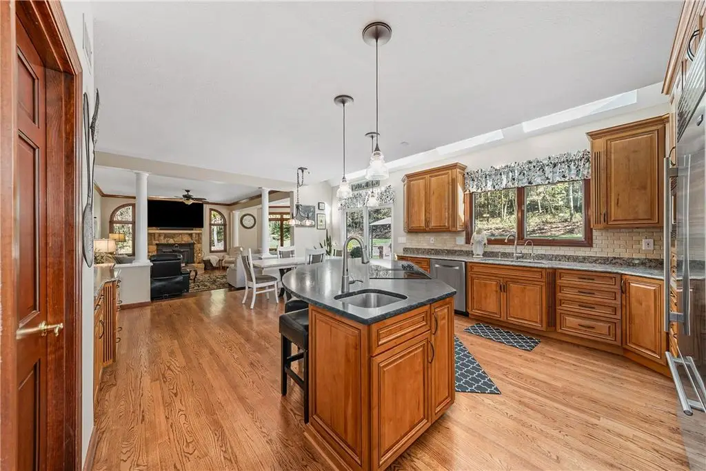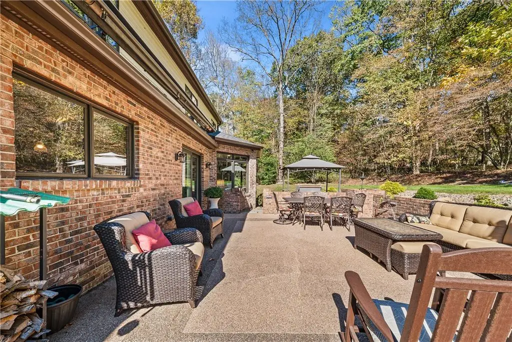 Perfectly situated on 3.6 secluded acres, 340 Fassinger Road is perched on the hill like a fortress. This all-brick estate offers 5 bedrooms, including two primary suites - one on the main level and another upstairs - plus 4 full and 2 half baths. The home's high-end kitchen features custom cabinetry, premium appliances, and seamlessly flows into the massive living and entertaining space. Other perks include a finished lower level with a full bar (and kegerator!), wine cellar, and a dog-washing station. Outside, the serenity continues: a sprawling yard bordered by mature trees creates a natural retreat, complete with a backyard patio with motorized retractable awning ideal relaxation or gatherings. Sportmens or Car Enthusiasts will love the two-story garage with ample storage and workspace. This fortress has a new roof and was designed for comfort, function, and quiet luxury - total privacy, modern upgrades, and timeless strength is just minutes from Cranberry's conveniences.