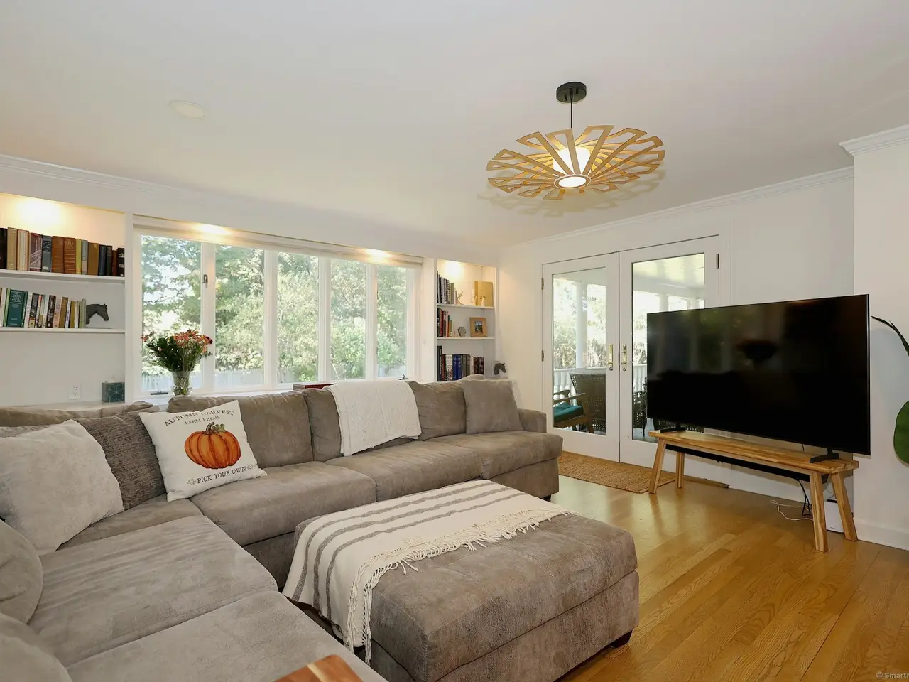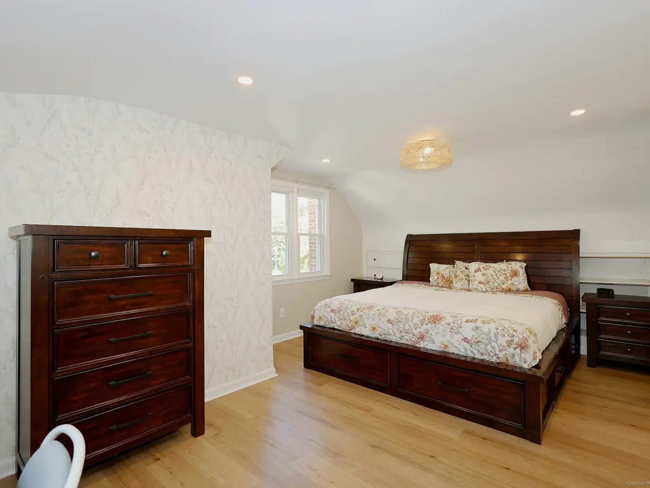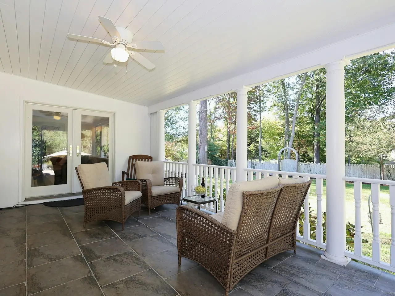Welcome to this beautifully expanded, updated Cape situated within a quiet cul-de-sac in one of Fairfield's most sought-after neighborhoods. Step into the inviting formal living room featuring a cozy fireplace, bay window, refurbished hardwood floors, new lighting, and fresh paint. The eat-in kitchen, with entry to the covered back porch, has granite countertops, SS appliances including a new Miele dishwasher, heated flooring and new light fixtures. In the large family room you'll be struck by the oversized windows with views into the backyard and neighboring pond. The room includes ample storage, built-ins, a French door with direct porch access, new light fixtures, fresh paint and refurbished hardwood floors. A large bedroom and updated full bath round out the main level, offering comfort and flexibility for guests or single-level living. Upstairs you'll find a spacious primary bedroom, a cozy guest bedroom, a versatile 4th guest room/office/nursery, and full bathroom. The finished lower level offers even more living space with endless possibilities such as a media room, home gym, rec room, or office. It also includes a full bath, a laundry area with new Miele appliances, dedicated storage, and direct access to the two-car garage and backyard patio. Enjoy a tranquil, fully fenced, level backyard with a spacious patio and covered porch that is perfect for relaxing or entertaining. Located just minutes from downtown Fairfield's vibrant shops, dining, and beautiful beaches. Please do not walk through the gate to view the pond, it is private property.