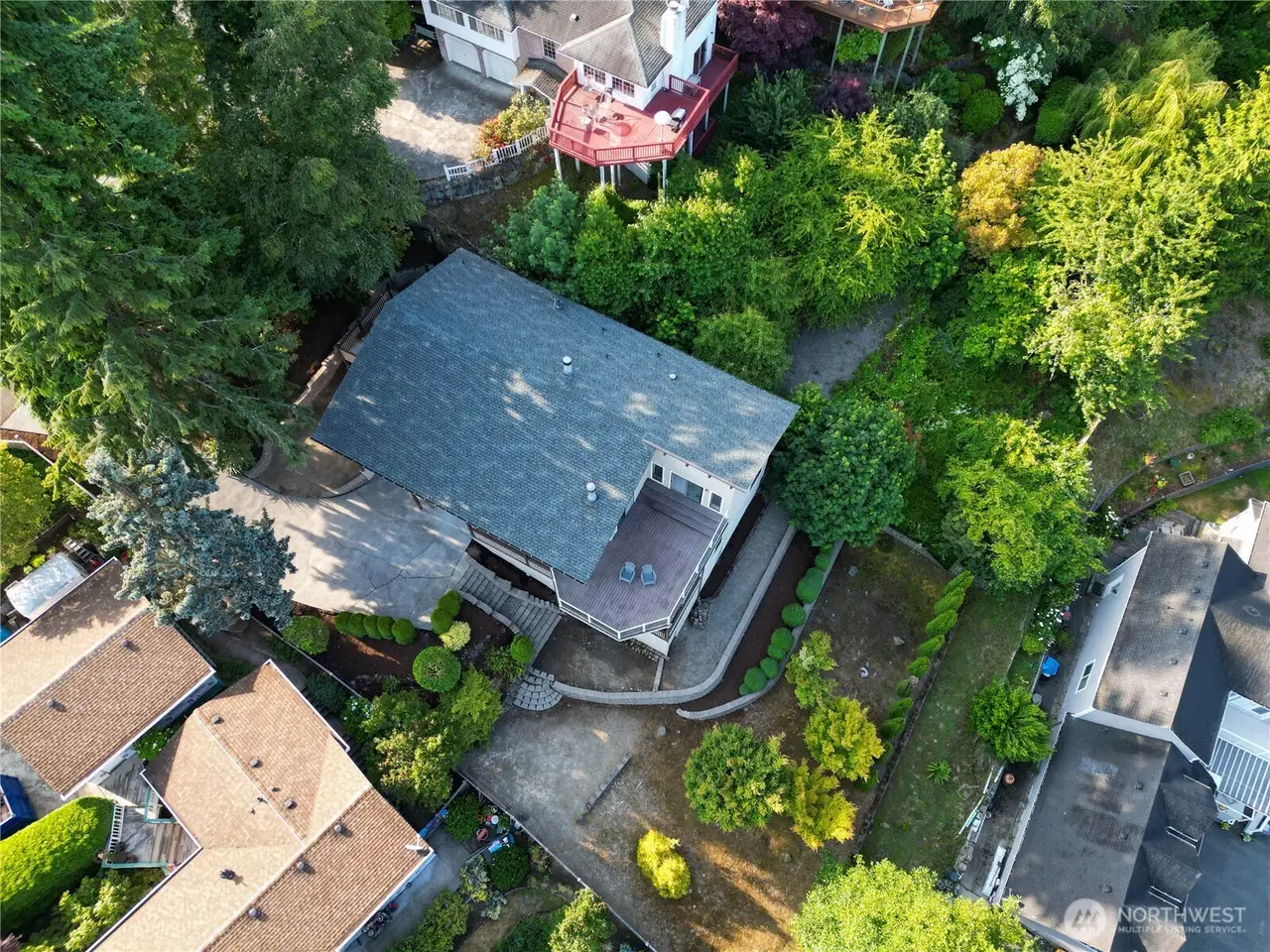 Rare find--offering panoramic Puget Sound views from nearly every room. Kitchen features solid oak upper cabinets, granite tile counters, tile floors, eating nook & a built-in pantry. Formal dining & an expansive family room w/fireplace & freestanding wood stove create a space ideal for entertaining. Primary suite boasts 3 closets & a en-suite bath w/heated floors, dual vanities, & a soaking tub. Second bedroom suite offers its own private entrance, a large open balcony, & direct access to a full bath w/heated floors & tiled tub/shower. Step onto the elegant deck to relax, dine, or simply soak in the view. Outdoor storage, deep 2-car garage, & a terraced yard complete this thoughtfully designed home--offering a lifestyle few others can match.