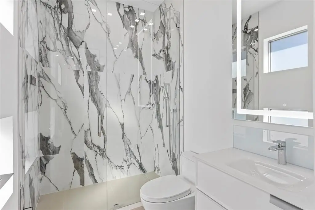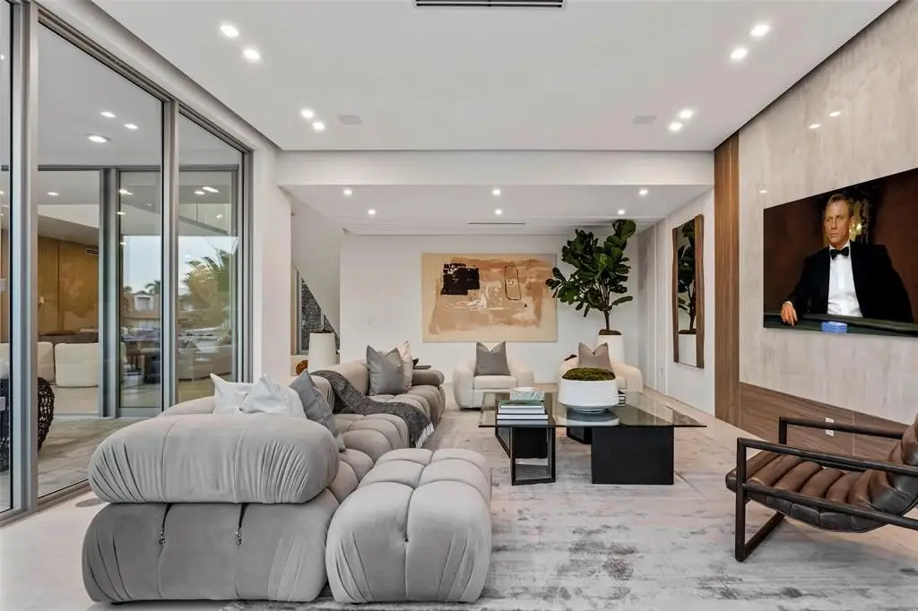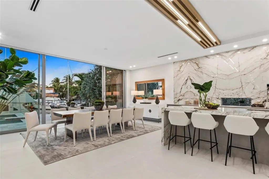 Chic New Construction 7-Bedroom Residence Sited on 85' of Deepwater in Las Olas Isles. Defined by clean lines and a bright open ambience offering water views from every major room, this Las Olas Modern 8,116 ± total sq ft waterfront home encapsulates a sophisticated elegance for a ‘Now’ style of living. Dramatic two-story foyer, faced by wrap-around walls of glass, flows out past the elevator vestibule & main living room to a true Chef's kitchen and waterside formal dining room. Opposite the private loggia is an intimate club room featuring impressive book matched stones, wood paneling, and large-format porcelain tile floors complete the first level. Beautiful white-oak wood floors and integrated LED wall displays lead to a huge upstairs Master Suite, 4 VIP Bedrooms, and a Sunset facing terrace.