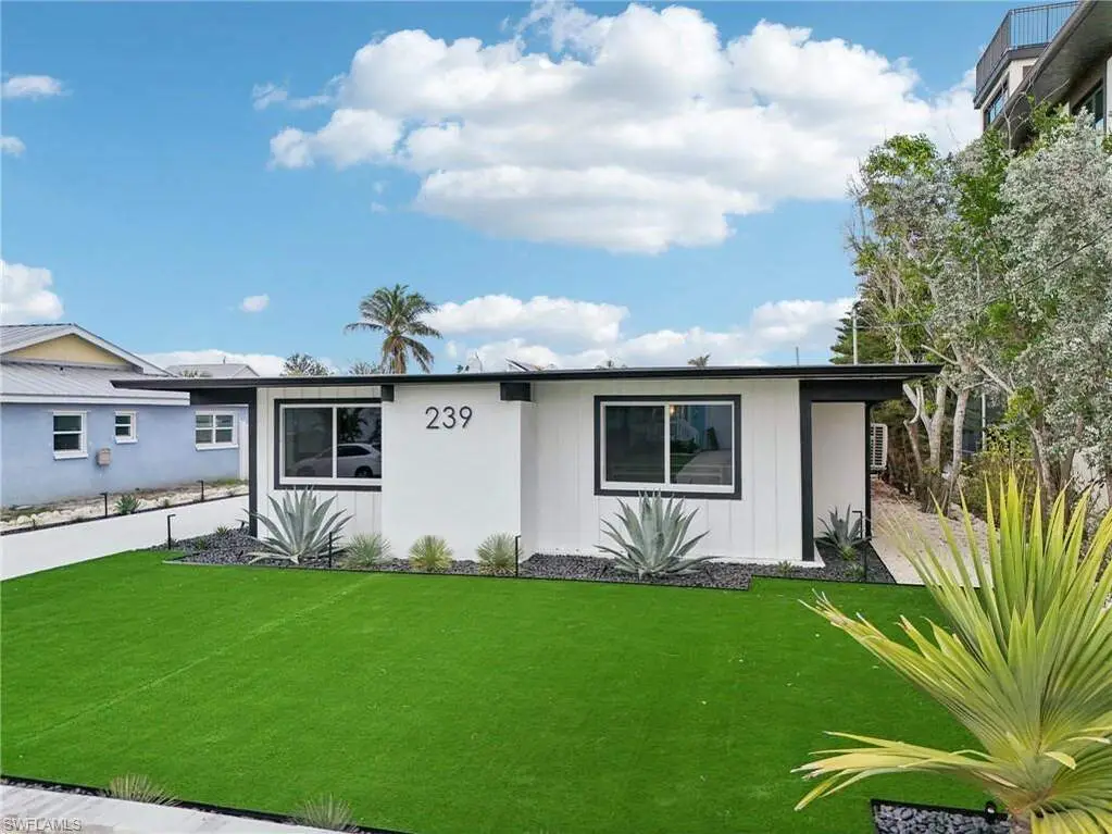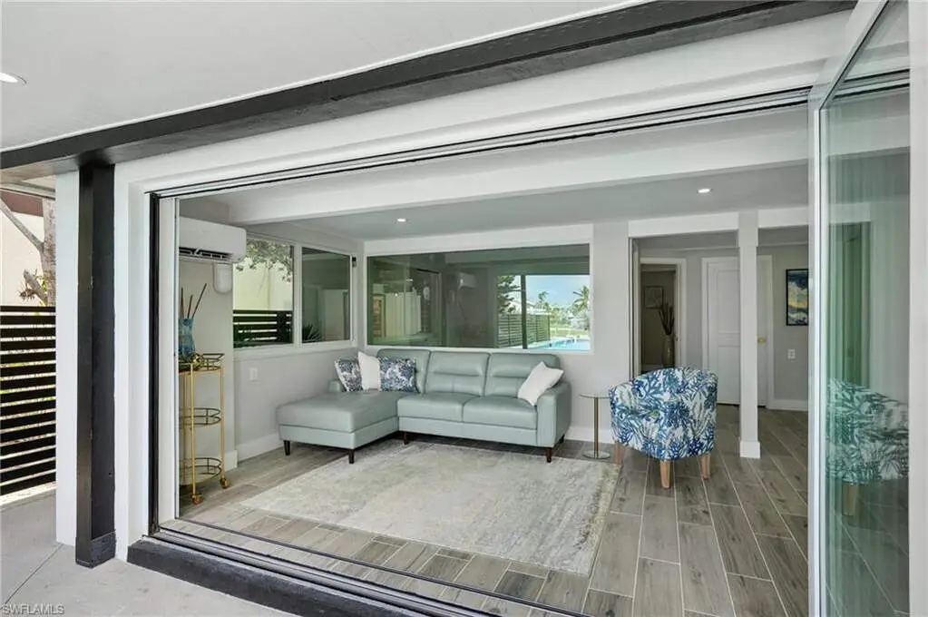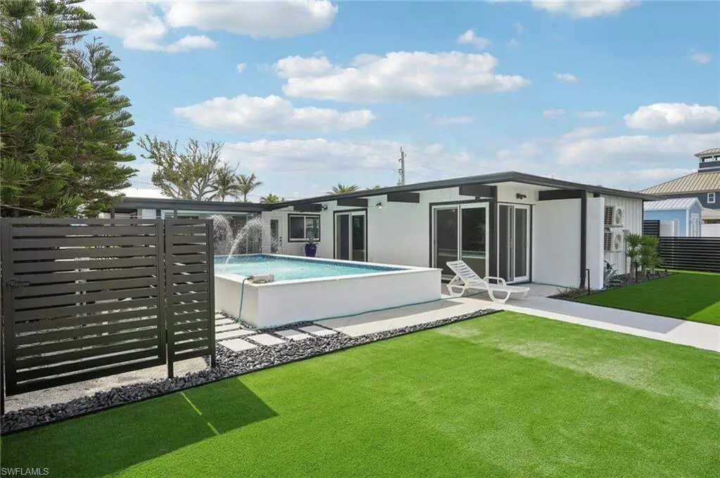 Modern elegance best describes this newly remodeled direct gulf access pool home with detached bonus guest house on Fort Myers Beach. With a total of four bedrooms and three full bathrooms, there is plenty of room for your extended family. The main home features custom cabinetry and tile work throughout the entire residence. The kitchen features not only stunning quartz counters, but a quartz wall, designer Bosch appliances, and ample size breakfast bar. While you relax in the living area, you can open your panoramic sliding doors to enjoy the breezes off the water. As you step into your detached one-bedroom guest home, you can enjoy the same level of workmanship and detail, inclusive of custom cabinetry, tile work, and modern finishings. In addition to a one and a half car garage, custom aluminum fencing and additional parking, the exterior has been meticulously zero scaped with fresh stone and a beautiful synthetic lawn for ease of maintenance and a sleek appearance. As you relax by your pool, you can enjoy Bay views and watch the Dolphin and the Manatee as they play right in your backyard complete with a brand-new seawall and dock. Why wait for new construction when everything here was fully permitted, inclusive of plumbing, electrical, impact doors and windows, roof, and so much more. Jump on your boat right in your backyard or take a short stroll to the white sands to explore all that southwest Florida has to offer!