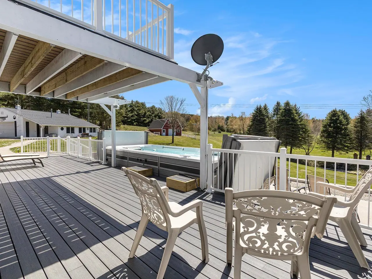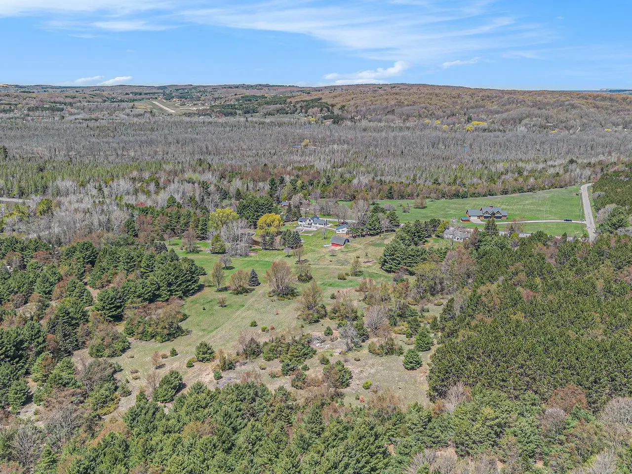 This remarkable home and property offers stunning and peaceful views that can truly be appreciated during a visit. Nestled on 25 beautiful acres of rolling woodlands, white pine groves, and open areas perfect for farming and gardening, this property also includes a shooting range and hunting blinds. The residence features nearly 2,300 square feet of remodeled living space, including an updated kitchen with elegant cabinets and quartz countertops. The bathrooms have been renovated, and hardwood floors enhance the interior. The living room has a newer gas fireplace, and the family room includes a high-efficiency wood-burning stove. A lovely 12 x 40-foot Trex deck overlooks the grounds, complemented by a second-floor balcony and charming brick-paver retaining walls, as well as a swim/spa pool. The patio is a generous size, designed with a durable concrete slab, and there is a whole-house generator. The master bedroom includes an en-suite with a walk-in bathtub. A spacious garage of about 1,000 square feet has electricity and natural gas heating. The pole barn features a concrete floor and has an upper-level loft with a private entry, providing versatile usage options. The grounds are diverse, featuring raspberry bushes, wild asparagus, mushrooms, and many apple trees. With ample land available, this property has great potential for future development or could serve as a family compound or campsite. It includes a serene pond and is serviced by a second well. The best way to fully appreciate all the impressive features is to visit in person, so please take the time to explore this exceptional property. Additionally, just 2.5 miles away is Grace Road Beach on Lake Michigan, enhancing the appeal of this location.