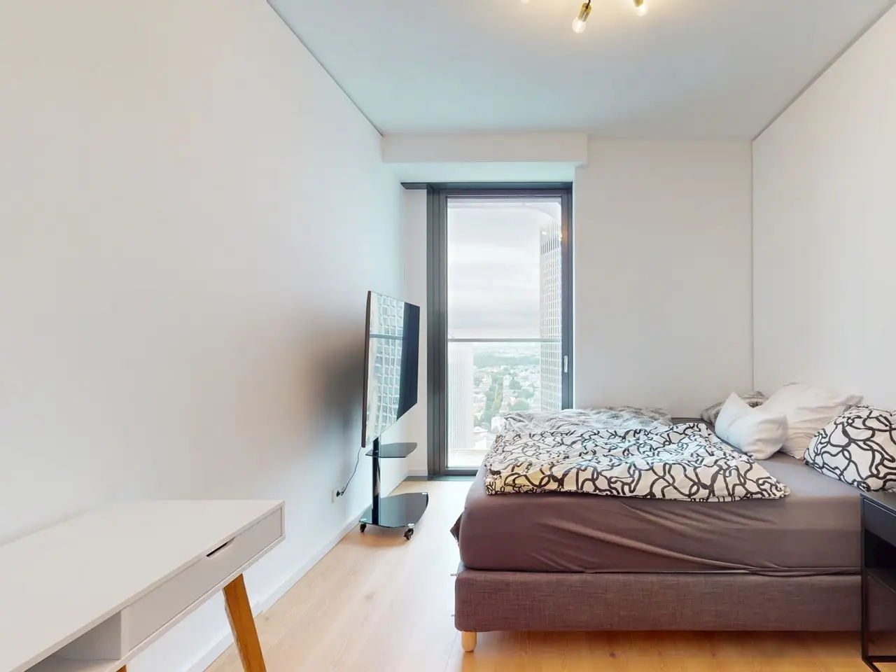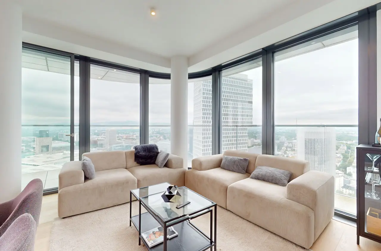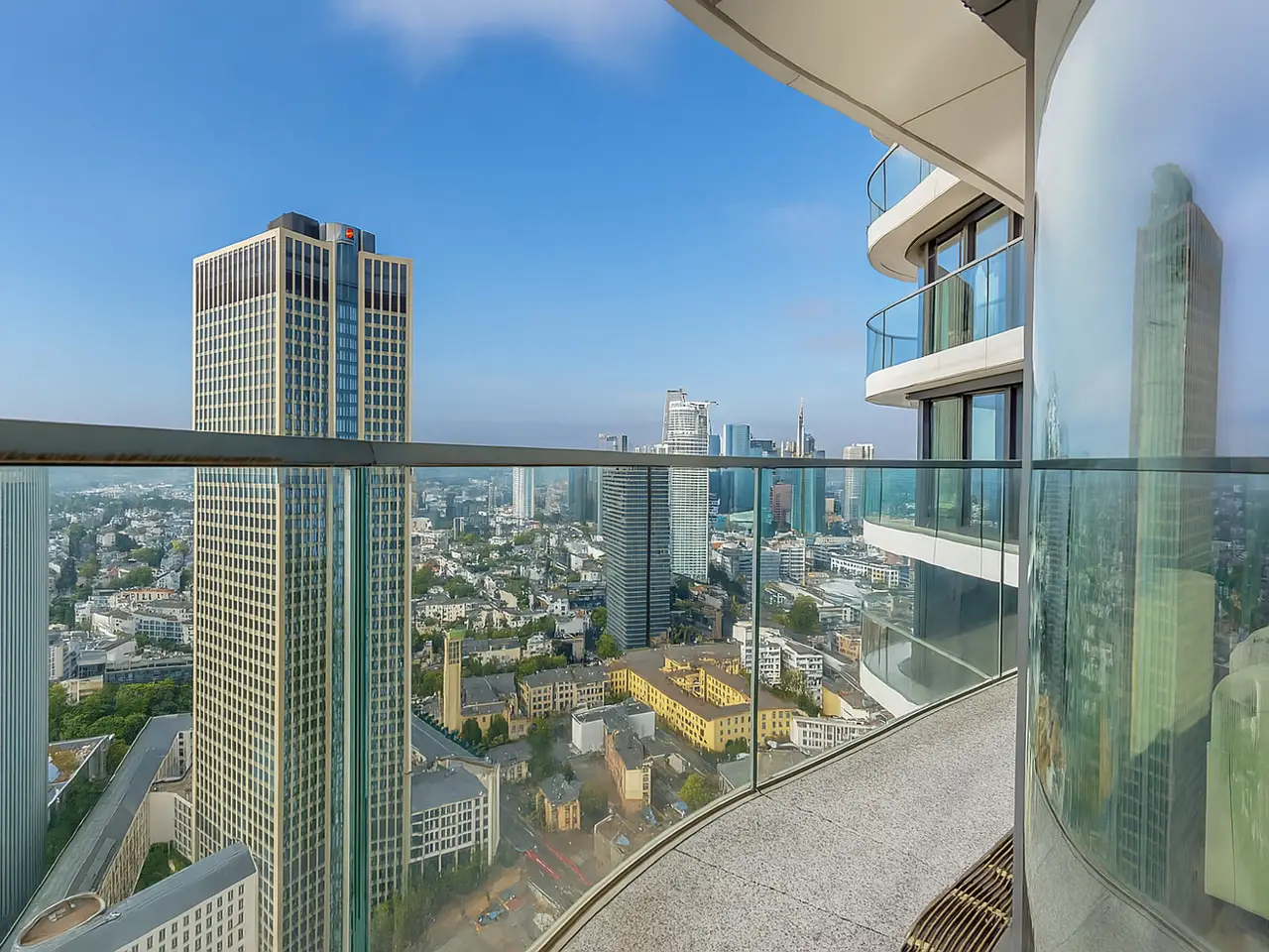 This absolute premium apartment is located on the fortieth floor of the Grand Tower, currently Germany's tallest residential tower at 180 meters - the most sought-after landmark building in Frankfurt. The transparent architecture, reminiscent of honeycombs, and the floor-to-ceiling windows offer airy living and magnificent views. The living/dining area is flooded with light and features curved glass fronts. From here, you have access to the balcony with all-round glass balustrade and views of Frankfurt and its skyline, as well as the Taunus and the entire surrounding area. The three bedrooms, one of which has its own balcony, offer great and practical living space. The communal Grand Garden on the seventh floor with lounge areas and herb garden and the Sunset Terrace on the 43rd floor invite you to relax and provide a communicative, urban atmosphere and magnificent views of the sunsets. The 24-hour concierge service and the Club Kitchen on the seventh floor are further highlights of this exceptional apartment. An underground parking space is included in the purchase price. The apartment is ideal for singles, couples or small families with up to one child who appreciate urban living in the Grandtower, combined with a high level of living comfort and communal areas for relaxing.