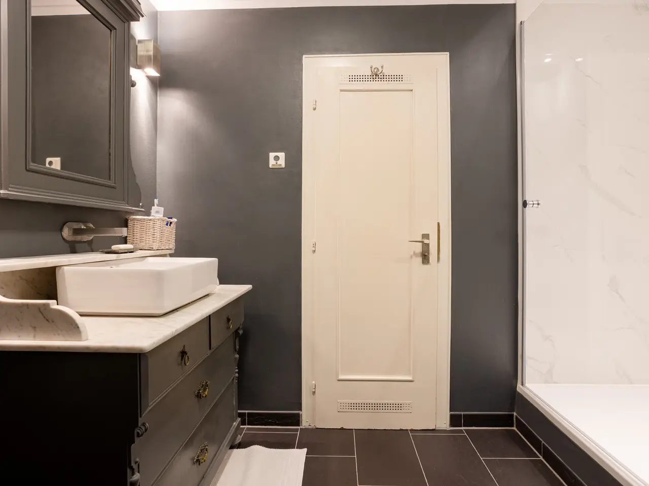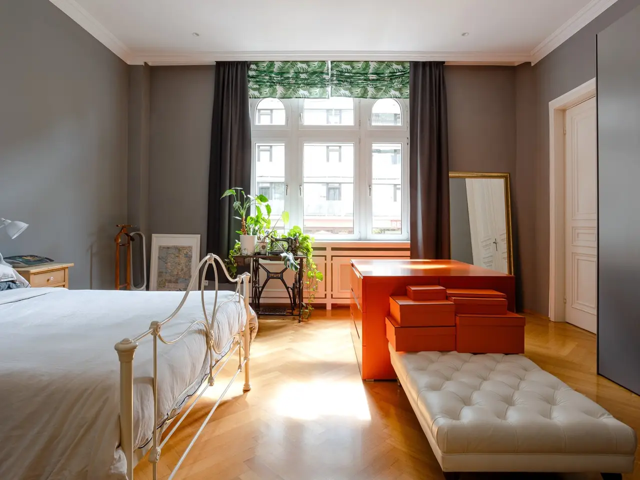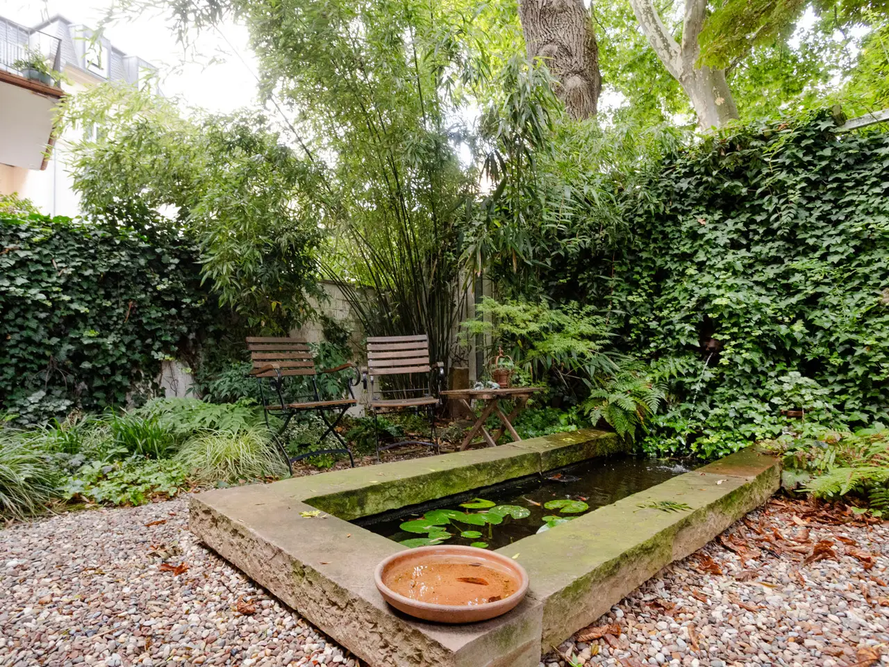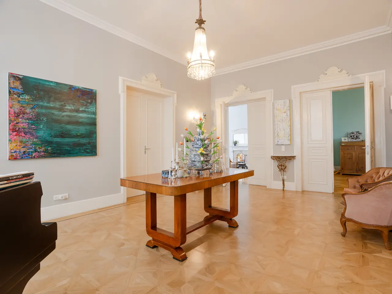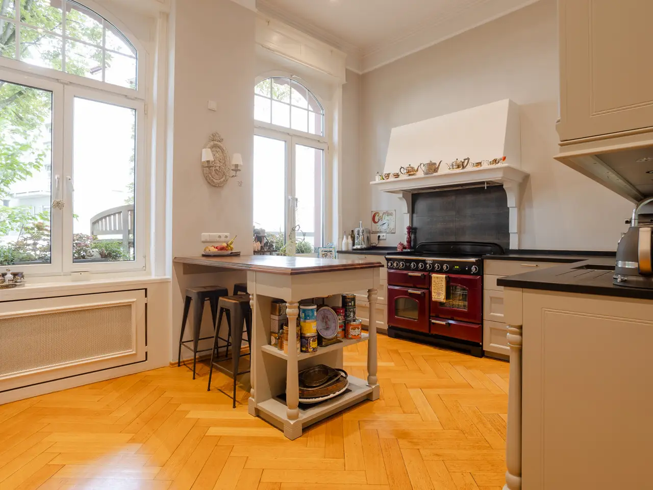 This unique period apartment with an idyllic garden is located on the mezzanine floor of a prestigious 4-family house built in 1900. The stately apartment impresses with approximately 4 meter high ceilings and original style elements typical of the construction period around 1900, such as majestic double doors and a sliding door, artfully decorated door frames, herringbone parquet flooring and high window elements in the style of the original year of construction. The stylish domicile is accessible via a private entrance and, with its two floors and garden, conveys the feeling of living in a townhouse. The spacious entrance hall on the mezzanine floor, with its elegant historical character, is suitable as a prestigious reception room with flair. As was customary in the Wilhelminian style, the three stately rooms are connected by double doors or the imposing sliding door. The dining area is housed in the fully glazed, very decorative conservatory, which is also around 4 meters high and faces directly onto the garden. The impressive, very stylish rooms are flooded with light from morning to night and offer beautiful views. The dining room leads onto the terrace and down a few steps into the idyllic garden with its English character. The large eat-in kitchen is equipped with a custom-made luxury kitchen in a historically authentic style and, in addition to modern appliances, offers a free-standing Falcon De Luxe range stove with multifunction oven and much more to match the flair of the kitchen. The bathroom on the mezzanine floor is also furnished in the Wilhelminian style. All bathrooms have underfloor heating. On the lower level of the maisonette-style apartment is a spacious, bright bedroom with high ceilings and a modern daylight bathroom. This area has a separate entrance via the general staircase. This exceptionally beautiful apartment delights with its incomparable charm and harmoniously designed, luxurious interior. The romantic garden complements the historic ambience. Part of the garden can be cut back to make use of the two parking spaces.