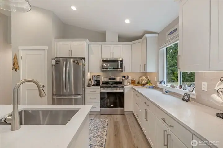 Built in 2023 with modern convenience in mind, this Westcott Bay home offers low maintenance living just minutes from Roche Harbor’s dining, marina, and shops. Vaulted ceilings and a gas fireplace set a welcoming tone, while durable luxury vinyl plank floors and quartz countertops combine style with easy care. The open kitchen is ideal for everyday use and entertaining, and the spacious primary suite is a private retreat. Thoughtful features include ductless heat pumps for year-round comfort, plus solar and generator readiness for peace of mind. Enjoy the back deck, a sunny backyard, and private community beach access—along with a short stroll to the local oyster farm. A perfect blend of new construction, efficiency, and island convenience.