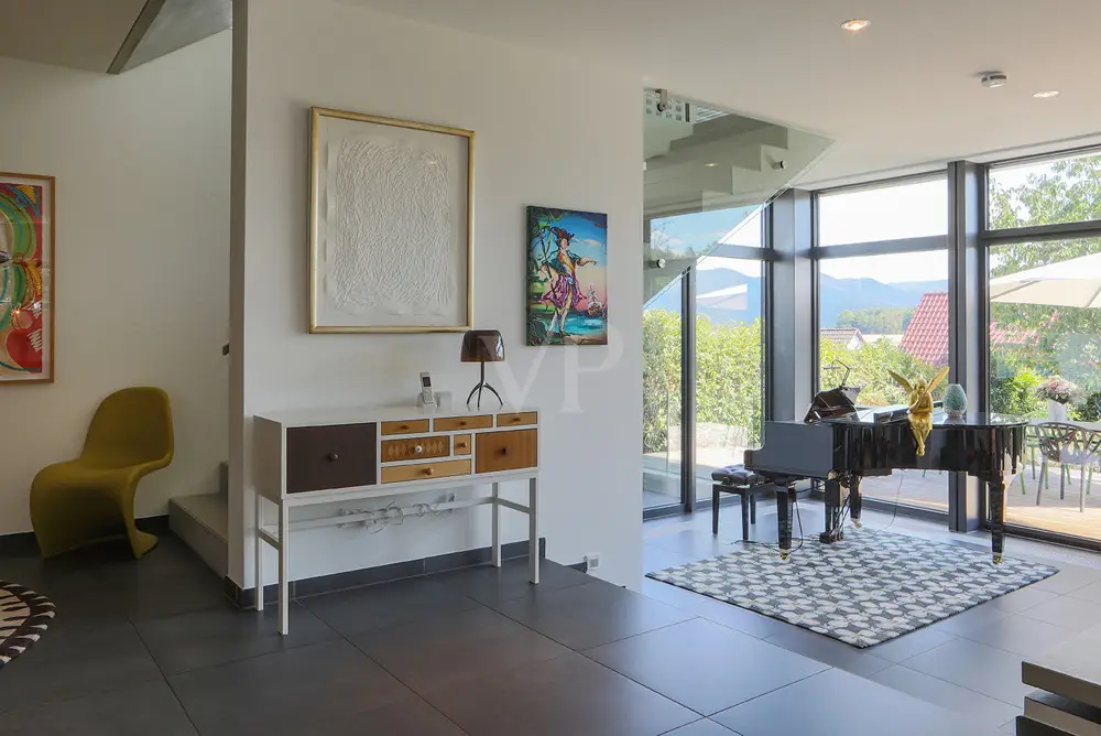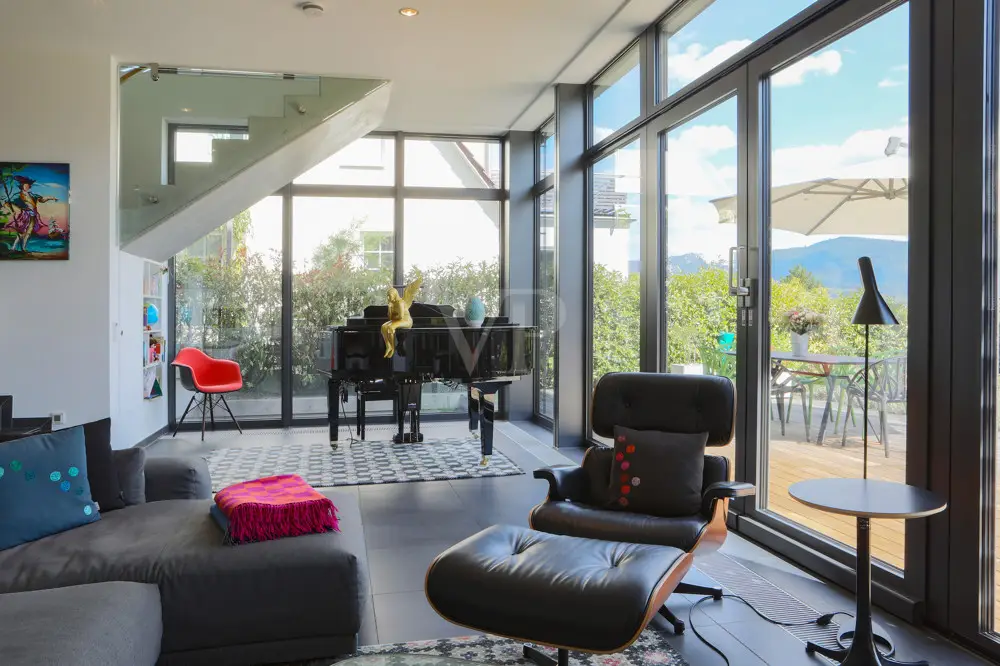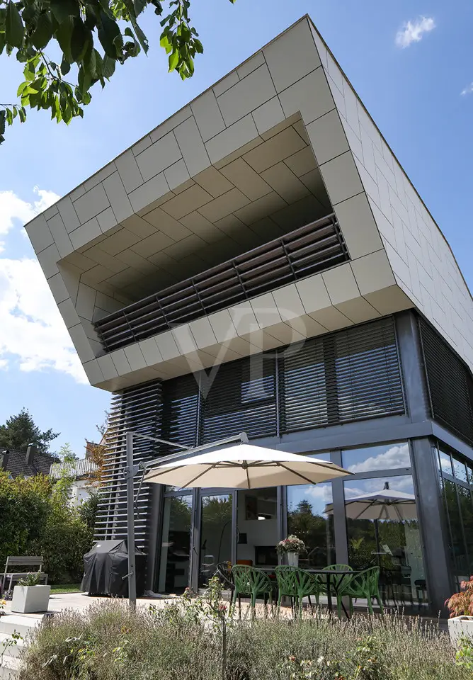 Unique architect's house in a top location in Gaggenau. Dreamlike jewel, with approx. 320 m² of living space and fantastic views, offering you and your family luxurious and peaceful living. But also the opportunity to work in the office in a quiet location. The luxurious standard is reflected in the attention to detail. There are numerous exclusive special features and high-quality detailed solutions that make this property unique. Starting with the room-high glass fronts with triple glazing as windows and as doors to the terrace, high-quality exterior blinds, hardwood flooring on the terraces, large-format stoneware on the ground floor, controllable lighting system with downlights embedded in the ceiling throughout the house. Open fireplace as one of the highlights in the living/dining area. A high-quality kitchen with Gaggenau appliances and outdoor terrace directly in front of the kitchen. Extravagant wooden floorboards on the upper floor. Studio with adjoining spacious and sunny roof terrace. Large fitness room with saunas and associated wet/sanitary area. The house has a total of 3 floors and a basement. In the basement you will find the technical and storage rooms as well as a utility room. There is also a bright and spacious fitness area, which could easily be designed as a private gym with saunas and the corresponding wet rooms. You can access the first floor via the sheltered and covered entrance area or through the large double garage into a separate hallway area which leads you through the hallway to the kitchen or down the stairs to the basement. On the first floor, you enter the spacious and very bright living and dining area through the vestibule, with two levels, the open fireplace as a room divider and direct access to the south-facing terrace. The open kitchen to the dining area leaves nothing to be desired and is equipped with Gaggenau appliances. In front of the kitchen you have a spacious terrace which you can also access from the kitchen. The staircase takes you to the 1st floor with the enclosed area of the master bedroom, the dressing room and the associated bathroom en suite. There are also two further large rooms on this level with their own balcony, a bathroom, a further utility room and a large open space. The large studio with loggia and fantastic views can be reached via the hallway and staircase. This studio is currently used as a private office space. Directly adjacent to the studio is the very large roof terrace with storage rooms, water connections etc. This terrace invites you to treat yourself to an undisturbed sunbath or to enjoy the sunset. The entire property is fenced, in the area facing the quiet residential street with a large wall and the electrically operated access gate and in the remaining area the property boundaries are secured and overgrown with a hedge. The south-facing terrace is covered with wooden planks and extends across the entire width of the house and, like everything else, is generously proportioned. Steps lead up to the lawned part of the garden. This description is only an excerpt. Only a personal viewing will allow you to fully experience the charm and quality of the property and discover many other details.