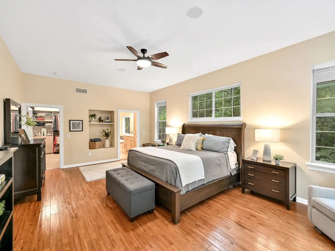 Welcome to Tree Tops! This impressive home will have you at hello. Step inside to soaring ceilings and an open layout that seamlessly connects the great room, dining area, and kitchen, perfect for everyday living or entertaining a crowd. Walls of windows fill the home with natural light and frame views of the private, wooded lot. Retreat to the expansive patio for outdoor dining, fireside chats, or simply soaking in the serene setting. Luxurious primary suite, plus two more spacious bedrooms and split entry second bath on main level. Half bath and large laundry room also on main. Fourth bedroom and third bath found in finished lower level, along with a large family room with bar, wine room, library with secret room, plus plenty of storage space. Enjoy the subdivision park and the convenient location, close to shopping and restaurants. Long list of updates too. Truly an exceptional opportunity.