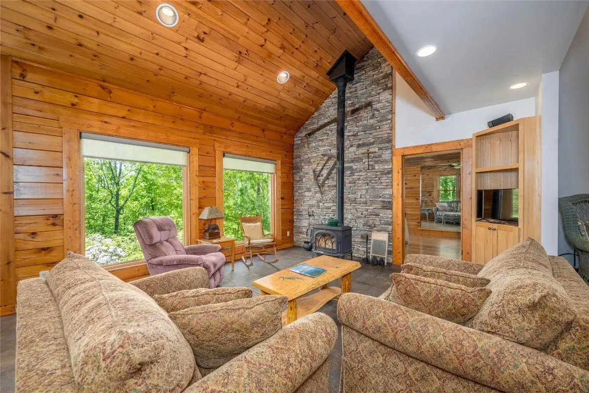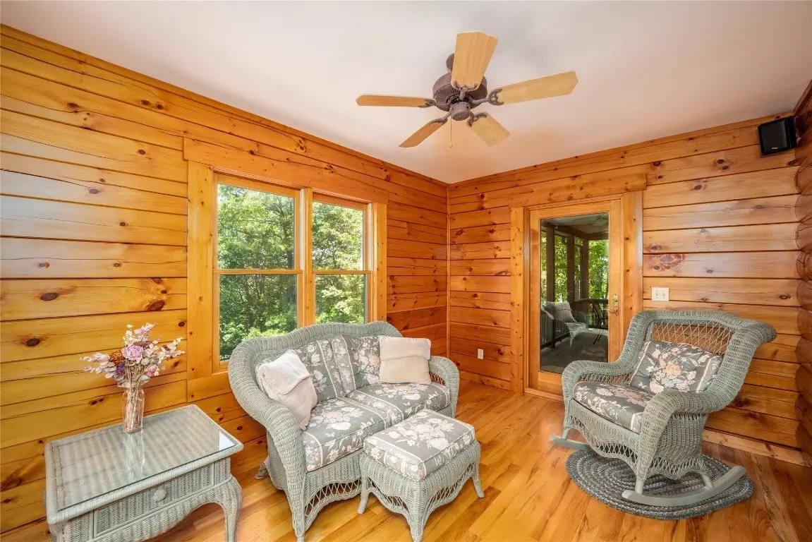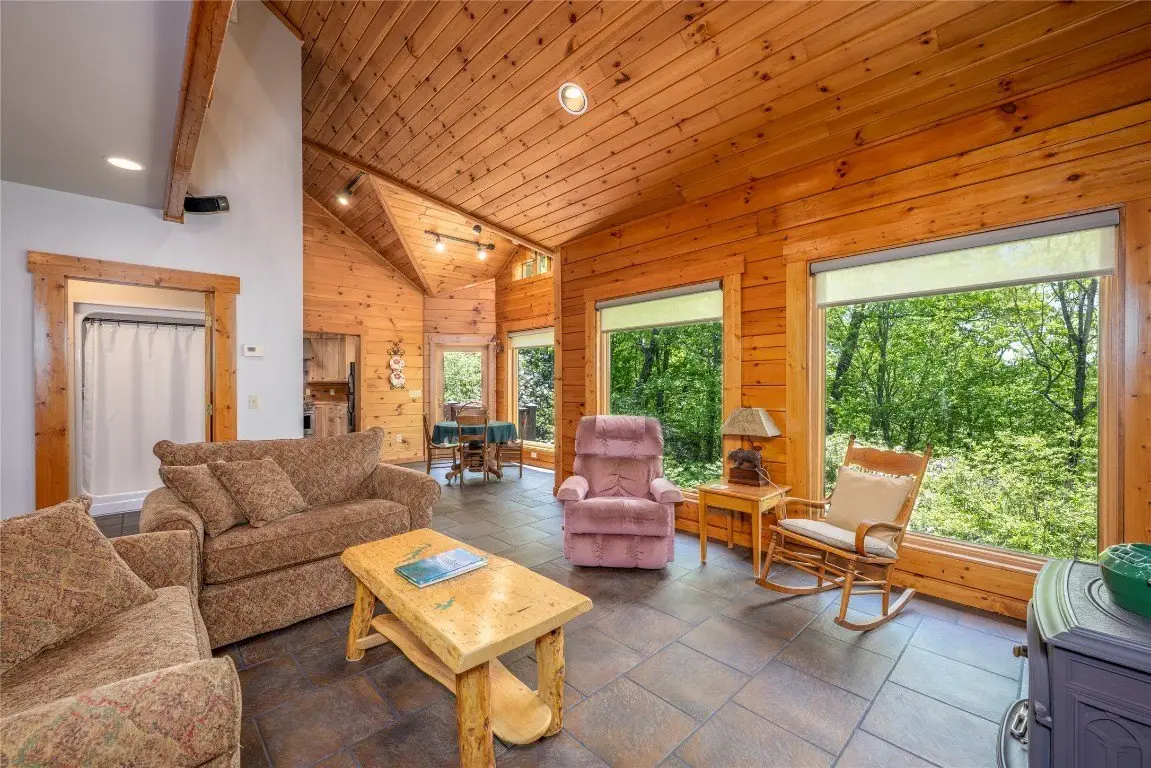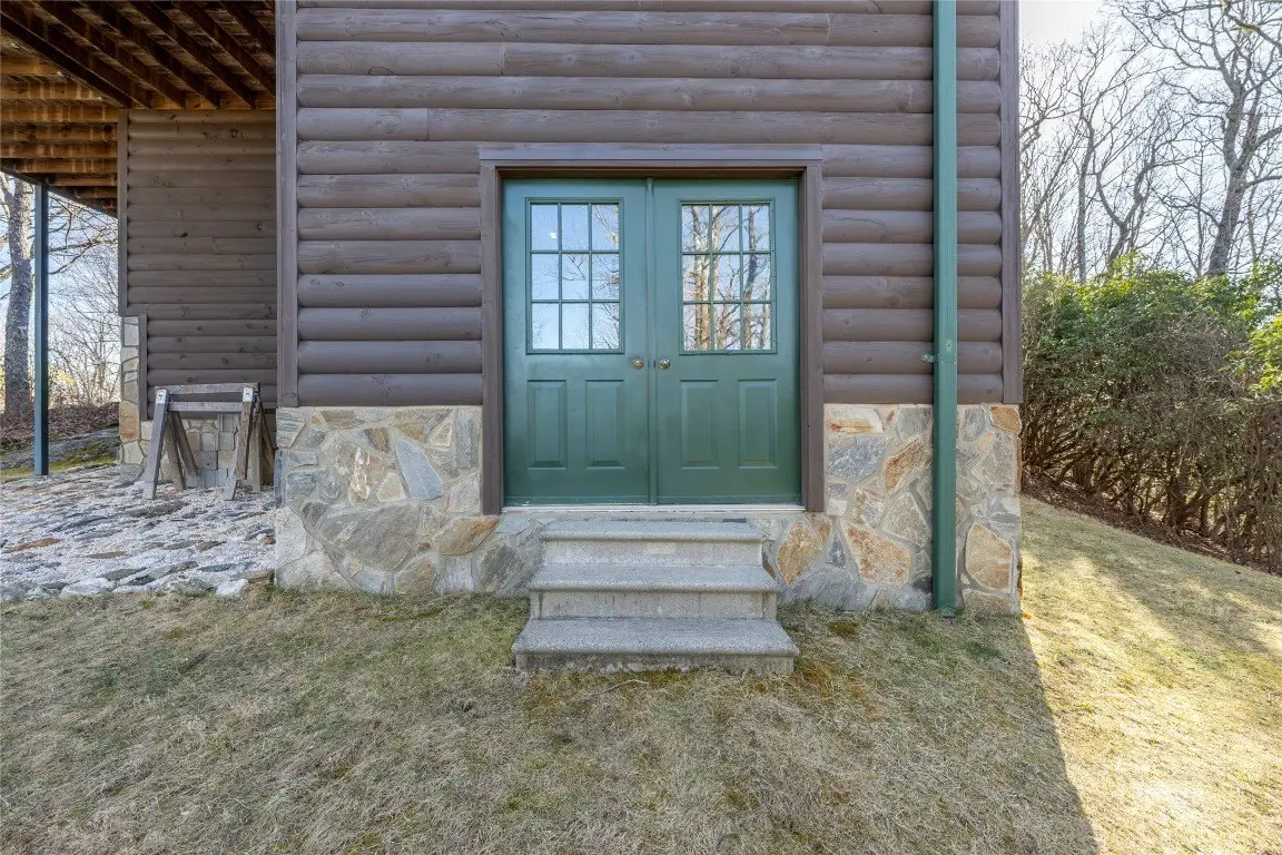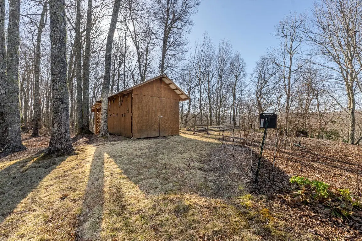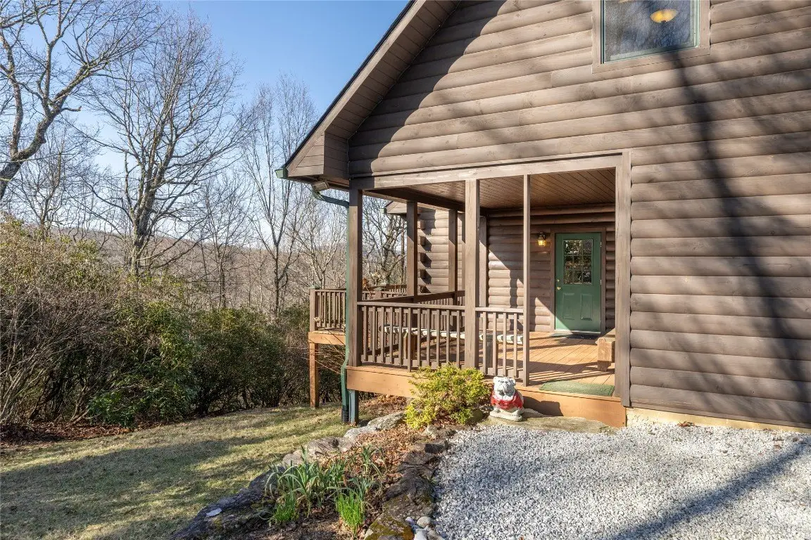 Discover a thoughtfully designed three-bedroom, two-and-a-half-bathroom log home on over 24 acres in the gated Laurel Falls community, which provides off-grid living in harmony with nature. Built for sustainability, this home features an exact solar south orientation, and the main living area has south-facing glass and thermal mass, so it retains warmth in winter and stays cool in summer. Radiant floor heating and a wood stove that heats the entire home provide additional warmth. The property is a nature enthusiast's dream with its wooded surroundings, scenic trails, and a gazebo with breathtaking northern views, including the Blue Ridge Parkway. Wildlife abounds, and deer, turkeys, grouse, and even black bears are frequently seen in the yard. The landscape is adorned with wild azaleas, rhododendrons, daisies, daylilies, and peonies, complemented by a striking strawberries-and-cream hydrangea near the back porch. Seasonal harvests include blueberries from the backyard and blackberries from the garden, with organic garden spaces ready for cultivation. Bordering over 6,000 acres of protected National Forest Service lands in Panthertown Valley - often called the Yosemite of the East - the property offers unparalleled outdoor opportunities and preserves its natural beauty through a conservation easement on rock outcroppings and ledges. Relax on the front porch, back deck, or gazebo and enjoy cool breezes, mountain vistas, and a stunning night sky complete with views of the Milky Way. Energy efficiency is enhanced by two 4-by-8 hot water panels that supplement the domestic hot water supply and home heating system. Commissioned in 2022, the solar power system was upgraded with new batteries in early 2024 and has a 10-year warranty. The home also features a buried 1,000-gallon propane tank, refilled approximately every two years, and propane-powered appliances, which include a stove, clothes dryer, and hot water system. Such energy-efficient living extends to the home's everyday conveniences, with a standard refrigerator and regular 110-volt outlets that ensure comfortable living. Conveniently located near Cashiers and Lake Glenville, this property combines eco-conscious living with serene beauty, making it a peaceful retreat surrounded by nature.