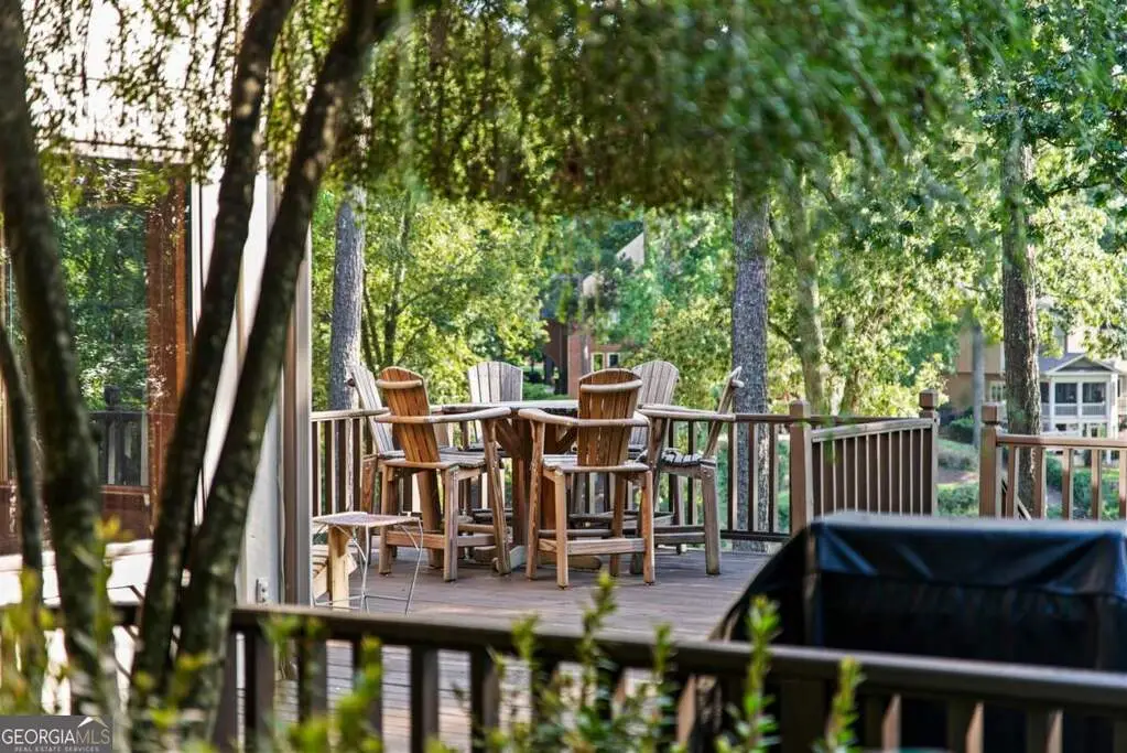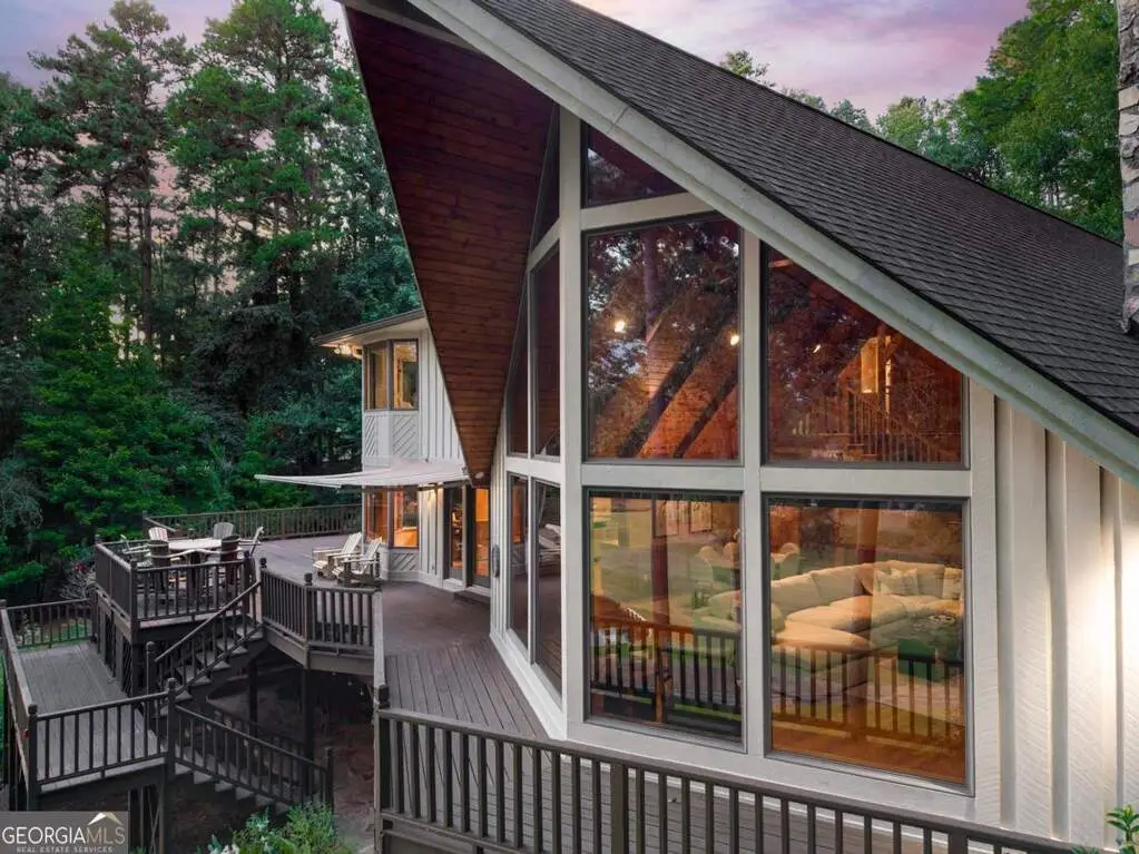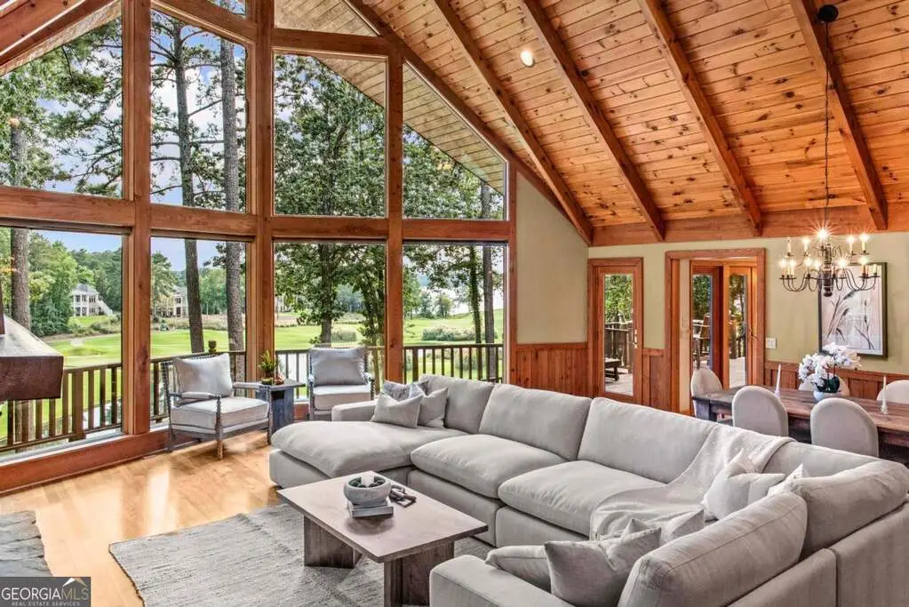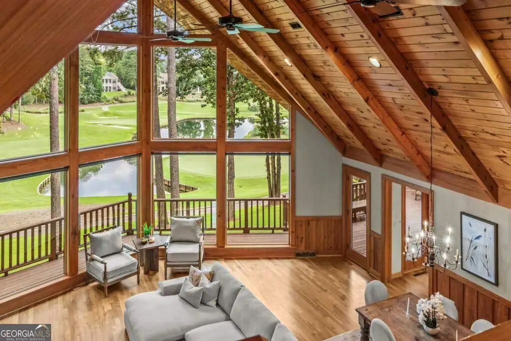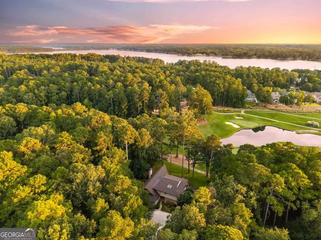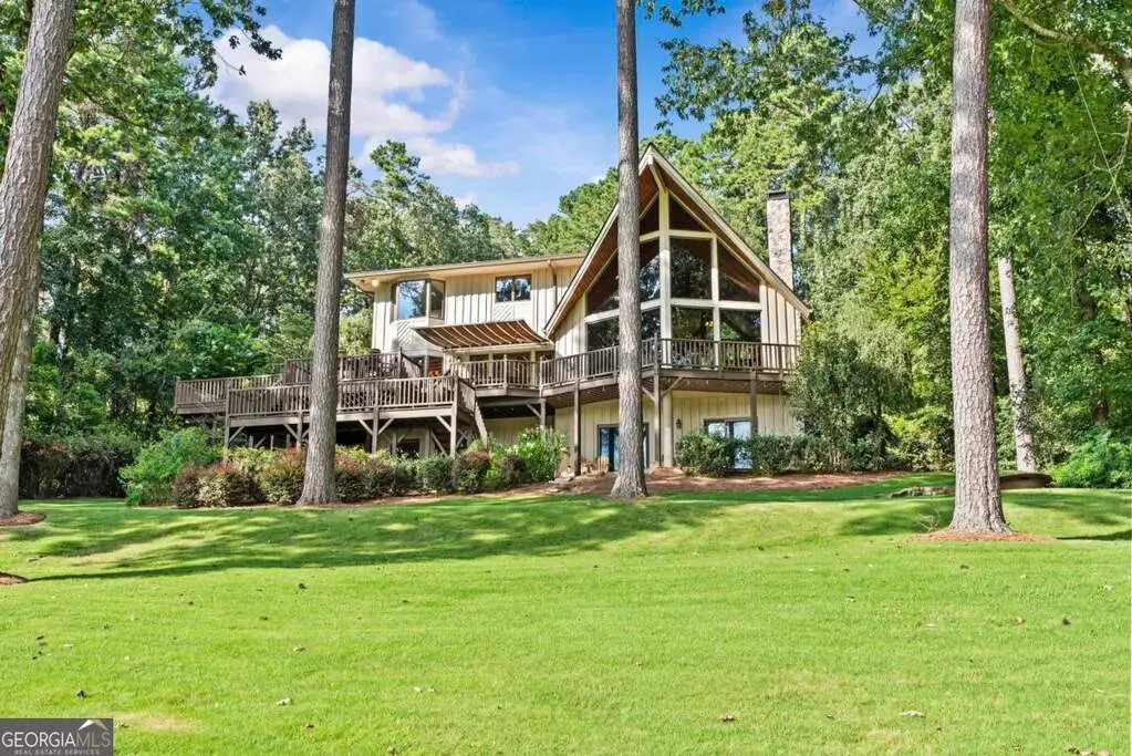 This beautifully maintained golf course home offers sweeping views of holes 2, 3 & 4 of The Landing course, a pond view, and looking down the fairway to the stunning water of Lake Oconee-views from this home are so exquisite, they have been featured in Reynolds Magazine Advertisements over the years. Designed with large, light-filled spaces and walls of windows, the open-concept layout brings the outdoors in. The main level features two bedrooms, a gourmet kitchen, and expansive living and dining areas perfect for entertaining. Enjoy peaceful mornings and breathtaking sunsets from the large multi-level wraparound deck. Ideally situated in The Landing of Reynolds Lake Oconee with access to world-class amenities, golf, lake life, and more. This is a rare opportunity to own one of the best view properties in the community. Seller makes a Club membership available for Buyer to explore how they can enjoy golf, sporting grounds, tennis, pickleball, fitness, recreational, and culinary amenities of a world-class private club.