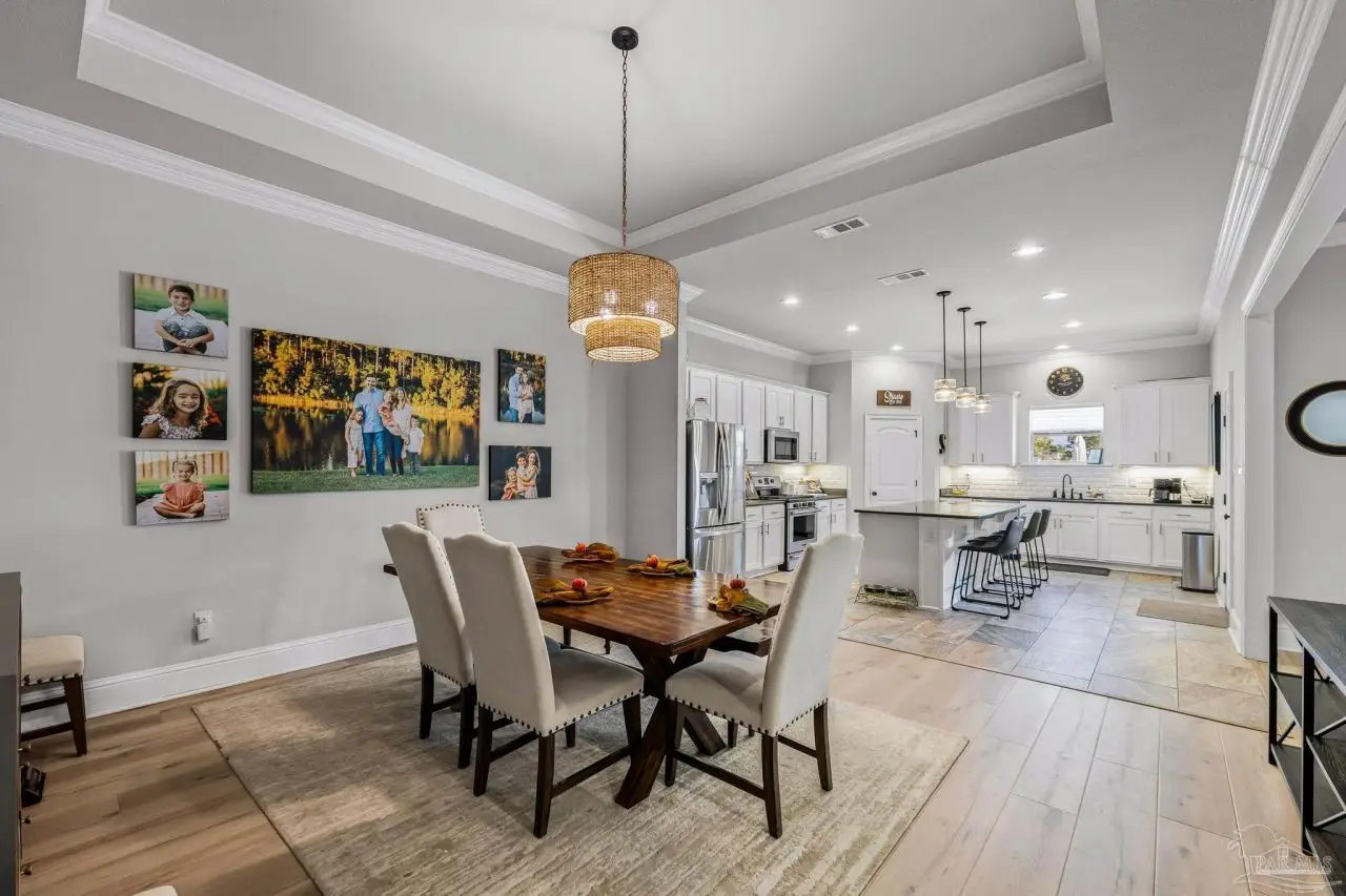Experience refined living in this exceptional 5 bedroom, 4 bathroom residence, thoughtfully designed with both elegance and comfort in mind. Boasting a three car garage and an impressive list of upgrades, this home is truly one of a kind. Inside, you'll find new luxury vinyl plank flooring, crown molding, and striking tray ceilings that enhance the elegance of the living spaces. The gourmet kitchen is a centerpiece, featuring custom cabinetry, quartz countertops, a generous oversized island, premium stainless steel appliances, and a professional grade gas range, perfect for both casual meals and entertaining in style. The primary suite offers a private retreat, complete with a custom tiled shower, indulgent soaking tub, and dual vanities. A second bathroom with a double vanity provides added convenience, while Pfister bronze fixtures lend a timeless sophistication throughout. Designed for both leisure and wellness, the home includes a dedicated gym and an inviting living area anchored by a gas fireplace. Step outside to your own resort style haven-An expansive backyard with a gunite pool featuring ozone filtration, perfect for luxurious relaxation or gatherings with family and friends, and overlooking a serene pond for added tranquility and scenic beauty Additional premium features include a whole-house generator for peace of mind and a private well for the sprinkler system, ensuring year round curb appeal. Situated just minutes from Pensacola and Navarre Beach, and offering an easy commute to fine shopping, the airport, and leading hospitals, this property delivers the best of luxury living and everyday convenience. Don't miss the opportunity to make this exceptional estate your forever home.