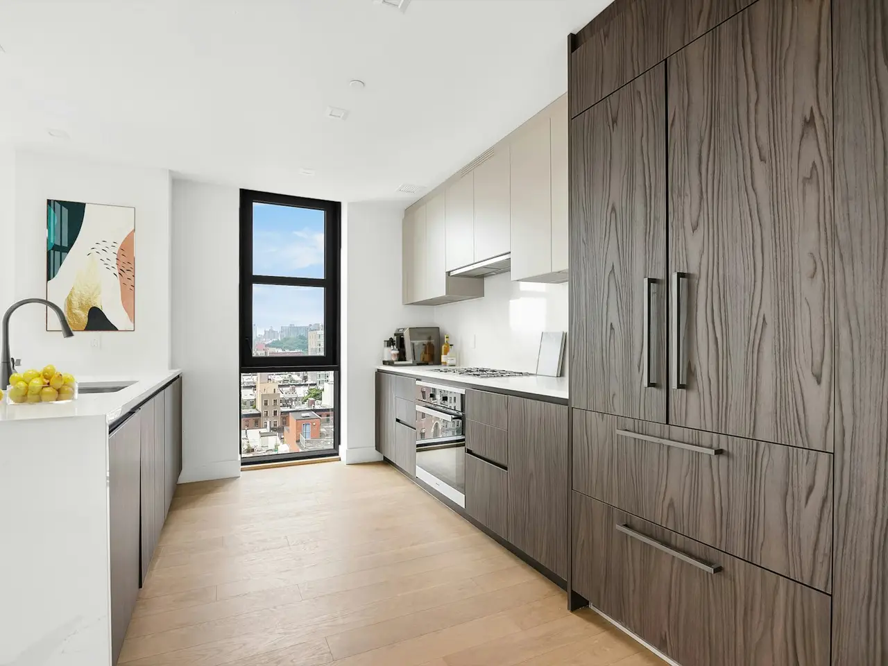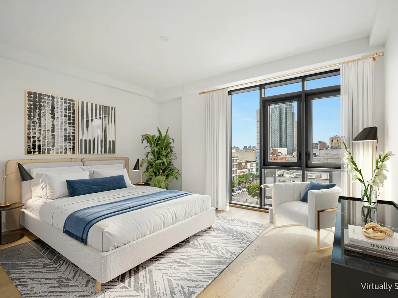 Final Two Homes Remain - Immediate Closings This immaculate south/east facing 7th floor two bedroom two bath boasts an expansive 15 x 22 living room space with giant floor to ceiling windows which allow for maximum light. The luxurious 16 x 10 open chefs kitchen is for kitchen lovers with tons of storage with a large south facing window which bring in the rays of sun and views of midtown and beyond. It is a one of a kind apt that has massive scale rooms to live in and create the space you dream of. There is no limiting spaces here. A smart design for a home. Every surface and fitting at Eleven Hancock was selected for its refined design and matchless quality. Italian crafted kitchens by Cesar were expertly designed in complimentary tones with immaculate attention to detail. A state of the art Miele appliance suite concealed behind handsome millwork while durable Calacatta quartz lines the kitchen's countertop and backsplash. Bathrooms consist of clean, sleek design in a classic white and warm gray palette with feature matte black Kohler fixtures and accessories. The master bathroom includes a glorious rain showerhead, walls lined in large format Calacatta tile and natural stone floor in a herringbone pattern. Eleven Hancock sets the gleaming new standard for condominium living in Harlem. The eye-catching cantilevered design by Isaac and Stern Architects masterfully combines glass, steel and brick into an iconic structure highlighted by horizontal zinc and rust colored bands. Eleven Hancock provides over 6,000 sq. ft. of indoor and outdoor amenities unrivaled by any other address in Harlem. Residents enter into the 24/7 attended lobby via a private garden walkway located along Hancock Place. Additional amenities and conveniences include a high-tech fitness center featuring Peloton bikes, a sizeable children's playroom, rooftop lounge with BBQs, and an exquisitely appointed resident's lounge that connects to the 3,500 sq. ft. landscaped terrace. Eleven Hancock is located in the center of Harlem's vibrant music, arts and culinary scene, just one block from Morningside Park and a few blocks from the legendary Apollo Theater, Columbia University and the bourgeoning Factory District. Eleven Hancock is just three minutes from the 125th Street station where the A, C, B and D subway lines will get you to Midtown in just ten minutes. The complete offering terms are in an offering plan available from Sponsor. CD 18-0393 Sponsor: CVRE 125th Street, LLC, 174 Fifth Avenue, Suite 200, New York, NY 10010. Equal Housing Opportunity.