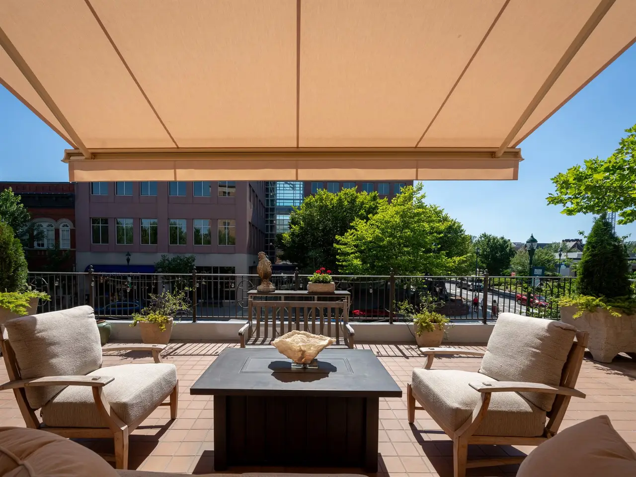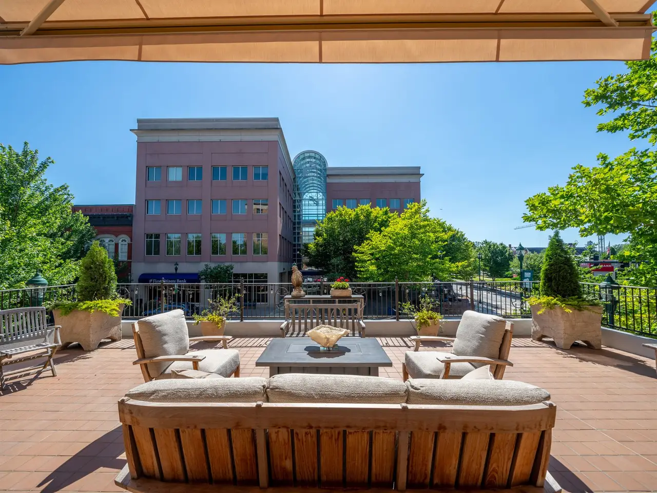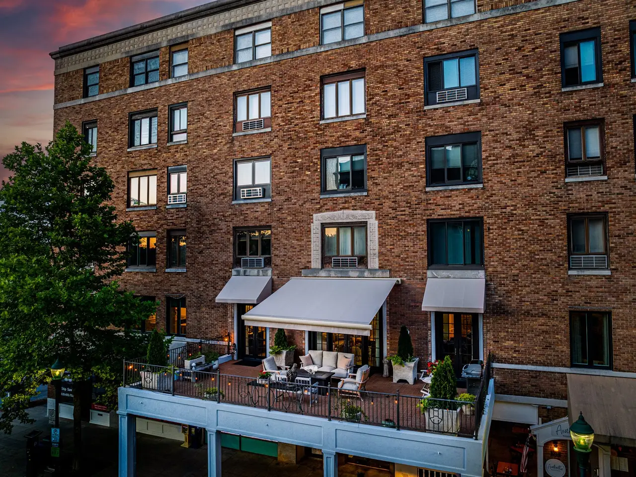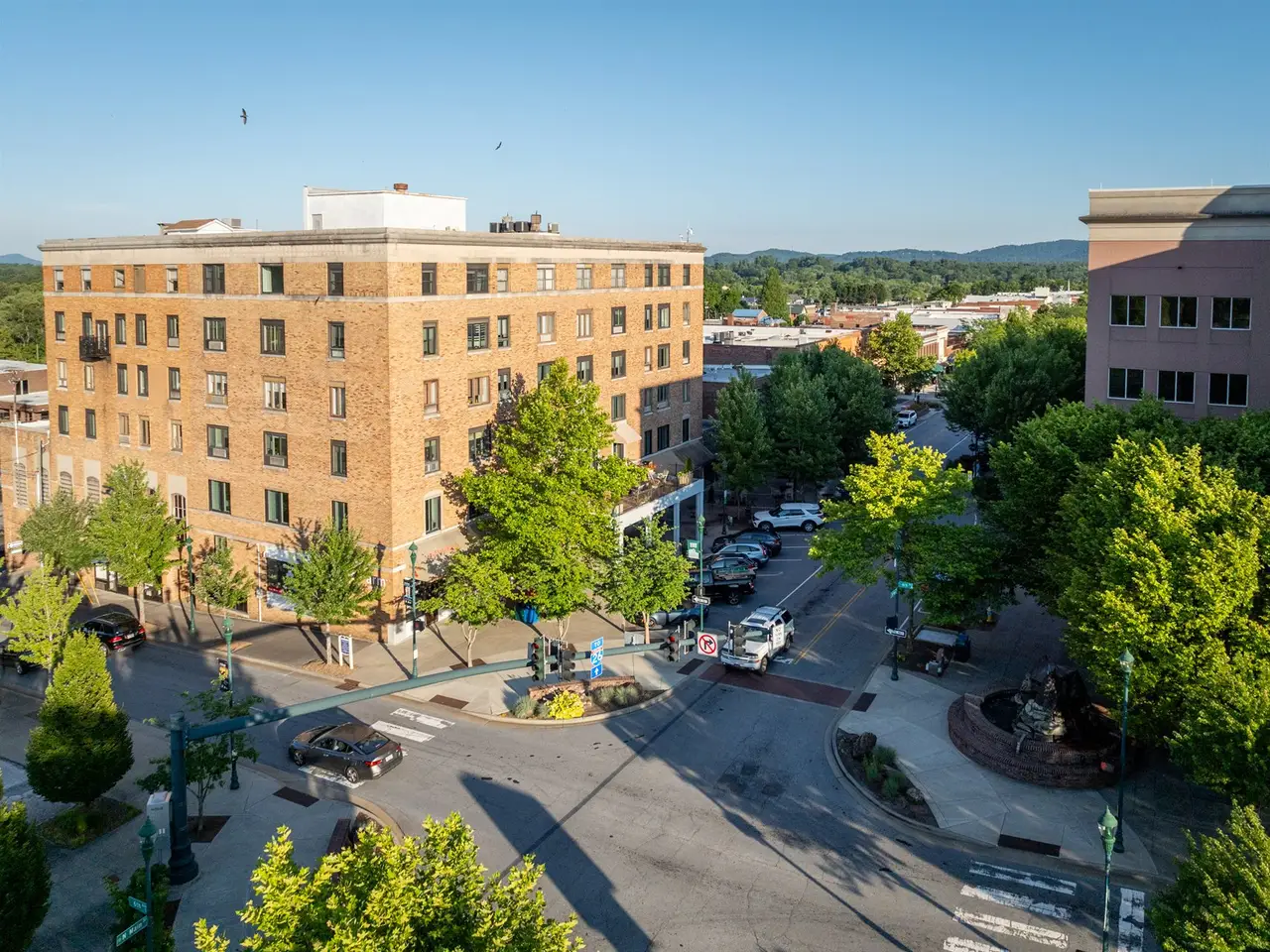 A unique opportunity to own a historic unit in vibrant Downtown Hendersonville once occupied by F. Scott Fitzgerald. Beautifully updated for today's living, the highlight of this home is the sprawling terrace overlooking downtown. Perfect for al fresco dining, entertaining guests, or simply relaxing and taking in the views. The terrace is a true extension of the elegant indoor living space which includes an open living room with fireplace and built-ins, a gracefully renovated kitchen and separate catering kitchen, media room, guest bedrooms and a fabulous primary suite with an impressive primary closet/dressing room. This charming, one-of-a-kind 4,880 SF residence includes two reserved parking spaces and a bonus 198 square foot laundry/utility/storage room steps from the unit. The prime location allows you to enjoy an abundance of restaurants, shops, and activities only available in the mountain town of Hendersonville.