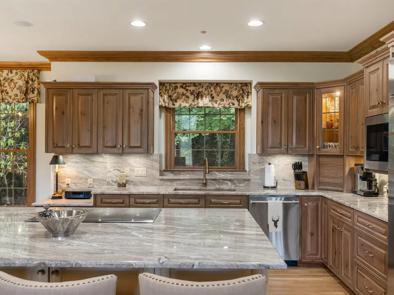 This is the panoramic BIG VIEW! Prepare to be captivated by sweeping, unobstructed views of iconic Whiteside Mountain from this stunning Highlands Falls Falcon Ridge residence, a home so remarkable it has been featured twice in Architectural Digest. Designed with generous proportions and effortless flow, the home offers main-level living with the primary suite conveniently located on the entry level. Architectural details abound, highlighted by custom wormy chestnut and oak features throughout, including an impressive 3? solid wormy chestnut entry door. The primary suite commands breathtaking mountain views and sunrises and boasts a lavish Italian marble bath with soaking tub, oversized shower, dual lighted mirrors, hidden lighted vanity, Kohler fixtures, custom walk-in closets, and a private wet bar with sink and mini-fridge. The open-concept living, dining, and kitchen spaces flow seamlessly onto a screened porch with a fully outfitted grilling station featuring a Blaze grill?an entertainer's dream with Whiteside Mountain as the backdrop. The main level also conveniently includes a guest bedroom, full bath, office/den with custom glass paned wormy chestnut and oak door, and a full laundry room with sink. The lower level provides for guest privacy with a second living area with fireplace, private deck, two spacious en-suite bedrooms, powder room, bonus/flex room with gym/playroom potential, and a secondary laundry area. Recent upgrades are extensive, including a remodeled kitchen, refinished hardwood floors, 27 new windows, new roof, gutters with guards, encapsulated crawlspace, repaved driveway with focal pavers, updated HVAC systems, new water heaters with recirculation pump, blown-in attic insulation, new gas logs in main level fireplace, and view clearing to fully showcase dramatic views of Whiteside Mountain, Wildcat Ridge, and Cullasaja Club beyond. A drainage system beneath the upper deck ensures protection for the lower-level outdoor living area. Peace of mind comes with a 500-gallon fresh water reserve tank and a whole-house generator. A two-car garage with workshop, along with a welcoming exterior accented by a serene water feature, completes this mountain sanctuary. This Highlands Falls home is more than a residence?it is a retreat of timeless architecture, meticulous updates, and awe-inspiring views. Membership to Highlands Falls CC is not mandatory but the amenities are tremendous and the club is vibrant.