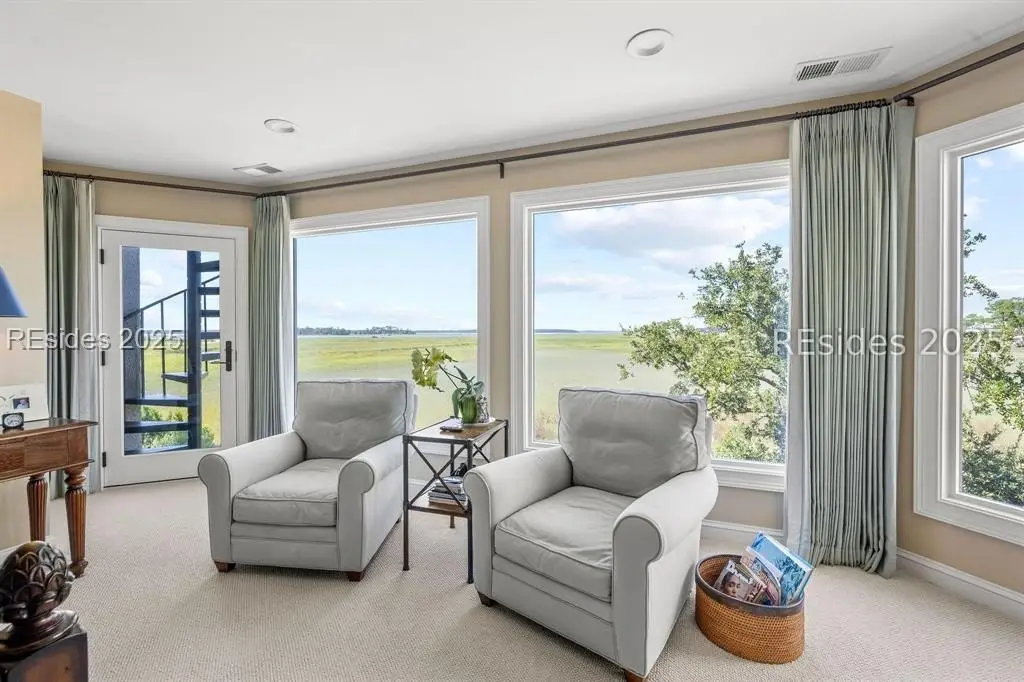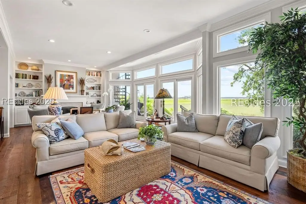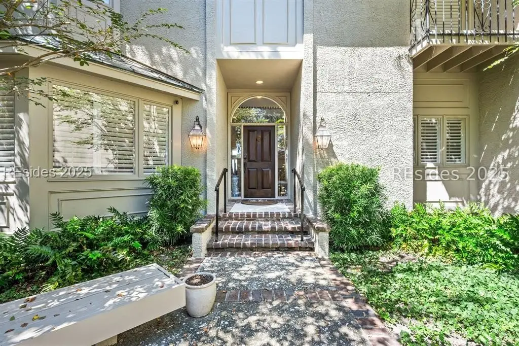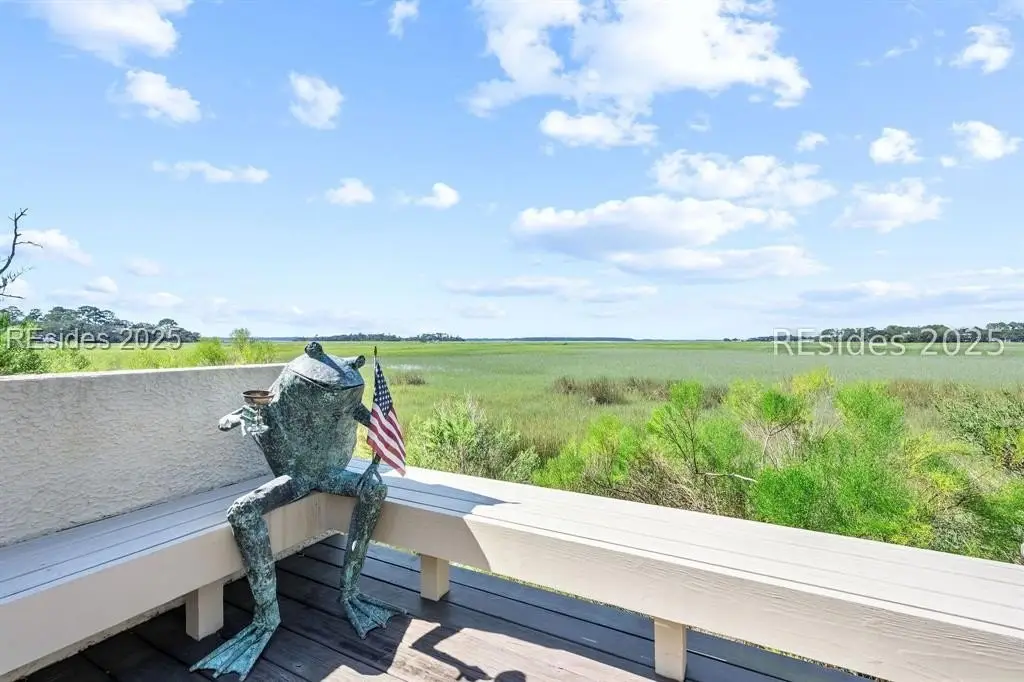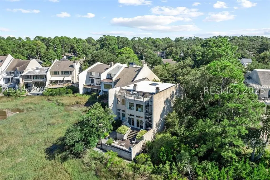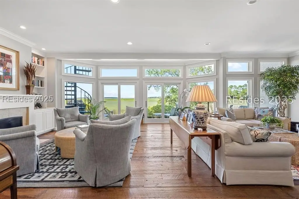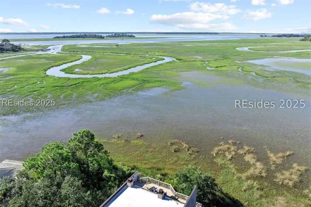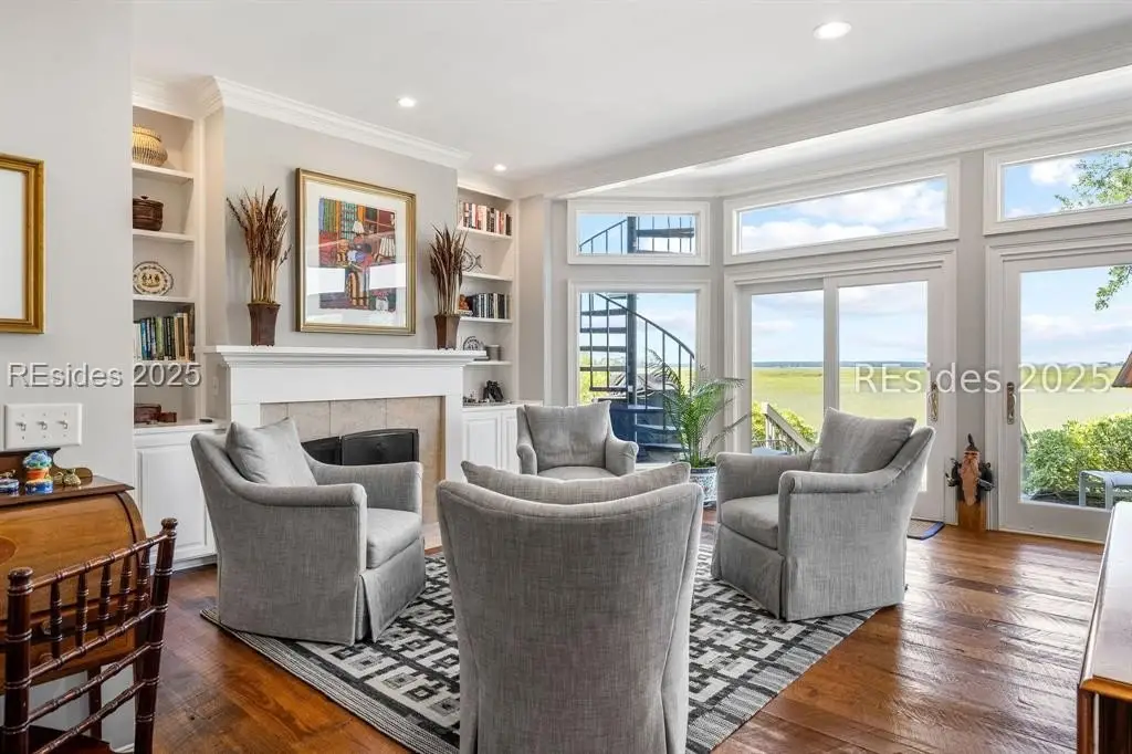 Enjoy breathtaking marsh views and everchanging sunsets from this stunning residence in the private Oyster Landing Club of Sea Pines. This beautifully maintained home blends Lowcountry charm with modern updates. The gated courtyard welcomes you with oyster shell and brick steps while the interior features crown molding, plantation shutters, antique heart pine flooring, & elevator on the first level. The gourmet kitchen boasts custom cabinetry, granite countertops, 2025 Bosch & GE Café appliances and opens to a dining room and spacious great room. The great room offers panoramic marsh views, gas fireplace, built-ins, and a granite dry bar with ice maker. A first-floor office, powder room, and walk-in storage add function and ease. Upstairs includes two guest suites with shared bath, laundry room, and the owners suite with spectacular marsh views, fireplace, massive custom closet, and access to both a private deck and rooftop observation deck. The oversized garage with carport/finished room above offers excellent storage or flex space. Oyster Landing Club is a very special neighborhood offering pool and tennis delivering the ideal Sea Pines lifestyle .