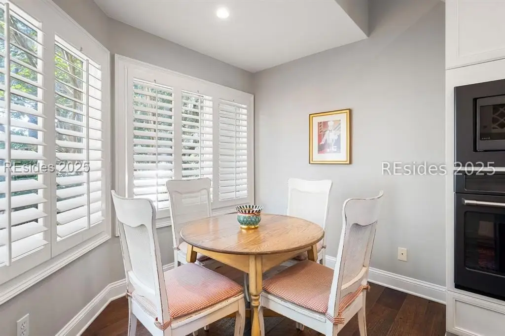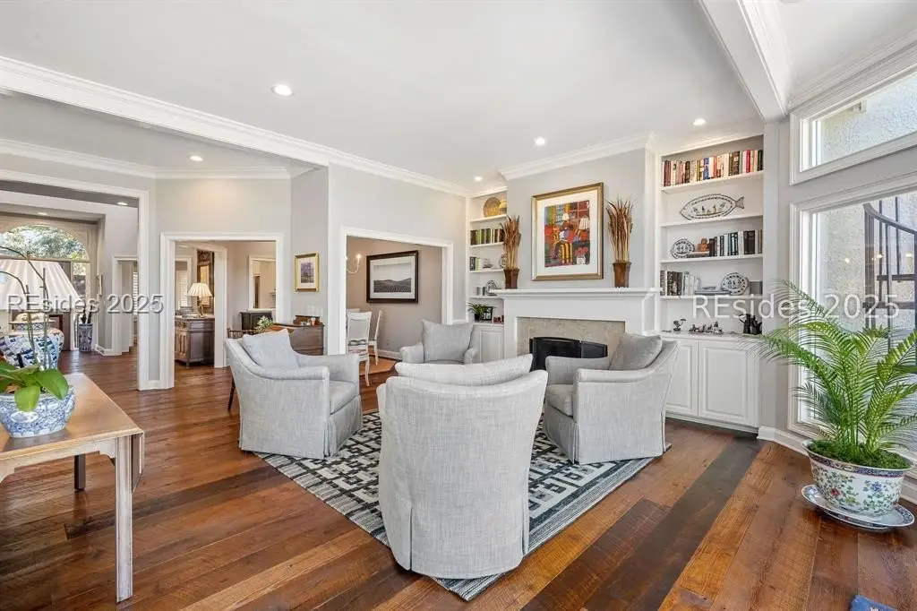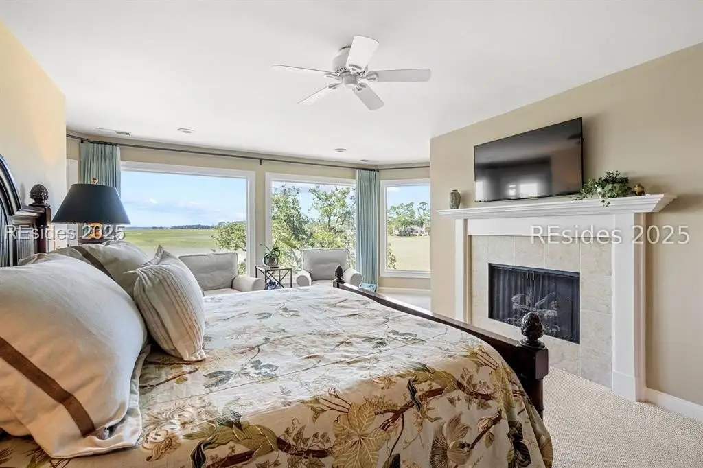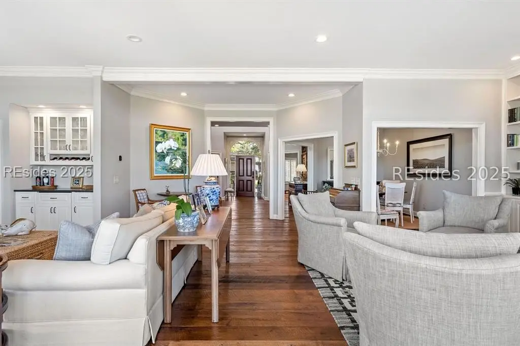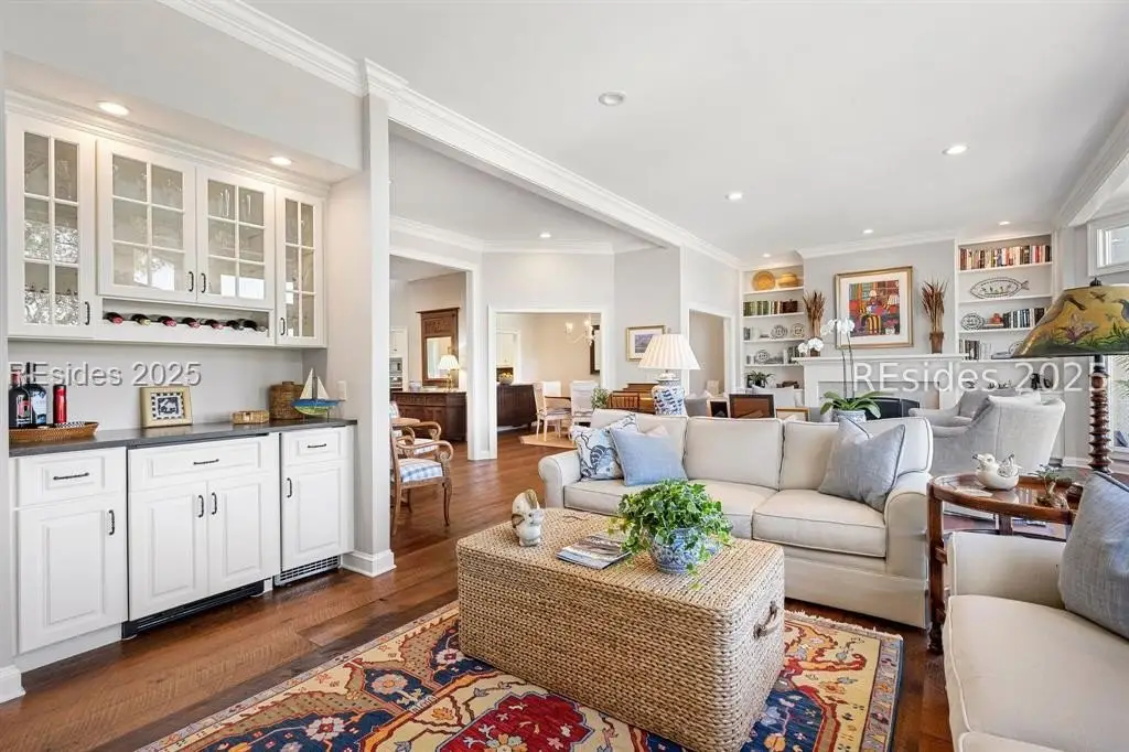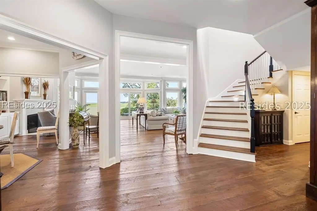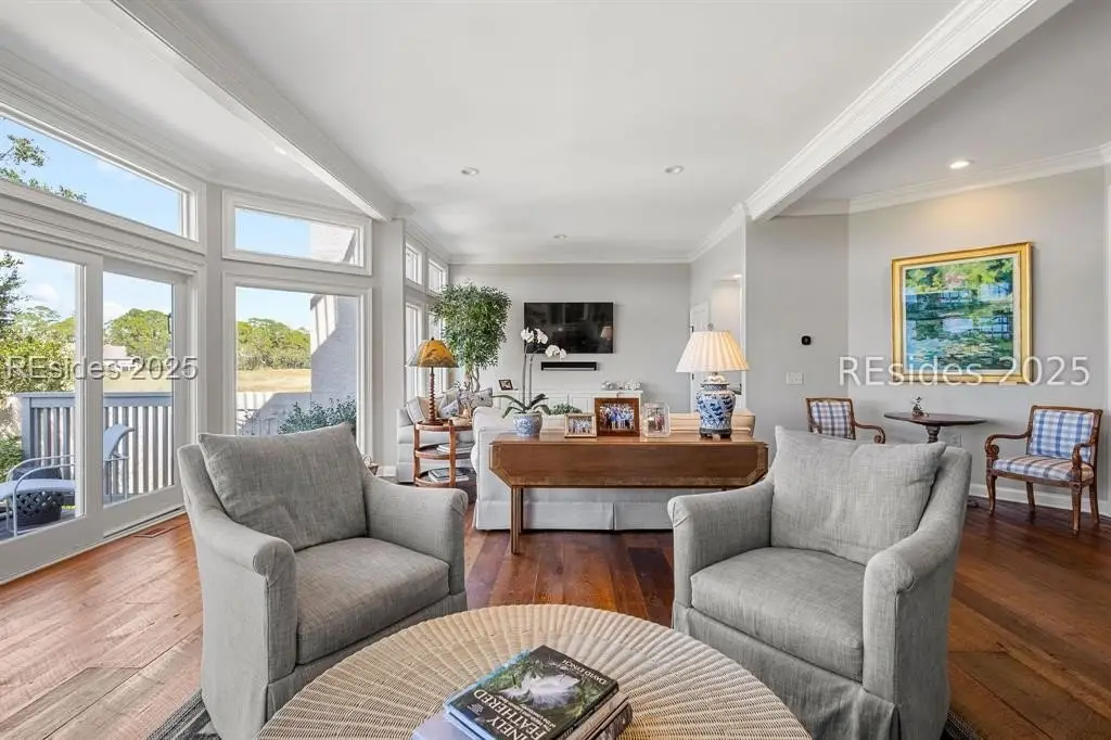 Enjoy breathtaking marsh views and everchanging sunsets from this stunning residence in the private Oyster Landing Club of Sea Pines. This beautifully maintained home blends Lowcountry charm with modern updates. The gated courtyard welcomes you with oyster shell and brick steps while the interior features crown molding, plantation shutters, antique heart pine flooring, & elevator on the first level. The gourmet kitchen boasts custom cabinetry, granite countertops, 2025 Bosch & GE Café appliances and opens to a dining room and spacious great room. The great room offers panoramic marsh views, gas fireplace, built-ins, and a granite dry bar with ice maker. A first-floor office, powder room, and walk-in storage add function and ease. Upstairs includes two guest suites with shared bath, laundry room, and the owners suite with spectacular marsh views, fireplace, massive custom closet, and access to both a private deck and rooftop observation deck. The oversized garage with carport/finished room above offers excellent storage or flex space. Oyster Landing Club is a very special neighborhood offering pool and tennis delivering the ideal Sea Pines lifestyle .