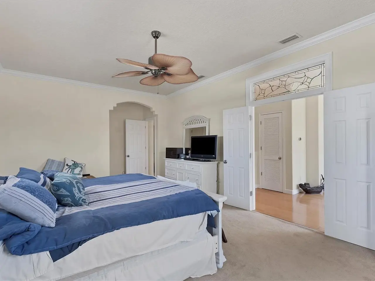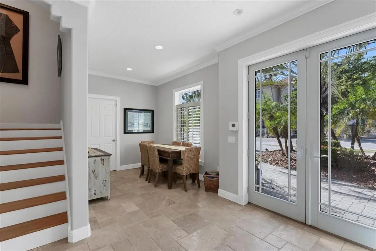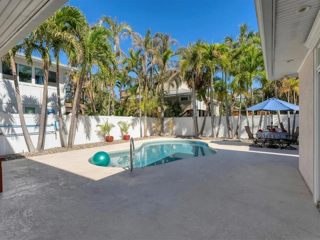 Location, location, location! This beautiful custom home in West Wind Shores is just across the street from the beach and minutes from Anna Maria Island. With an oasis-like backyard and swimming pool, this property offers the ultimate coastal lifestyle. Custom features abound, including high ceilings, arched entryways, travertine flooring, plantation shutters, 5-inch baseboards, recessed lighting, and large walk-in closets. As you enter through the front French doors, you're greeted by a cozy main living area complete with a gas fireplace. To the right, a versatile bonus space awaits, ideal for a dining area or hobby room. The thoughtfully designed split floor plan flows seamlessly, offering two primary bedrooms-one on each floor. The kitchen is a chef's delight, featuring granite countertops, custom cabinetry, newer Bosch appliances, including a Wolf gas stovetop with electric Wolf oven (rare on the island), a breakfast bar with pendant lighting, a glass-tiled backsplash, a wine refrigerator, and elegant travertine flooring. The downstairs primary suite overlooks the pool and offers ample space and luxurious details, including an oversized marble-tiled shower with a glass enclosure, dual sinks, extra storage, and a makeup/dressing table. Upstairs, the second primary suite boasts a large walk-in closet, an ensuite bath, and double doors leading to a loft area with large, picturesque windows that invite you to relax with a book in the afternoon light. The third bedroom is currently being used as an office, complete with built-in bookshelves and a Murphy bed for added flexibility. Sliding glass doors lead to a backyard oasis featuring palm trees, a pergola, a partially covered paver patio, and a completely fenced-in yard. The heated pool and outdoor kitchen, complete with a gas fireplace, create the perfect setting for entertaining. The space is wired for cable, allowing you to enjoy your favorite games while lounging or barbecuing. For pet lovers, there is a separate fenced area and a convenient storage shed. This custom home combines luxury, comfort, and an unbeatable location near the beach and Anna Maria Island. Convenient and complimentary trolley across the street. Walk across the street for sunset every night on the other side of a tall building complex. Don't miss your chance to own this coastal retreat