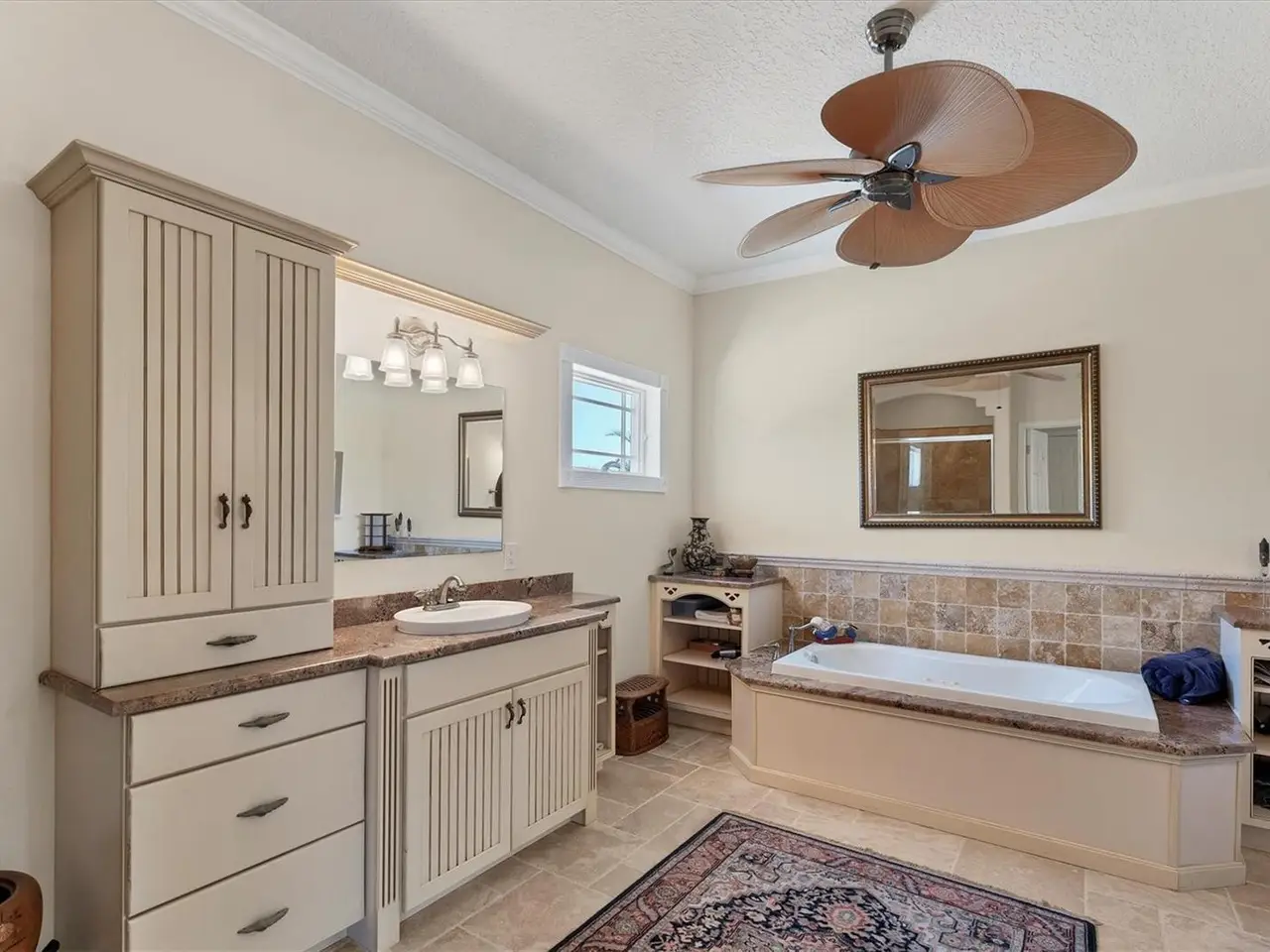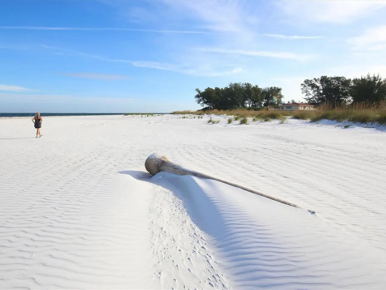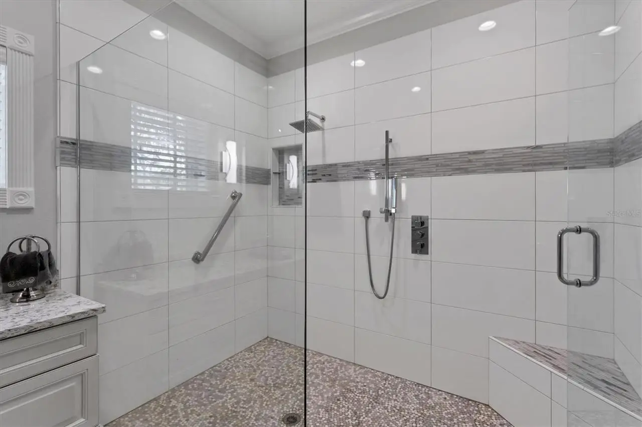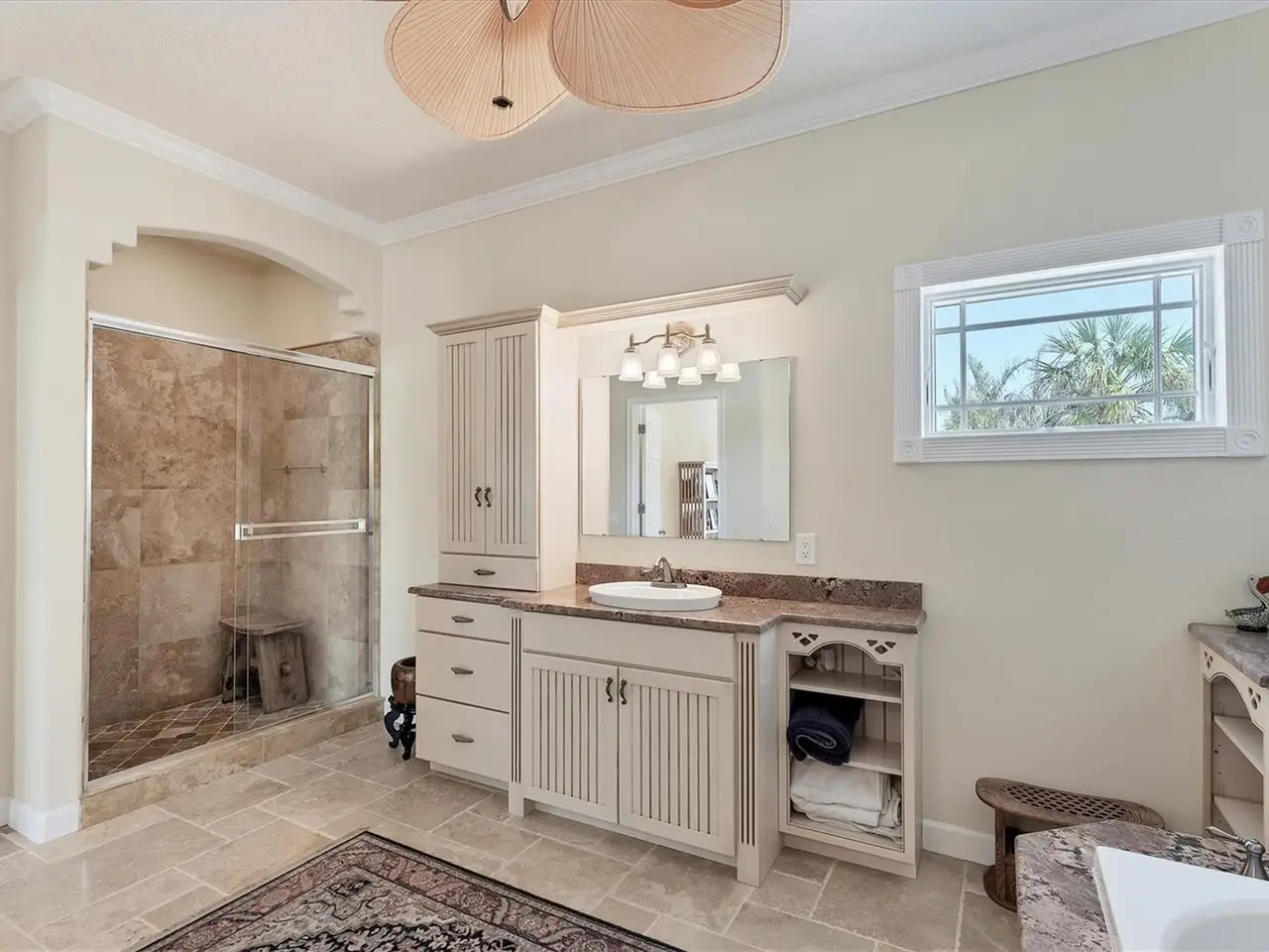 Location, location, location! This beautiful custom home in West Wind Shores is just across the street from the beach and minutes from Anna Maria Island. With an oasis-like backyard and swimming pool, this property offers the ultimate coastal lifestyle. Custom features abound, including high ceilings, arched entryways, travertine flooring, plantation shutters, 5-inch baseboards, recessed lighting, and large walk-in closets. As you enter through the front French doors, you're greeted by a cozy main living area complete with a gas fireplace. To the right, a versatile bonus space awaits, ideal for a dining area or hobby room. The thoughtfully designed split floor plan flows seamlessly, offering two primary bedrooms-one on each floor. The kitchen is a chef's delight, featuring granite countertops, custom cabinetry, newer Bosch appliances, including a Wolf gas stovetop with electric Wolf oven (rare on the island), a breakfast bar with pendant lighting, a glass-tiled backsplash, a wine refrigerator, and elegant travertine flooring. The downstairs primary suite overlooks the pool and offers ample space and luxurious details, including an oversized marble-tiled shower with a glass enclosure, dual sinks, extra storage, and a makeup/dressing table. Upstairs, the second primary suite boasts a large walk-in closet, an ensuite bath, and double doors leading to a loft area with large, picturesque windows that invite you to relax with a book in the afternoon light. The third bedroom is currently being used as an office, complete with built-in bookshelves and a Murphy bed for added flexibility. Sliding glass doors lead to a backyard oasis featuring palm trees, a pergola, a partially covered paver patio, and a completely fenced-in yard. The heated pool and outdoor kitchen, complete with a gas fireplace, create the perfect setting for entertaining. The space is wired for cable, allowing you to enjoy your favorite games while lounging or barbecuing. For pet lovers, there is a separate fenced area and a convenient storage shed. This custom home combines luxury, comfort, and an unbeatable location near the beach and Anna Maria Island. Convenient and complimentary trolley across the street. Walk across the street for sunset every night on the other side of a tall building complex. Don't miss your chance to own this coastal retreat