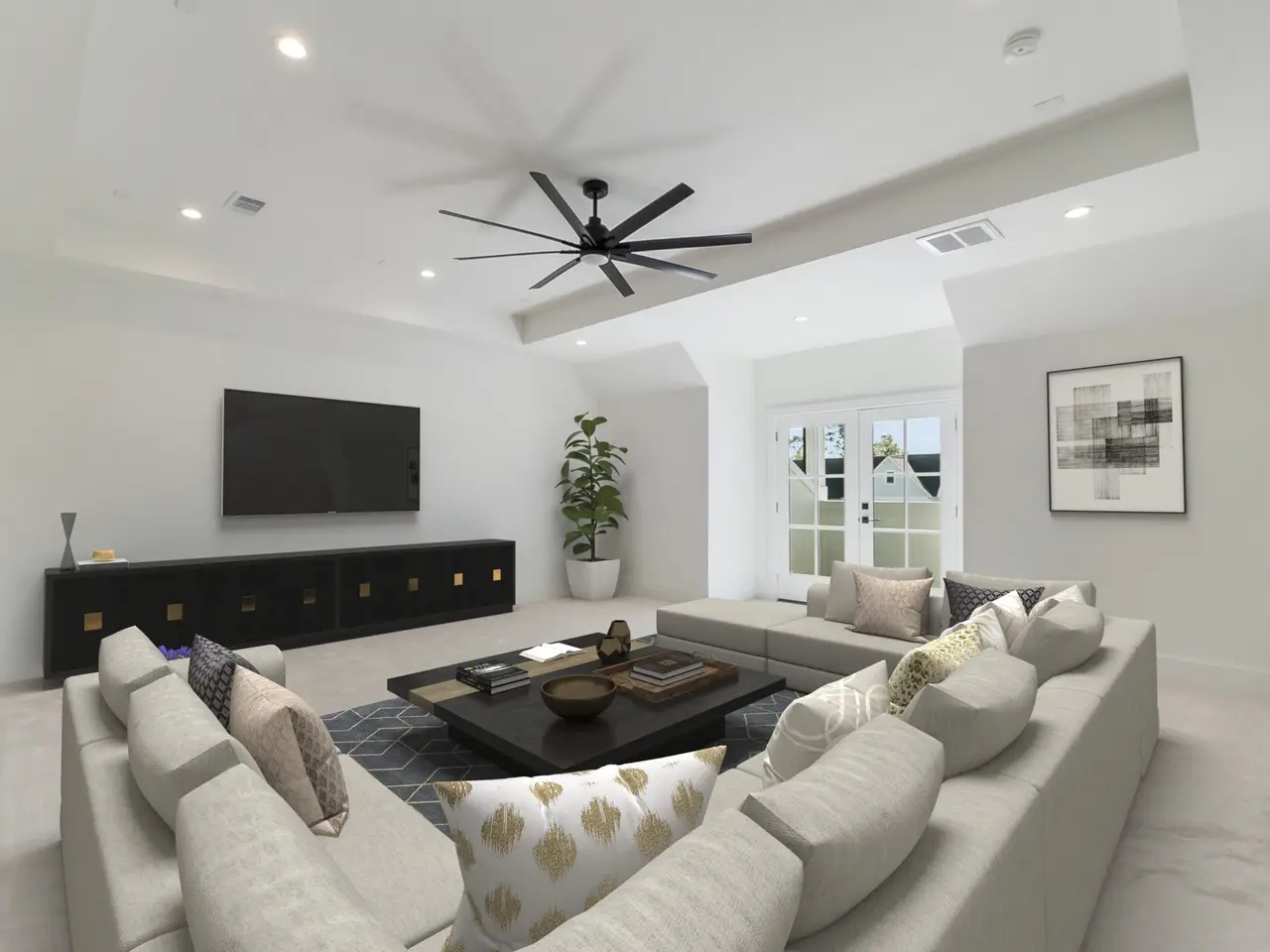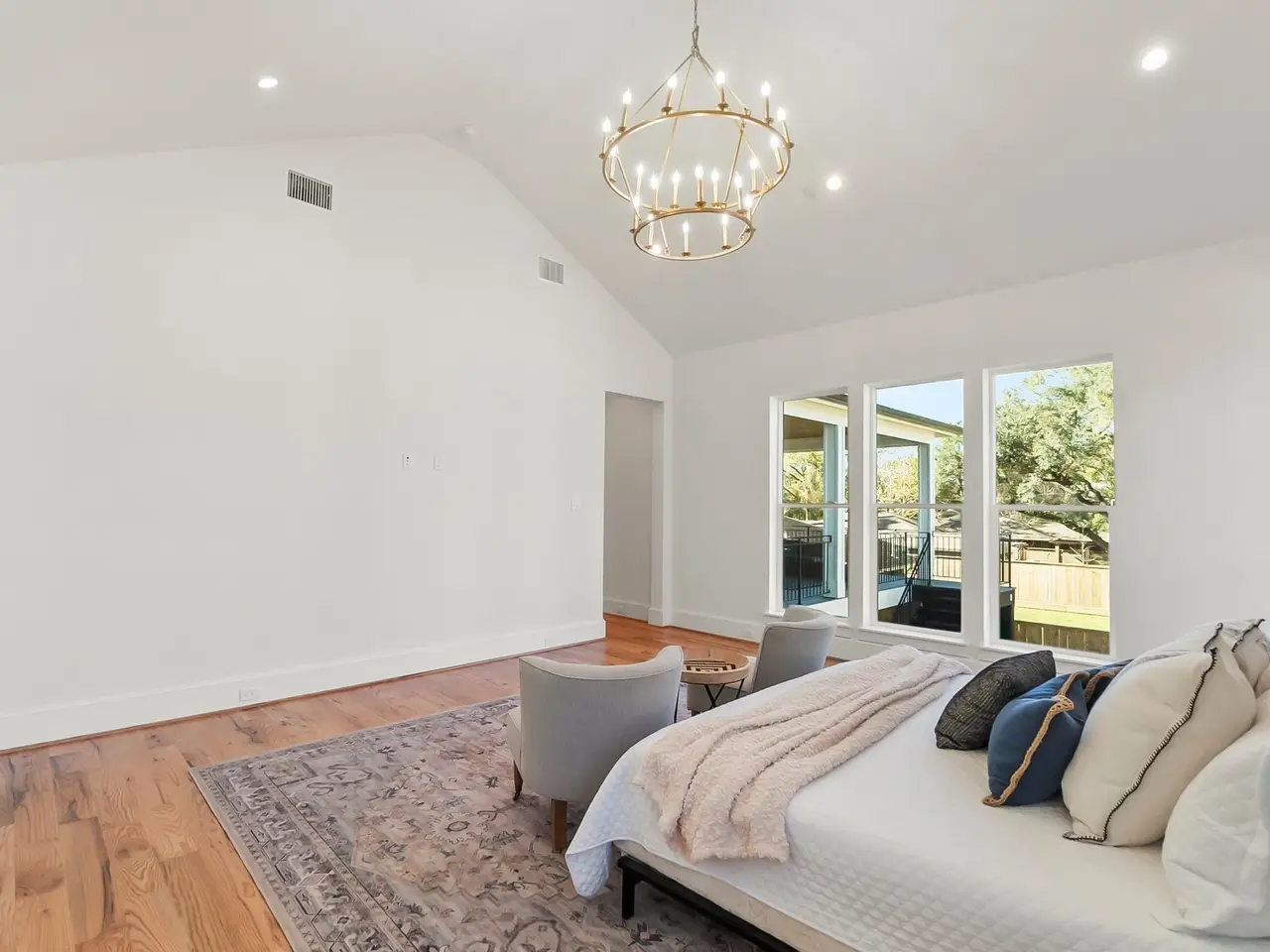 Nestled in Houston’s prestigious Timbergrove Manor, this luxurious 4,418 sq. ft. new construction blends elegance, comfort, and functionality. Featuring 6 bedrooms, 4.5 baths, a private study, and a formal dining room, the home is filled with natural light and thoughtful design. The main floor offers a stunning primary suite with 15' vaulted ceilings and a spacious guest suite with a full en-suite bath. The chef’s kitchen boasts an 8x4 island, black luxury appliances, soft-close cabinetry, butler’s pantry, and ample storage. The great room opens to a massive covered patio through sliding glass doors. Upstairs includes 4 bedrooms, 2 baths (including a Jack & Jill), and a private balcony. A 1,500 sq. ft. finished ground-level flex space with LED lighting offers endless possibilities. 2-car garage connects to the covered area below. Gutters with French drains. Near trails, parks, shops, and restaurants.