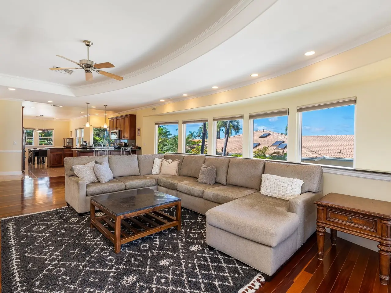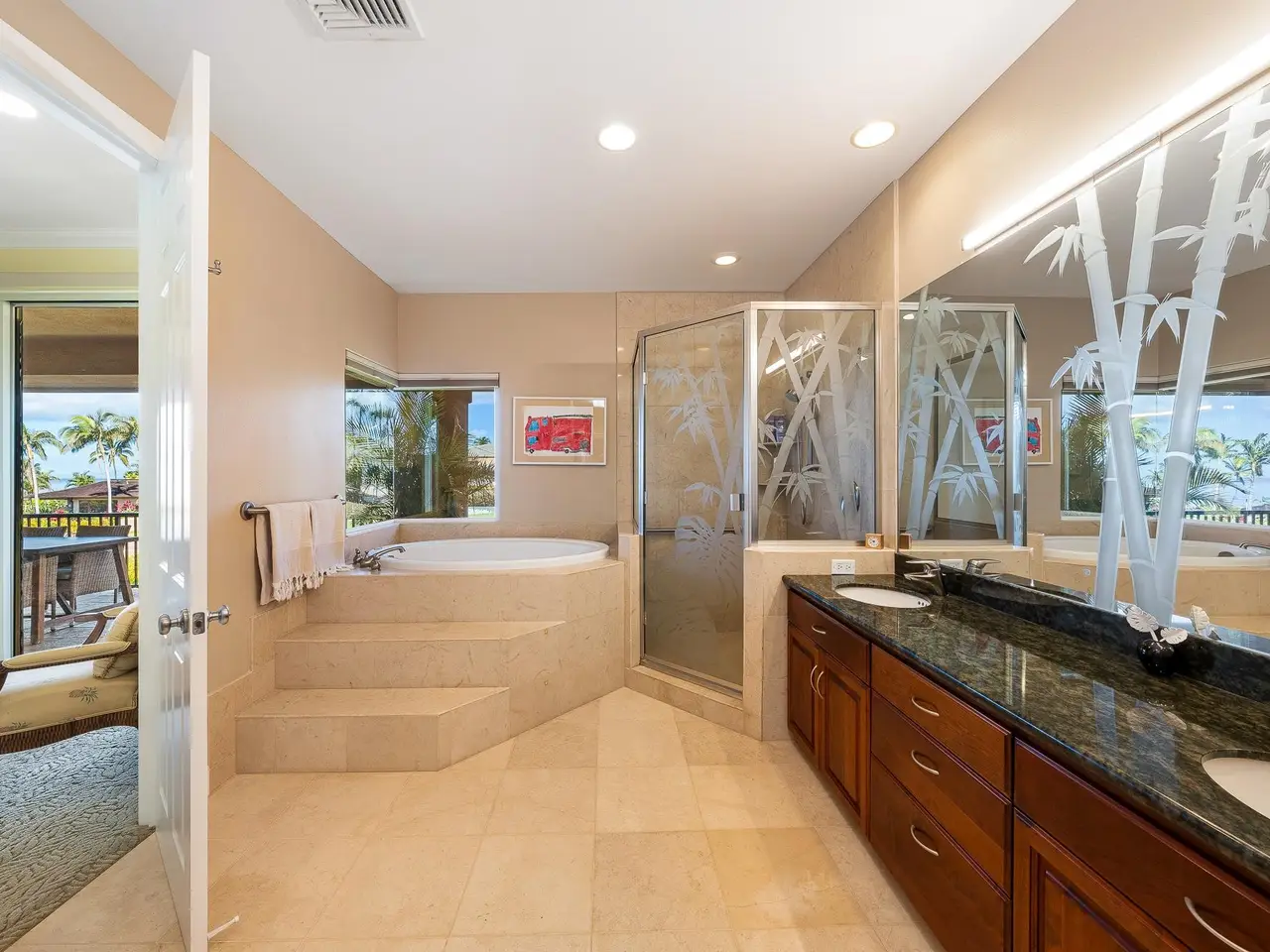 Located at the end of a peaceful cul-de-sac and bordering a lush greenbelt, this exceptionally designed 4 bedroom, 2.5 bathroom home in the prestigious Wailea Kialoa community offers privacy and ocean, sunset, and neighbor island views. The split-level layout provides effortless living with the main level featuring a gourmet chef’s kitchen, a formal dining room, a spacious living area, a luxurious primary suite, a bedroom that serves well as a private office, a powder room, and an attached garage—all designed for comfort and style. The lower level is an entertainer’s dream, with a large den that includes a wet bar, under-counter fridge, wine fridge, and easy access to the pool deck, BBQ area, and a serene private backyard. Luxuriously appointed throughout, the home showcases crème Vienna limestone and burled eucalyptus flooring, rare green granite countertops, and custom cherry cabinetry, highlighting the attention to detail and quality craftsmanship. A laundry room and ample storage areas add to the convenience of this warm and inviting home. The garage is equipped to store your golf clubs, surfboards, and recreational gear, ensuring you are always ready for Maui’s outdoor adventures. Both a PV solar system and a solar water system are in place, thereby reducing the ecological footprint of the property, while the private backyard offers ample space for a garden, creating a perfect blend of luxury and sustainability.