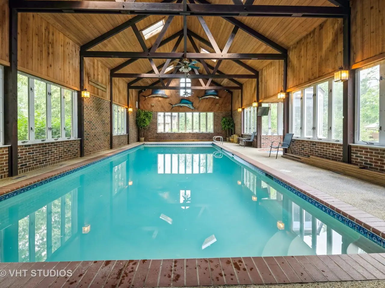 Staycation never got better! Spacious Tudor home with 6 bedrooms, 4.1 baths plus a bonus room over the garage including pinball machines pool table and jute box. All the bedrooms have ceiling fans. The 6th bedroom is on the main floor with it own bath and shower. Could be an office as well. Step into an incredible enclosed indoor addition with heated pool. 7.6 feet at the deep. Soaring cedar planked ceilings, hot tub and big screen TV. separate bath and shower. Plus a workout room with walkout to a covered patio. 3 car garage. New roof and gutter and recently painted. Exterior trim and cedar stained. Interior has new rich upgraded waterproof vinyl planked floor on the entire first floor for easy care. Beautiful walnut kitchen cabinets with new quartz counter and recessed lighting. New double convention oven and gas five burner cooktop. New dishwasher, and 2 year old refrigerator. The family room opens to the kitchen with gas start fireplace and full wet bar. The entire interior is recently painted. Baths upgraded with modern tiles. 3 zoned heating 2 years old. Pool room has it own furnace and heat pump for the pool and hot tub. Basement has a half bath, freshly painted with table tennis and game watching area. additional features include a gas generator and upgraded 200 amp electric service. Wonderful yard with cedar deck and patio over looking raised gardens. If you love an active lifestyle, makes plans to see this home! Great schools and Bishop Ridge neighborhood is welcoming!