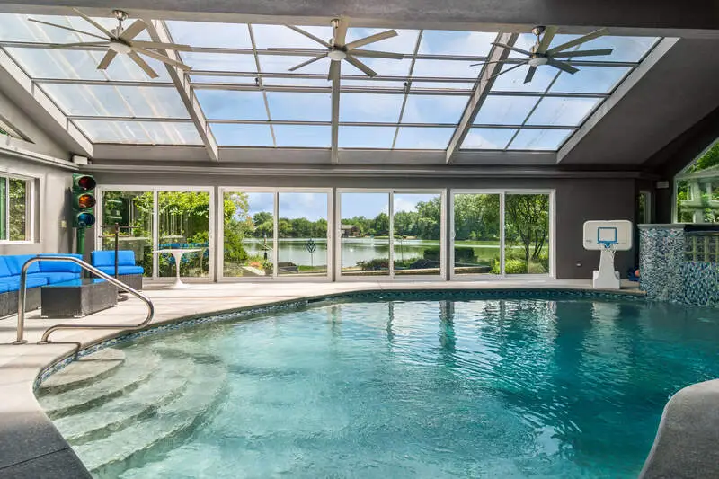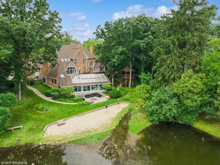 An extraordinary retreat on Bishop's Lake in Kildeer, this 5.5-acre estate blends rugged nature with sophisticated luxury. Just minutes from downtown yet worlds away in serenity, it offers sweeping lake views, mature trees, and a private resort lifestyle. Inside, the home stuns with a grand stairwell accented by a 20-foot stone waterfall, custom millwork throughout, and four fireplaces that create warmth and character in every season. The dramatic great room features soaring ceilings and walls of glass that frame ever-changing lake vistas and flood the space with natural light. At its center is a true highlight-an extraordinary $300K walnut kitchen, showcased on HGTV's "I Want That." Recently enhanced with new quartz counters and top-tier stainless appliances, it blends striking design with everyday functionality. Resort-style amenities extend beyond the walls: a treehouse-style gazebo, private beach with lake access for swimming and kayaking, and a year-round indoor pool/ hot tub with a waterfall that feels like a world-class spa. Wildlife is part of the daily rhythm here-swans gliding across the water, deer along the treeline, egrets soaring overhead, and excellent fishing right from your shoreline. Whether entertaining by the lake, enjoying quiet mornings on the beach, or relaxing fireside after a swim, this estate delivers a rare balance of natural beauty and sophisticated design in one of Kildeer's most coveted settings. Completing the picture is a massive three-car garage, featuring one oversized stall with a 10'10" door and nearly 30' deep- perfect for housing an RV, boat, or car rack.