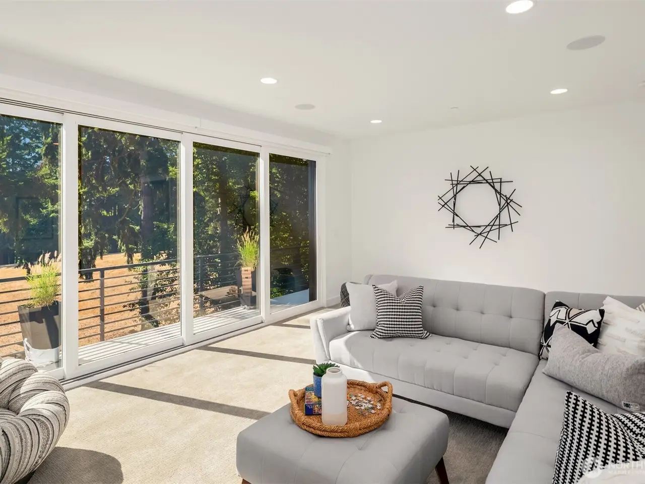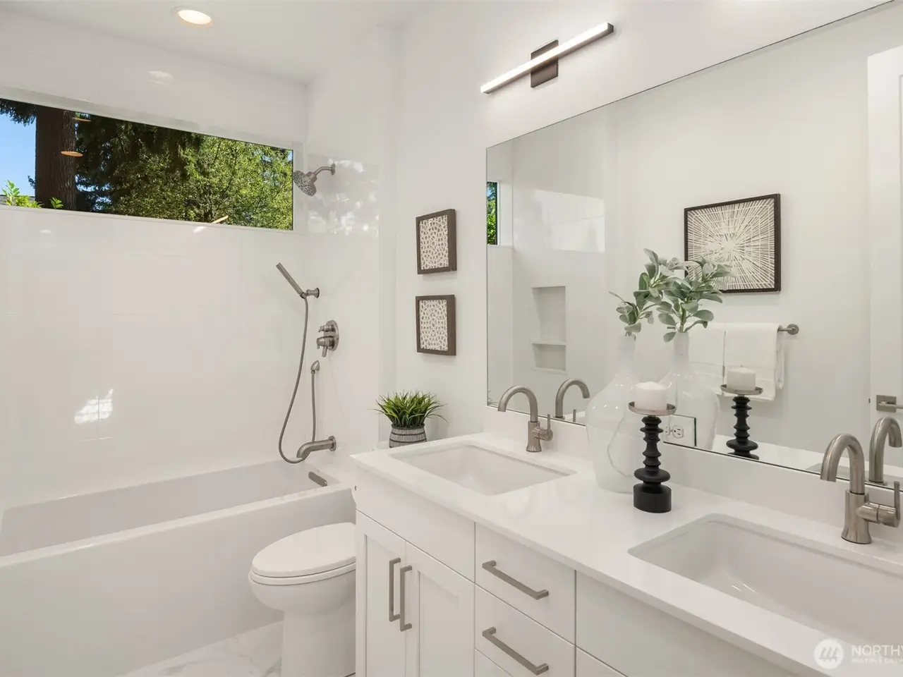 Design-forward like-new construction in desirable Highlands. Ideal cul-de-sac location overlooking expansive neighborhood park. Statement entry accentuated by dramatic two-story windows, showpiece lighting and floating staircase. Chef’s dream kitchen crafted for style and functionality with two dishwashers, premium appliances, pantry, appliance garage and built-in buffet. Great room w/sliding glass wall opens to covered deck and park views. Luxurious primary suite and spa-inspired bath with balcony, modern soaking tub, shower for two and custom closet. Spacious bonus room with deck and adjacent wet bar. Many app-controlled features from lighting to blinds, sound system and more. Enjoy serene sunsets, Kirkland’s best schools. Close to waterfront, dining, boutiques and more!