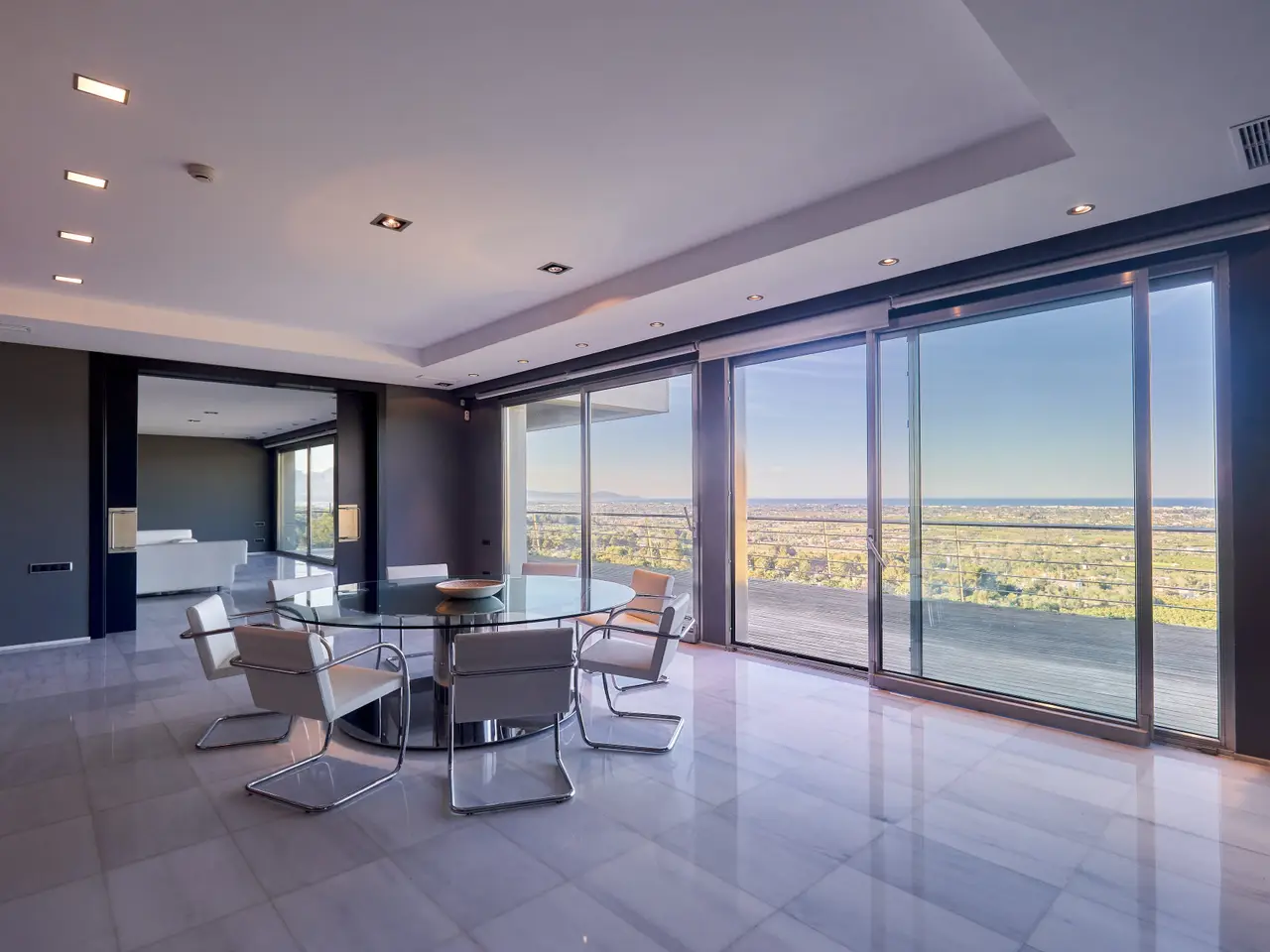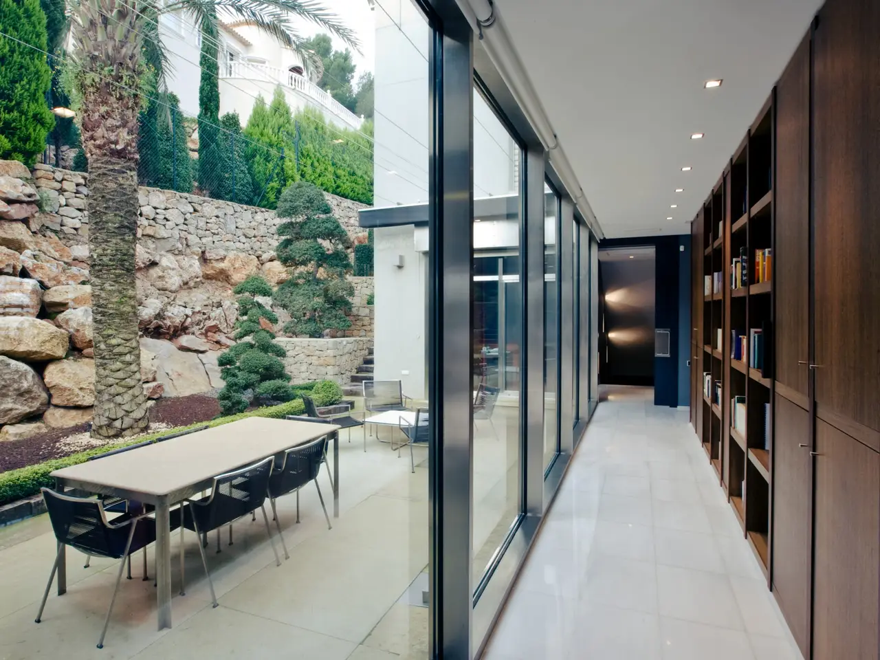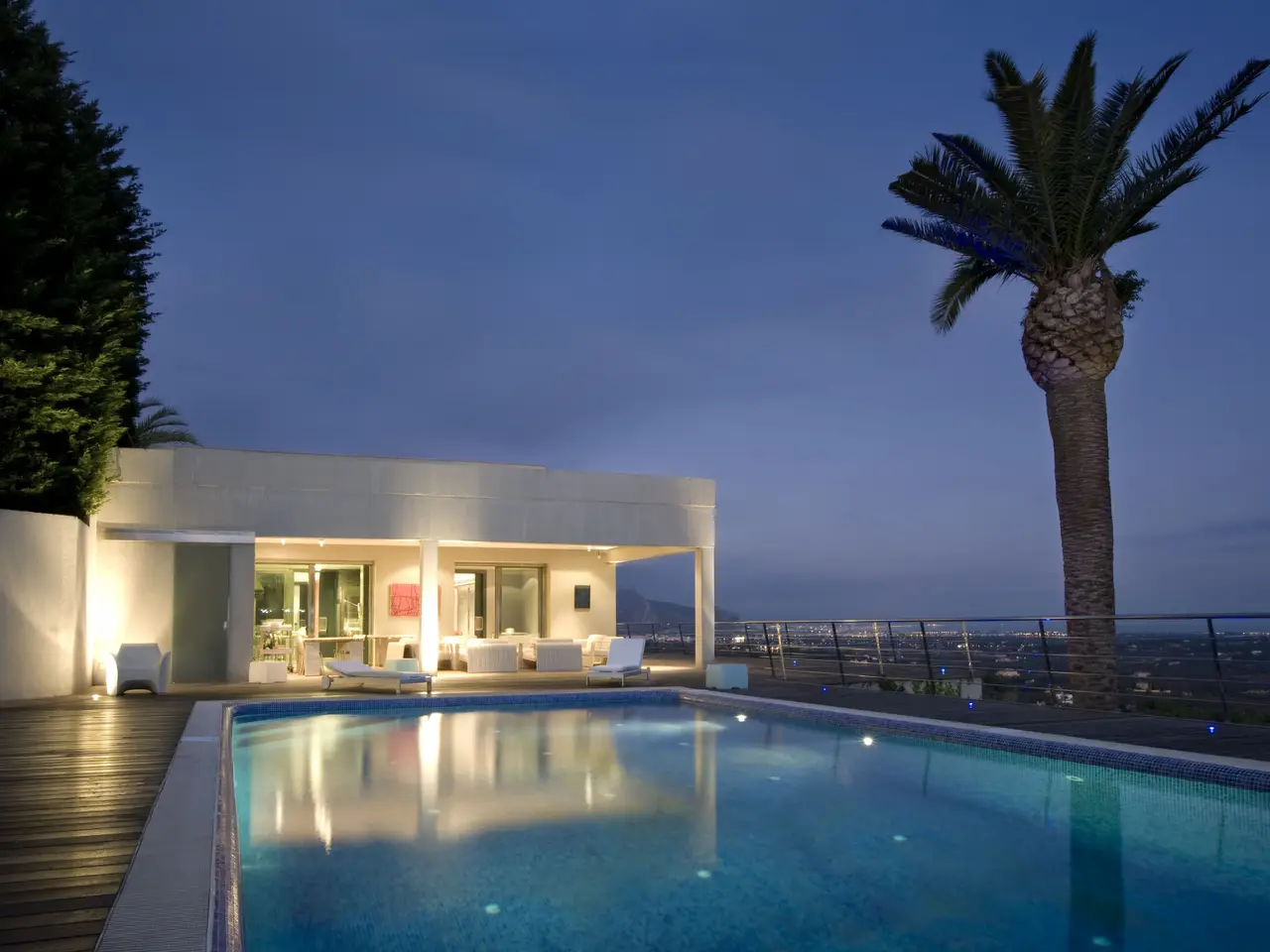Extraordinary villa located in a very private area in the heart of the luxurious Golf La Sella and Hotel La Sella with impressive panoramic views of the Montgó mountain, the 27-hole golf course and the city of Denia and the sea. It is an exceptional property offering a cutting-edge design where straight lines predominate and large glazed doors and floor-to-ceiling windows create a cosy and bright atmosphere. The villa is set on a plot of 3,250m2 and it has a surface of 1,146m2 distributed over three floors. The ground floor gives access to the house via an impressive automatic and treated wooden door which leads to the hall and the lift that connects all the floors. On the right wing there is the guest area and the staff accommodation consisting of three double bedrooms, three en-suite bathrooms and an equipped kitchen. The first floor is home to the main rooms of the property: the large lounge with large windows offering views of the golf, the mountains and the sea. There is also a dining room, a sitting room with access to a partially covered terrace and the kitchen. All lounges have access to the terrace and the front balcony. The kitchen is equipped with the latest technology and has access to a landscaped terrace on the back. Next to this terrace, you will find a glazed library which connects with a spacious office and a guest toilet. The main bedroom enjoys spaciousness and is distributed into a rest area, two dressing areas, marble bathroom with two independent toilets, shower and whirlpool, plus two lounges annex to the bedroom which can be used as a reading room or tv room and a terrace. On the left wing, you will find a large garage with capacity for five vehicles, large temperature-controlled wine cellar, gym and changing rooms with shower. In addition, there are two storage rooms, laundry room and machine room. The illuminated pool with a self-cleaning system is surrounded by a teak deck. Next to it, there is the barbecue area and a private outdoor shower. The plot enjoys privacy and is completely fenced and equipped with surveillance system and a perimeter alarm. The garden is embellished with a great variety of vegetation such as kermes oak, walnut trees, orange and lemon trees, as well as aromatic plants and chill-out areas. Comfort and security for residents is guaranteed as it is equipped with air conditioning and underfloor heating, alarm system, CCTV video surveillance, automatic entrance doors, electric blinds, aluminium windows with safety glass, marble and wooden flooring, music system and lightening in terraces, access and gardens.
