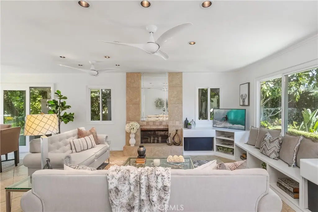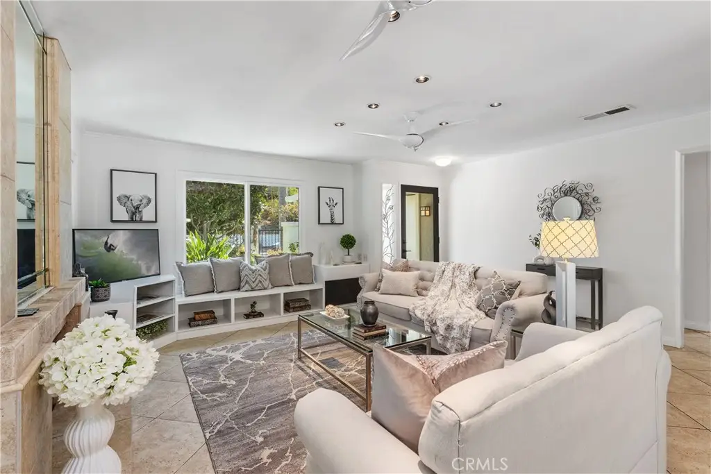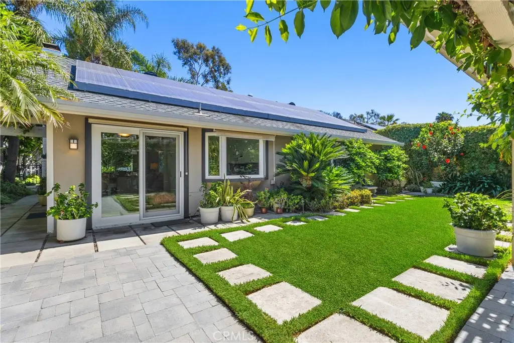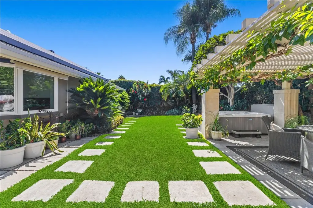 Welcome to your private Laguna Hills oasis--a beautifully maintained, single-level home surrounded by mature tropical landscaping that exudes serenity and privacy. A gated entry leads to a charming courtyard with stone walkways, while custom concrete pavers extend throughout the front and back yards, creating seamless, elegant outdoor spaces. Designed for both relaxation and entertaining, the backyard features a soothing hot tub, a BBQ area, covered dining and sitting spaces, and a fire pit seating area, all set amid lush, tropical greenery. Inside, dual-pane windows and recessed lighting throughout fill the home with light, while a living room fireplace adds warmth and charm. The kitchen boasts a bay window overlooking the backyard, stone countertops, and a built-in wine fridge, blending style and functionality. Freshly painted and professionally cleaned, this home is move-in ready. The 2-car garage provides abundant, easily accessible storage, and the entire property offers unmatched privacy in a peaceful neighborhood. With thoughtful design, luxurious finishes, and an effortless indoor-outdoor lifestyle, this residence is a true sanctuary for comfort, entertaining, and everyday living.
