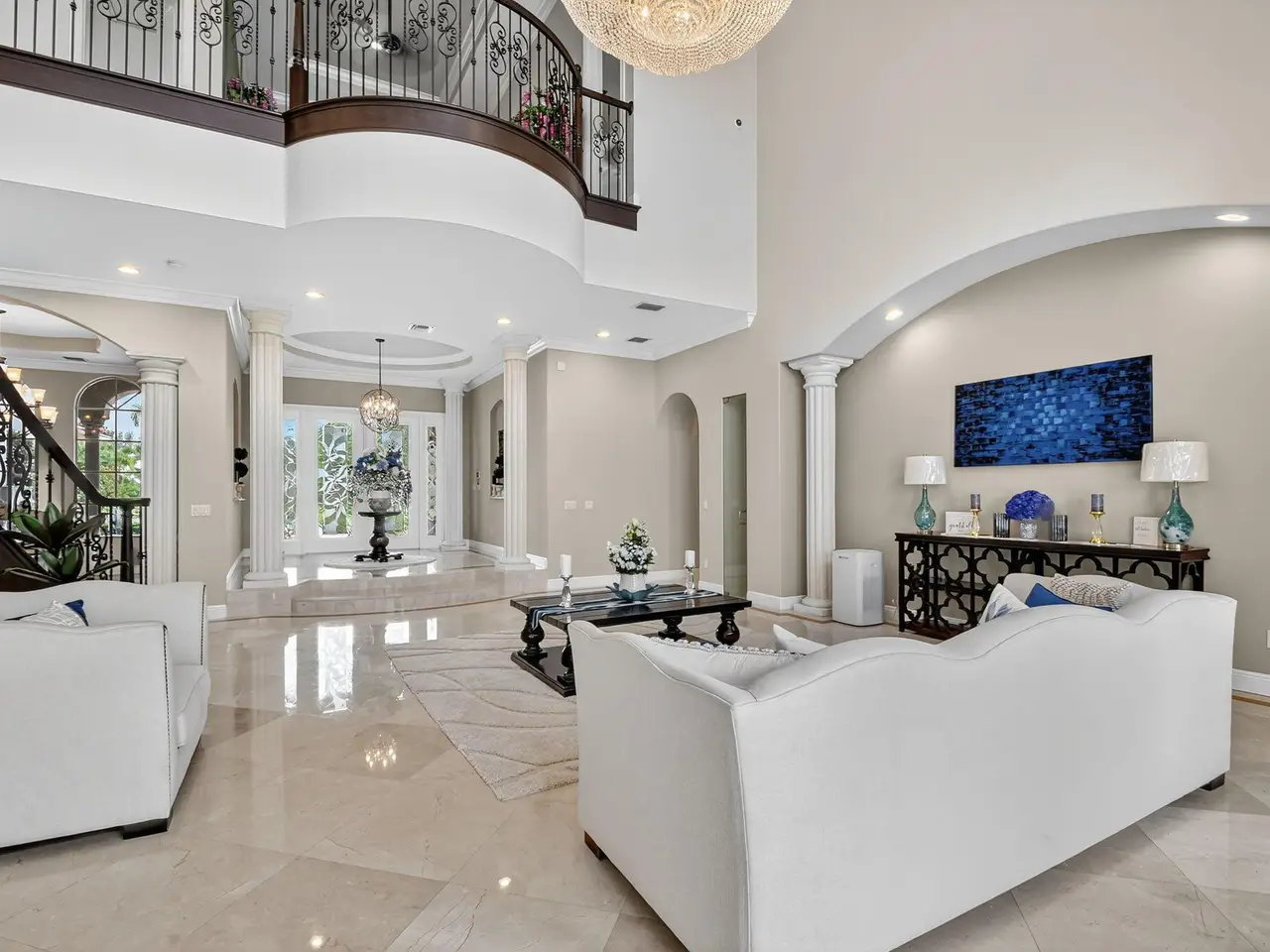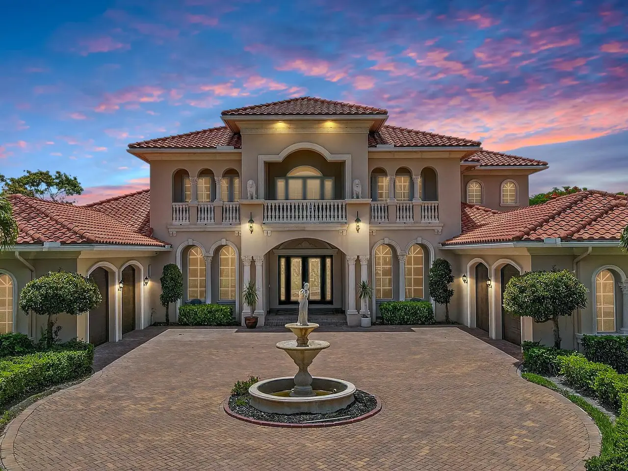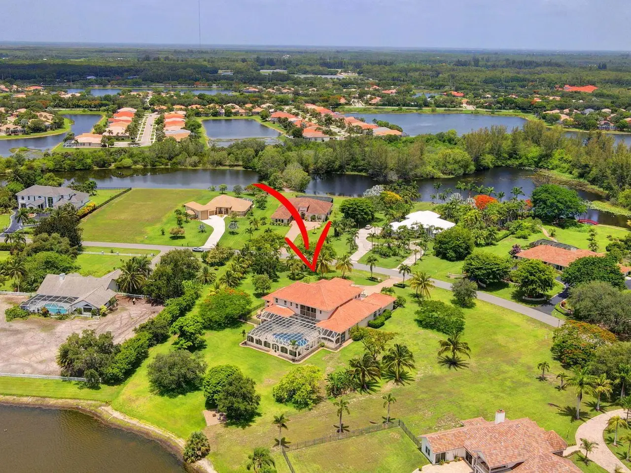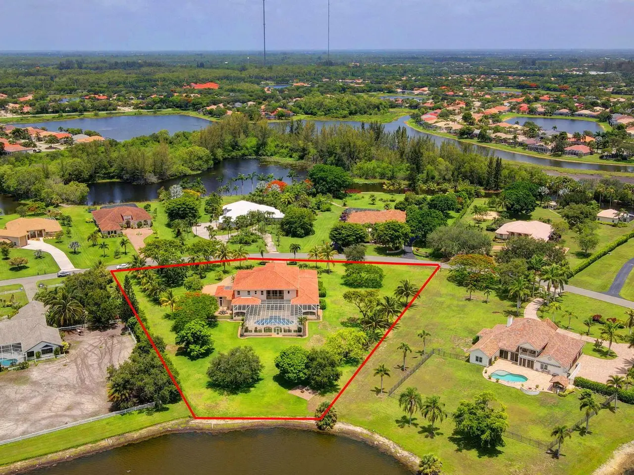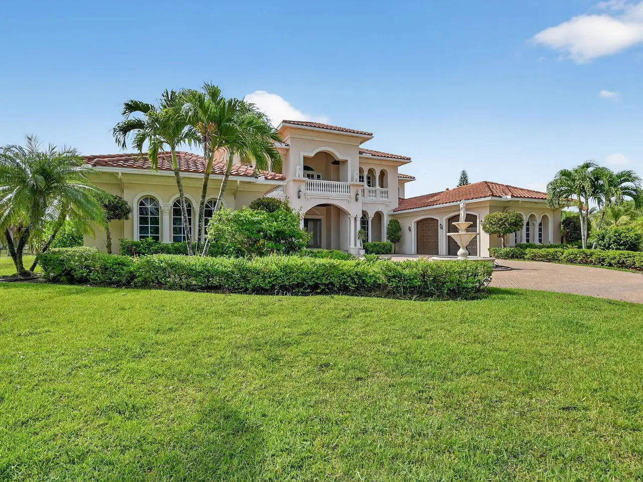Casual elegance & exquisite craftsmanship define this magnificent custom-built home featuring 6 bedrooms, 7.5 bathrooms & 4 car garage. Situated on over 2 acres, the estate welcomes you with a wide circular driveway & fountain centerpiece. In the grand foyer, gleaming marble floors, a dazzling crystal chandelier & soaring ceilings create an unforgettable first impression. A breathtaking winding staircase sets the tone for the sophisticated design found throughout. The chef's island kitchen is a culinary dream, with 2 wall ovens, a Sub-Zero refrigerator & gas stove- perfect for entertaining or everyday luxury. Nearly every main room showcases a unique ceiling design, adding character & charm at every turn! Outside is your resort-style oasis. The pool/spa area is framed by elegant walled arches, creating a serene Mediterranean retreat. Multiple balconies & patios offer the perfect setting for al fresco dining, relaxation or entertaining. Wander down to the peaceful lakeside patio and soak in the views. Equestrians, your horses are welcome! Despite the serene seclusion, this exceptional home is conveniently located near restaurants, shops, cultural venues, & the Palm Beach International Airport. This one-of-a-kind estate is where timeless design meets modern luxury. Come experience it for yourself!