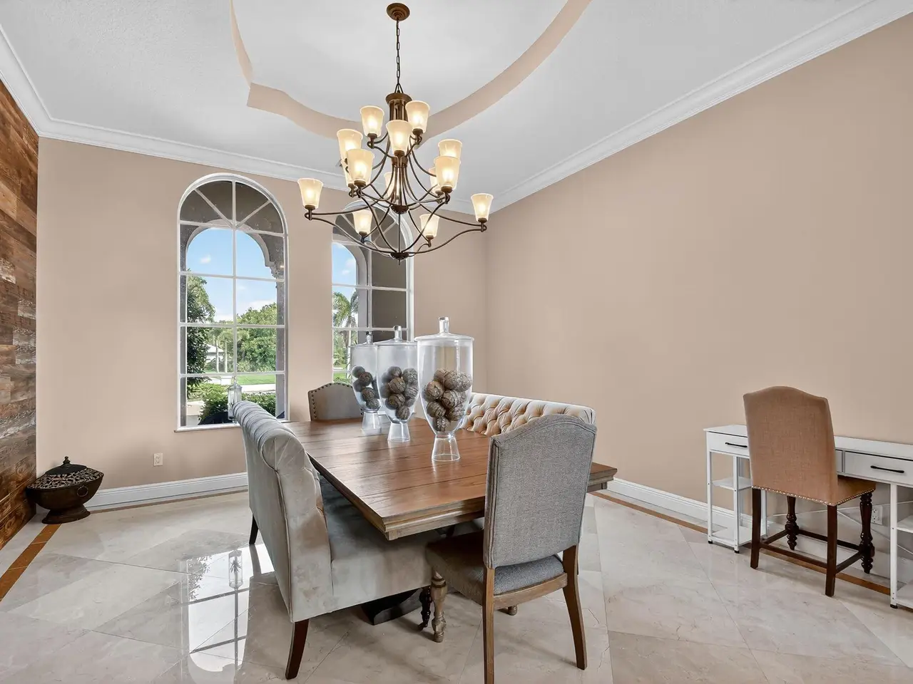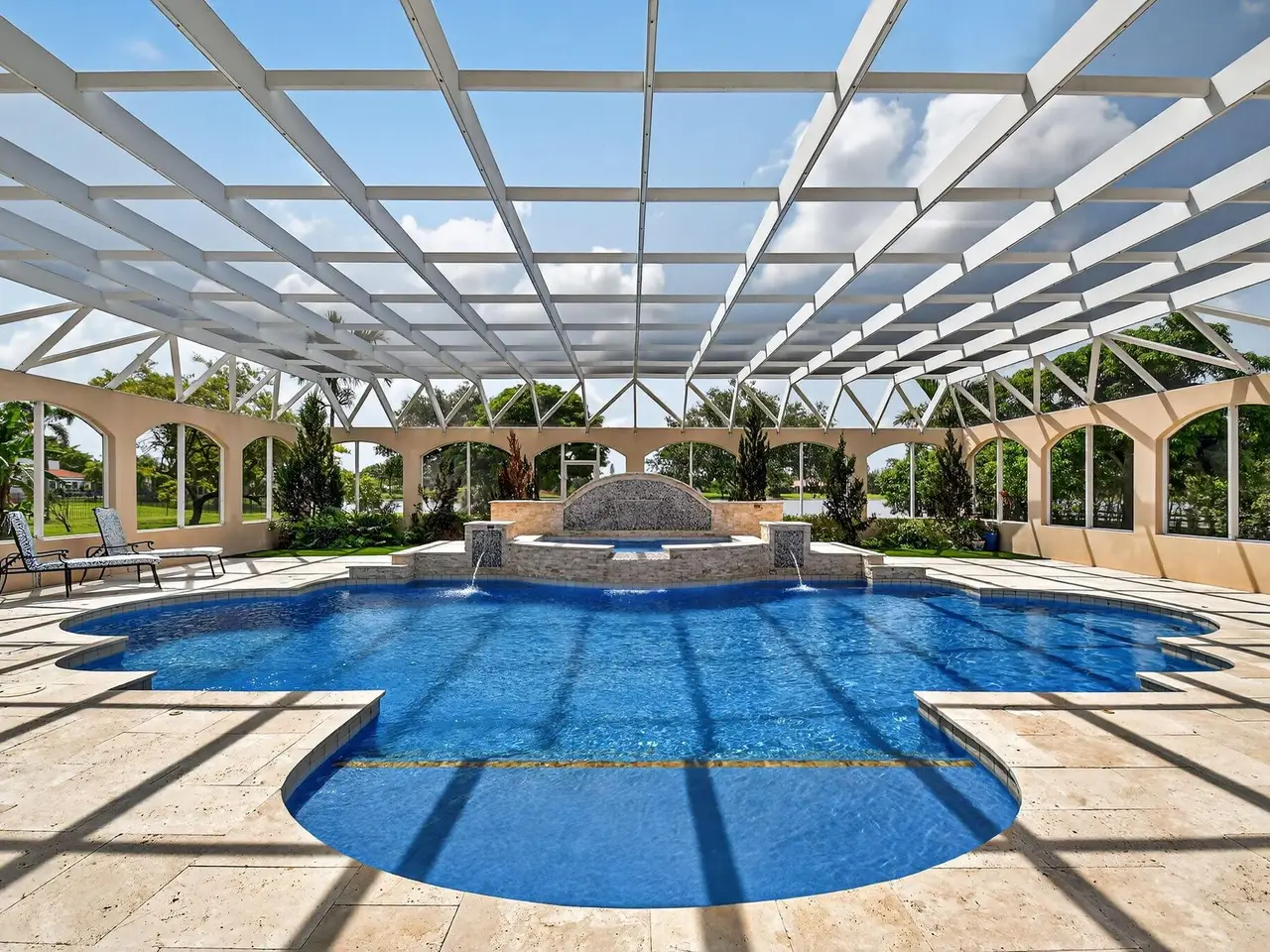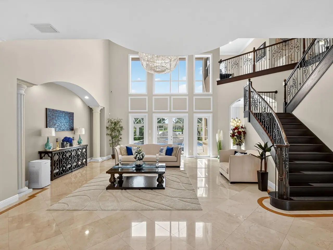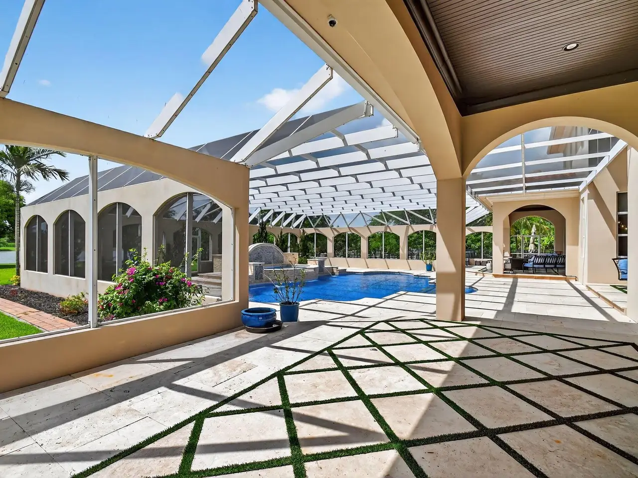 Casual elegance & exquisite craftsmanship define this magnificent custom-built home featuring 6 bedrooms, 7.5 bathrooms & 4 car garage. Situated on over 2 acres, the estate welcomes you with a wide circular driveway & fountain centerpiece. In the grand foyer, gleaming marble floors, a dazzling crystal chandelier & soaring ceilings create an unforgettable first impression. A breathtaking winding staircase sets the tone for the sophisticated design found throughout. The chef's island kitchen is a culinary dream, with 2 wall ovens, a Sub-Zero refrigerator & gas stove- perfect for entertaining or everyday luxury. Nearly every main room showcases a unique ceiling design, adding character & charm at every turn! Outside is your resort-style oasis. The pool/spa area is framed by elegant walled arches, creating a serene Mediterranean retreat. Multiple balconies & patios offer the perfect setting for al fresco dining, relaxation or entertaining. Wander down to the peaceful lakeside patio and soak in the views. Equestrians, your horses are welcome! Despite the serene seclusion, this exceptional home is conveniently located near restaurants, shops, cultural venues, & the Palm Beach International Airport. This one-of-a-kind estate is where timeless design meets modern luxury. Come experience it for yourself!