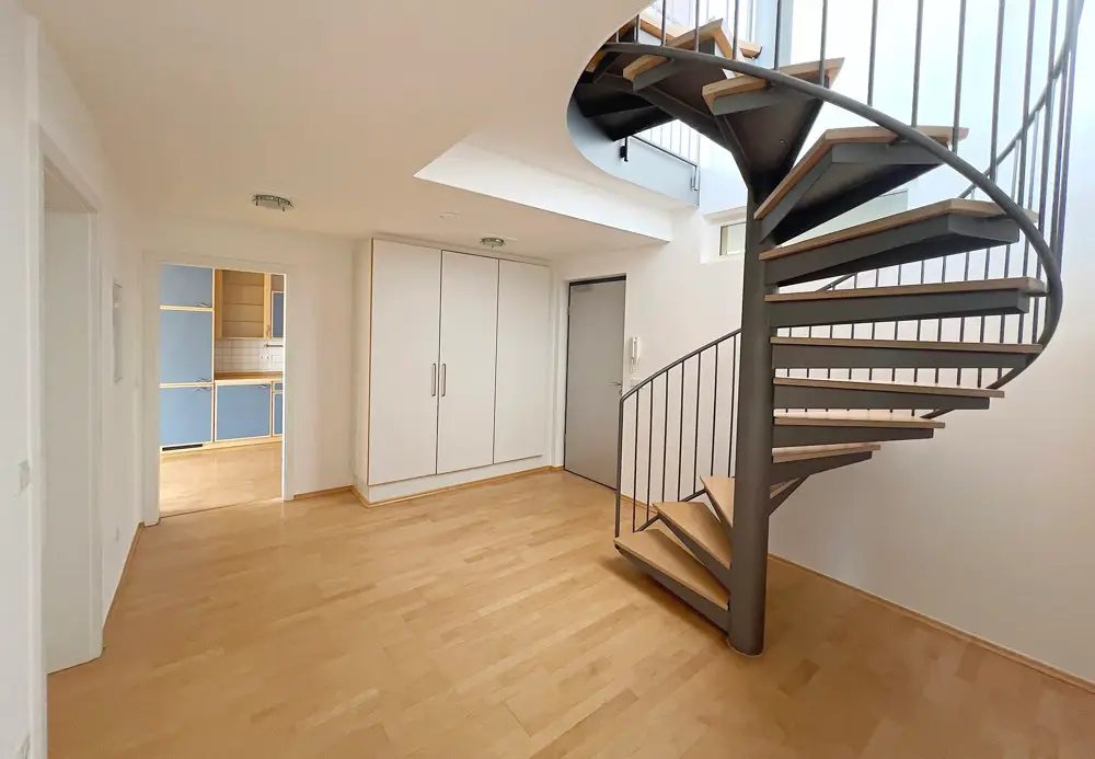 High standards? Rightly so! Central, exclusive maisonette apartment with a great view of the countryside. This two-level property for lovers is located on the second floor of a four-story low-energy building in a central location and delights its residents with its individuality. The view of the flood basin from the wonderful roof terrace and the two balconies screams for relaxation. You have to see this apartment with approx. 176 m² of living space to appreciate the unique ambience. You can reach the spacious four-room apartment via the quiet elevator or the bright staircase. We particularly like the extensive window elements, which are equipped with electric shutters and allow more or less light to flow through the spacious rooms as required. The entire apartment has attractive parquet floors and comfortable underfloor heating. The chic fitted kitchen and the excellent bathroom with an open shower, which are not lacking in luxury, also make a significant contribution to this. There is a separate toilet for your guests. The gallery invites you to be creative. Whether it's a hobby room or a home office - a lot can be done here. The building has a controlled ventilation system with heat recovery and solar air preheating via an earth duct and a glazed atrium. An efficient gas heater serves as the heating source. The house fee amounts to €542.00 per month. This special purchase opportunity includes an underground parking space and two cellar rooms. The tenants are currently moving, so the apartment will remain open until May 31st. is rented and is then ready for you to move in. If you are looking for something special and want to live in a central residential area in Landshut, you should arrange a non-binding viewing. We look forward to seeing you.