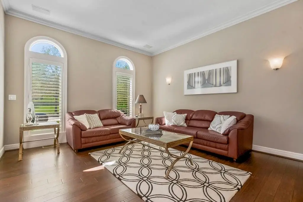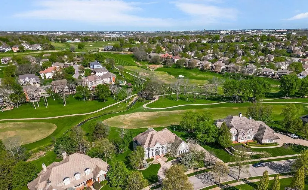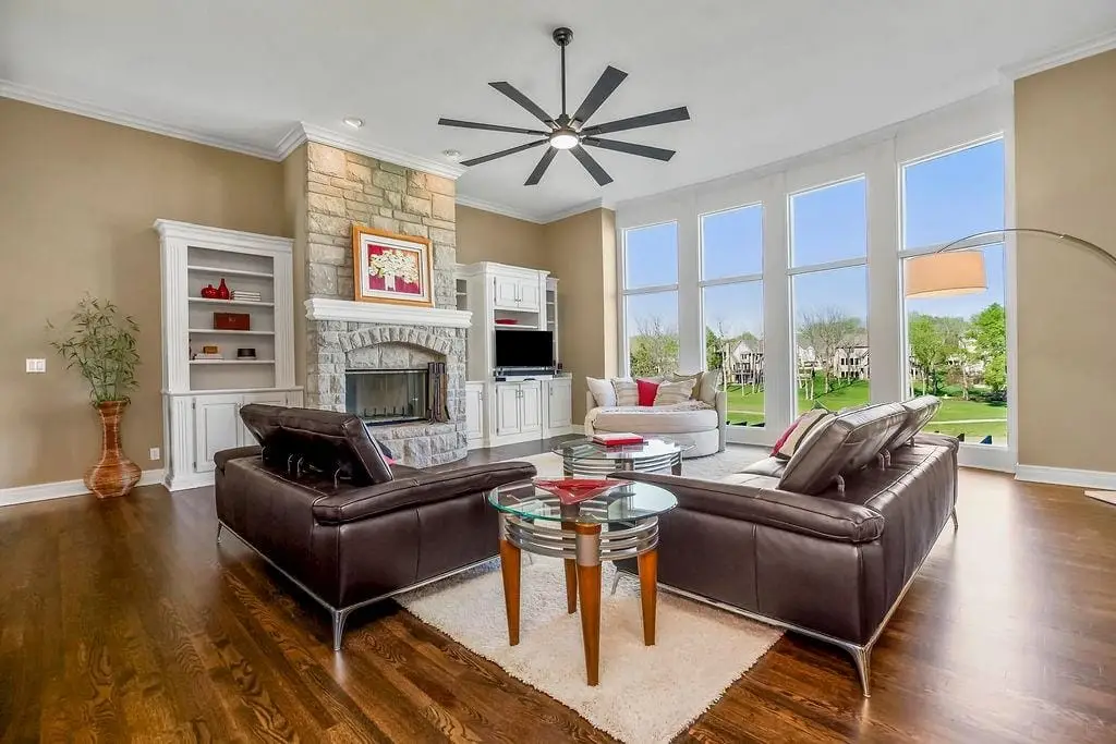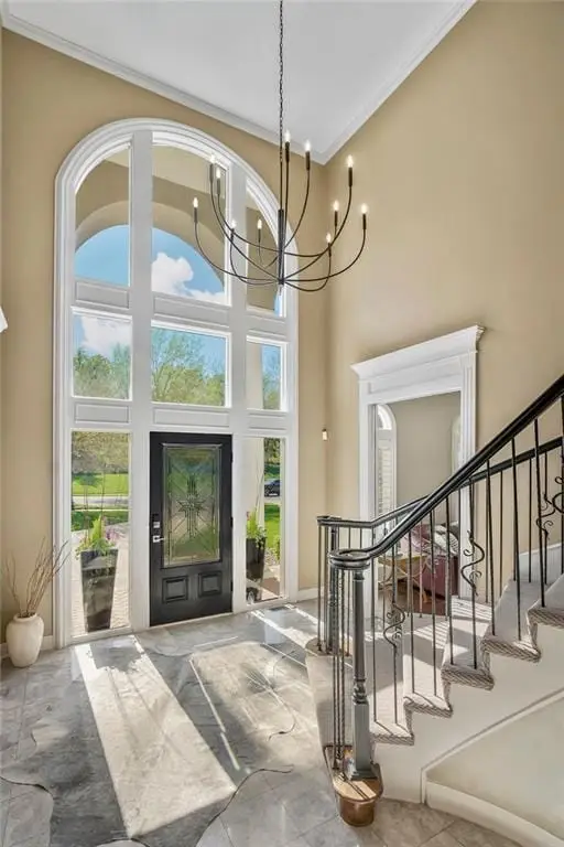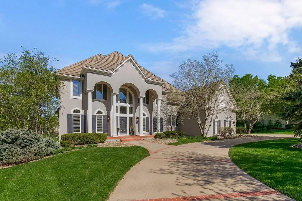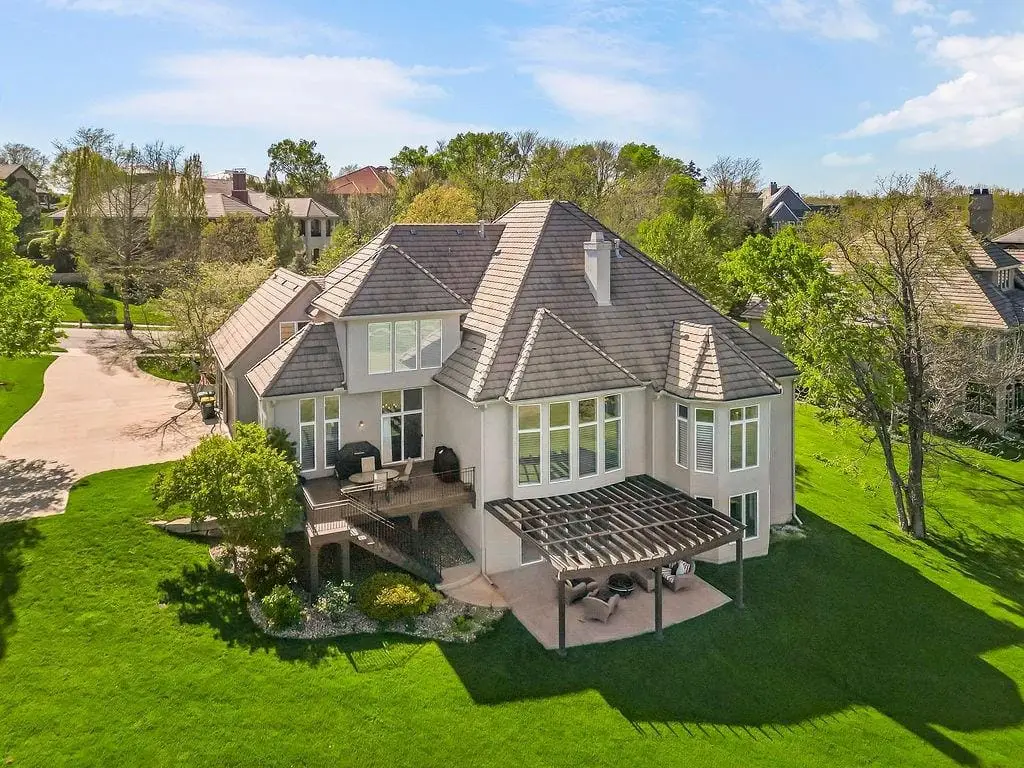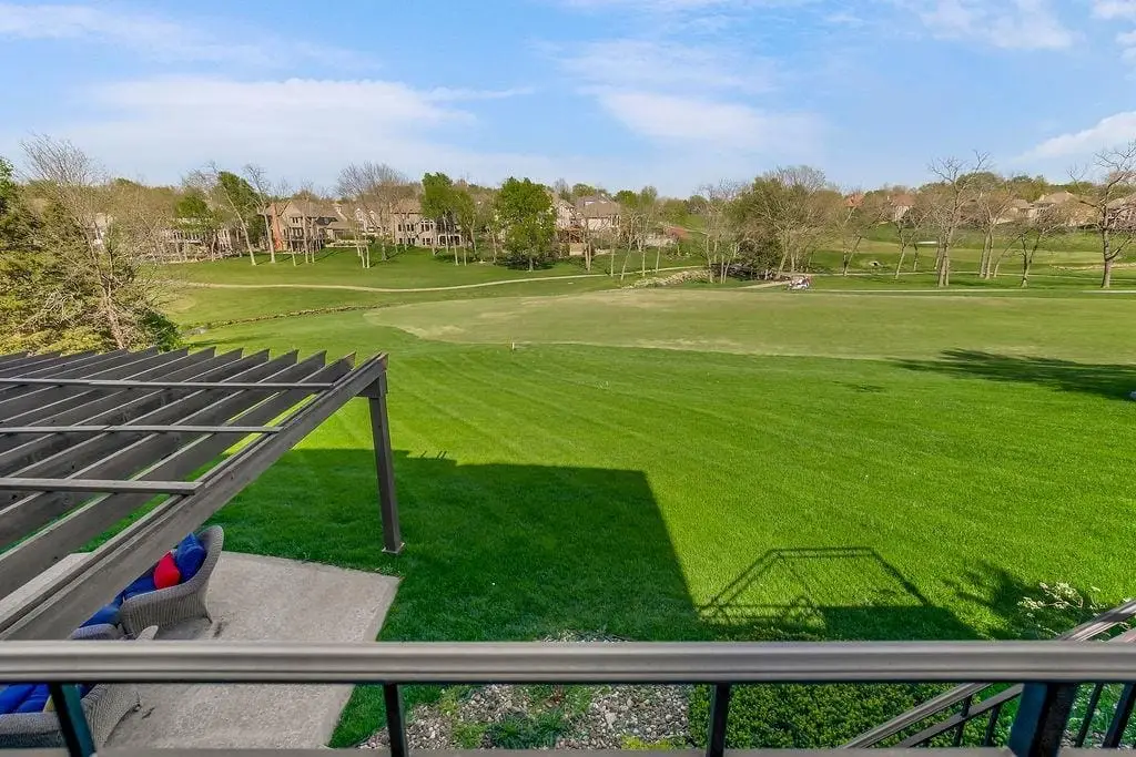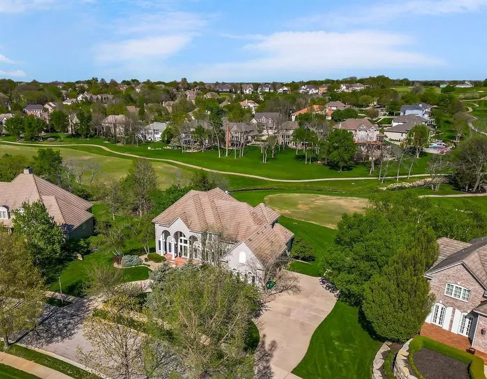 Fabulous 1.5 story Estate Home on the golf course in sought after Falcon Ridge Estates community boasting over 7200sqft with 5 bedrooms and 5 1/2 bathrooms! Circle driveway and side entry garage! Walk into the grand 2 story entrance with curved staircase, iron spindles, modern marble entry tile, new stair carpet & gorgeous chandelier. Main floor den/office with pocket doors and large formal dining. Fantastic main floor primary suite has a sitting area and see thru gas fireplace. Primary bathroom feels like a spa oasis with jacuzzi tub and fireplace, double vanities with new quartz countertops, plethora of cabinet space, separate shower & piazza de resistance is 2 LG WALK-IN CLOSETS! The spacious chef's kitchen has 2 ovens, a 6 burner Dacor gas cooktop with a retractable downdraft vent, beverage refrigerator in the island, tons of counter space, & walk-in pantry are sure to delight. New refinished hardwoods & open floor plan to the great room & breakfast nook. Great room has spectacular golf course views via floor to ceiling windows plus stone fireplace w/built-in cabinets. Also on the main floor are deck access, office area w/built-in desk spaces/shelvingw/French doors, laundry room & back staircase w/new stair carpet. Upstairs are 3 large bedrooms all w/private baths, new Quartz counters & walk-in closets PLUS large loft area & built-in desk area. Large open finished space in the walkout LL perfect for entertaining w/LG bar w/mini-fridge, microwave & sink along. Billiards & media areas as well. 5thbedroom & full bath in LL. Tons of unfinished storage! Perfect space that would make a great gym. Plantation shutters cover the front windows & custom window treatments throughout. Tankless hot water heater, newer HVACs, tile roof! Amenities include 2 pools, pickleball & tennis courts, party room, sand volleyball. Close to Lake Lenexa, trails & parks. Golf membership optional.