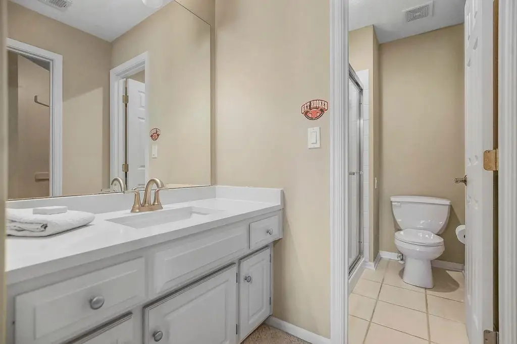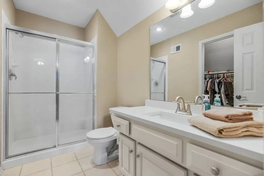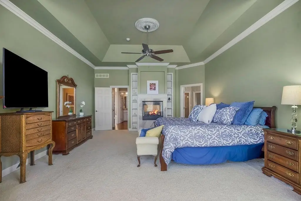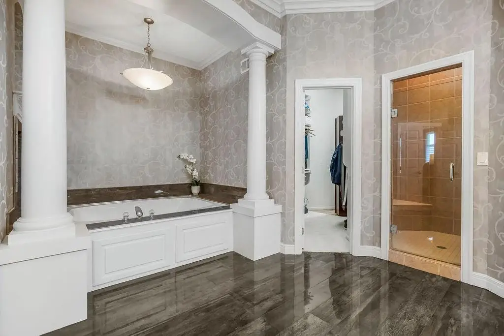 Spa-like primary bathroom with jacuzzi tub & fireplace