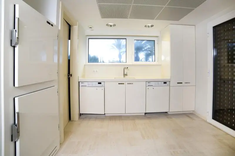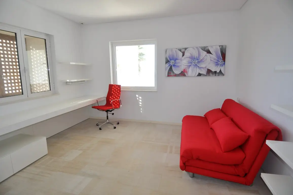 Designed by the prestigious architect Manuel Portaceli, the property has a magnificent style of construction with straight lines and large windows with views, as well as direct access to the sea The two-storey villa has a total area of 719m2 and sits on a spacious plot of 2.893 m2. The ground floor is distributed in a spacious entrance hall, living room with beautiful marble fireplace, large panoramic windows with access to the terrace and garden. It also includes a dining room in the upper part of the living room, a fully equipped design kitchen, a large pantry, a refrigerator, a laundry area with a bathroom and an additional design bathroom. The rest area is on the upper floor to which you can access through a fabulous wooden staircase or the lift. On this floor there are four double bedrooms, all with large windows overlooking the sea and two full bathrooms. The master bedroom includes an en suite bathroom with hot tub and dressing area. Next to the large pool is located the gym and changing rooms with shower. In the front you will find the garden with access to the beach. The villa has marble floors, underfloor heating and air conditioning. In addition, it is completely fenced and has access through electric door with plenty of space to park both in the garage and in the covered parking area. The villa has a privileged location and has been built with high quality materials.