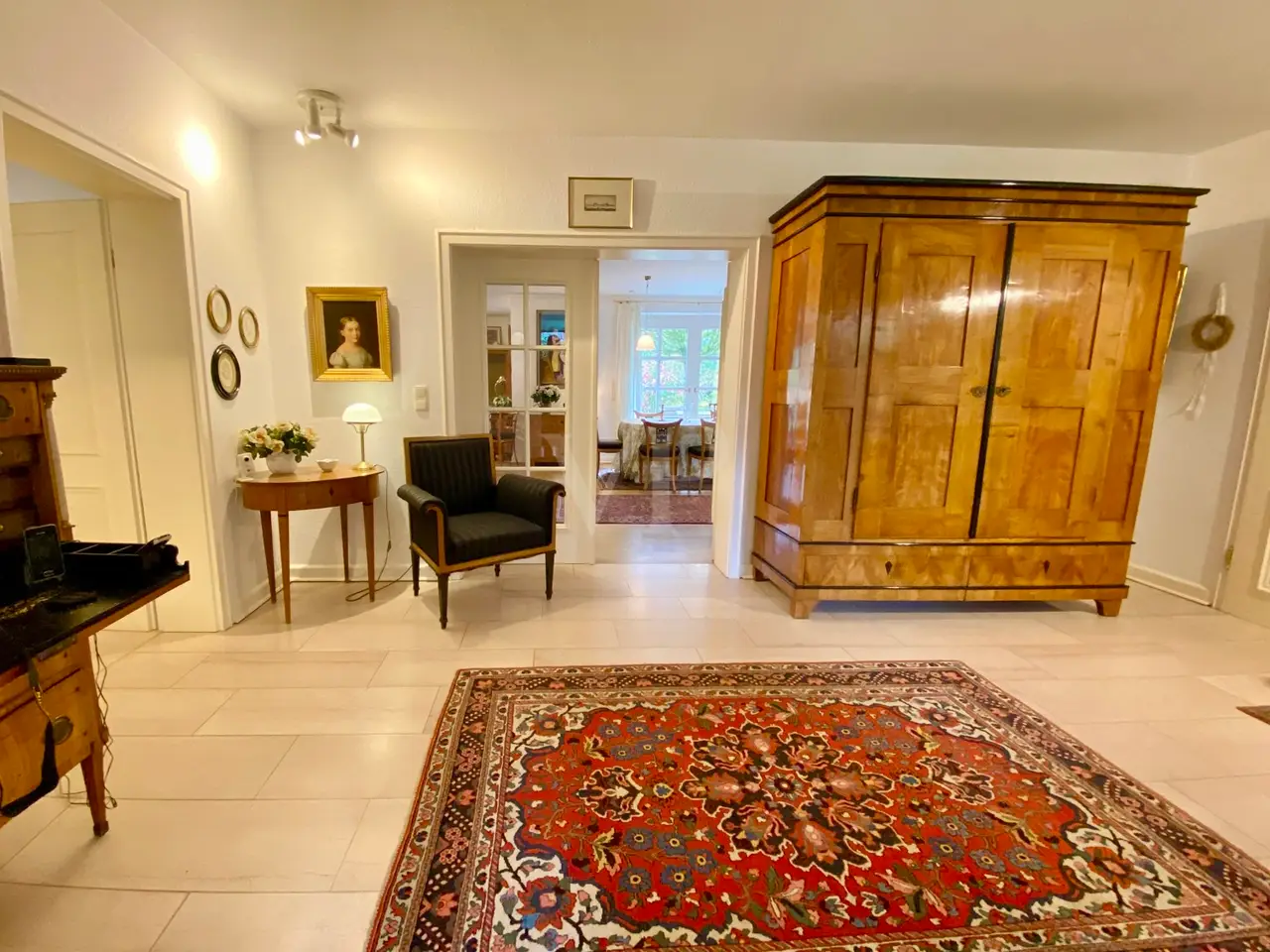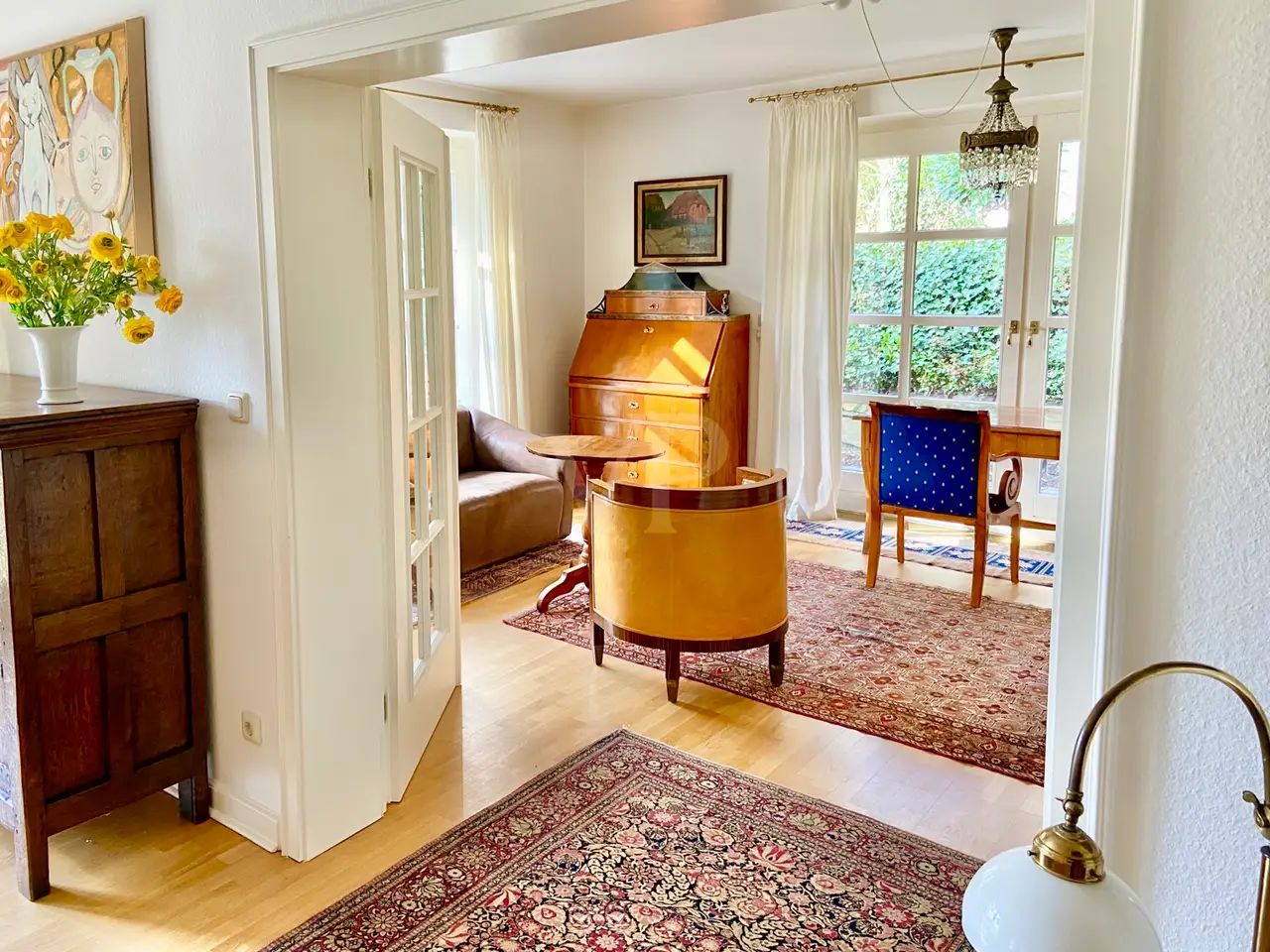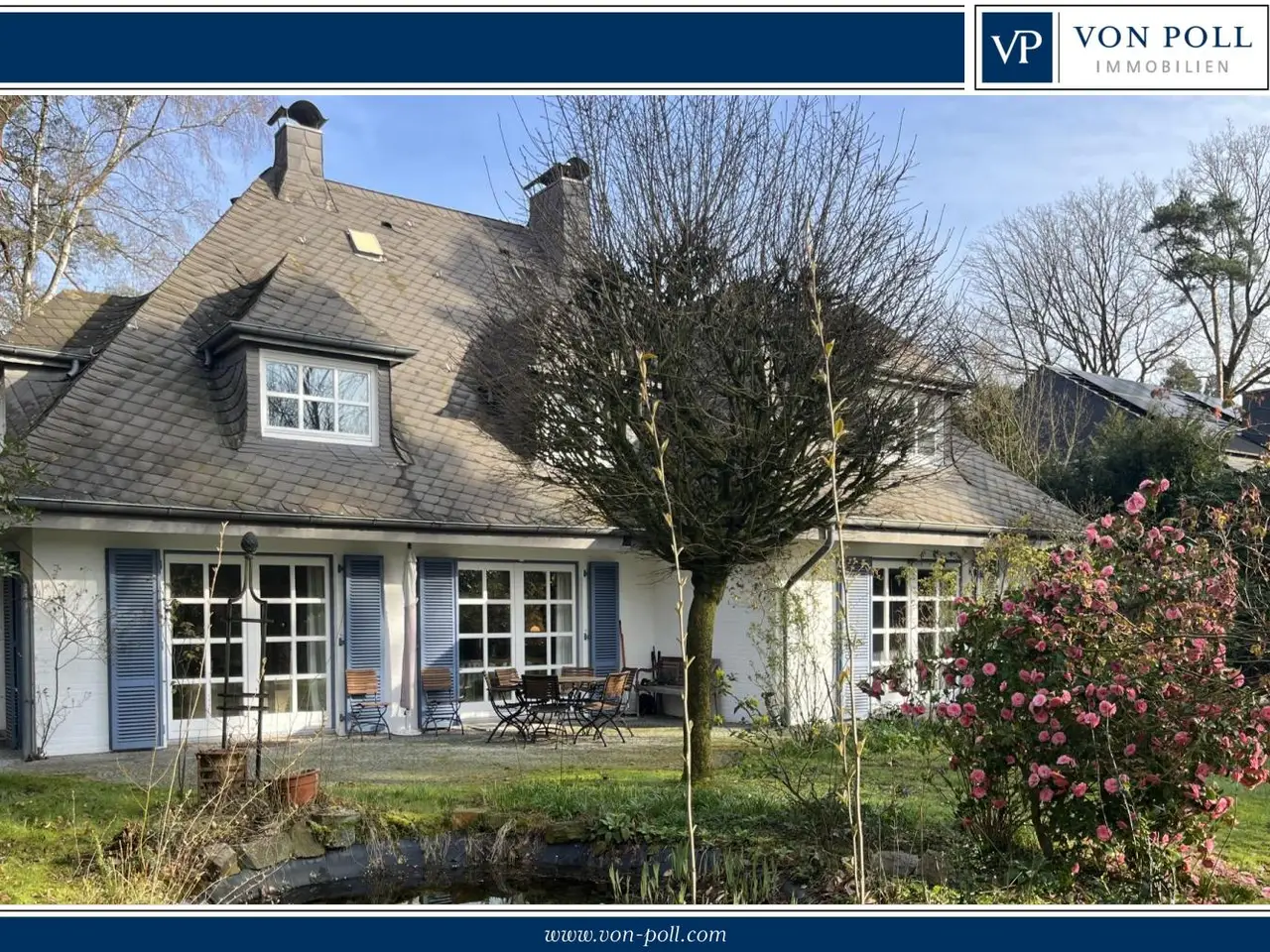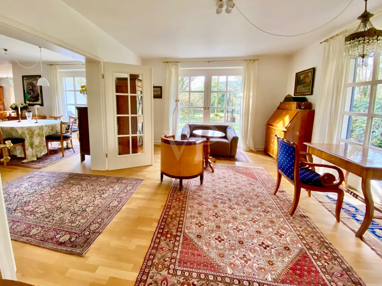 This beautiful villa was built in 1984 in a prime location in Lingen. It stands on a plot of approx. 1,181 m² with a beautifully landscaped and ingrown garden (including old trees, roses and rhododendrons) facing south. The property is located in Heukamps Tannen in a traffic-calmed cul-de-sac directly adjacent to the forest. The neighborhood in the street is characterized by villa-like houses, all of which are situated on comparably large plots of land - a real rarity in the city of Lingen. You will find plenty of space for yourself, your family and potential guests on approx. 290 m² of living space. You enter the property via the spacious and central entrance area with Italian marble flooring. This entrance area connects all the main rooms on the first floor. Access to the property is also possible through the garage and the utility/storage room, giving you direct access to the kitchen, which is practical for bringing the groceries dry into the house, for example. From the entrance area, you enter the very spacious and bright living and dining room via a double door with transom windows. An additional living room adjoins this through another double door. A further room on the first floor can be used flexibly as an office, library or bedroom, making ground-floor living possible. All living rooms on the first floor have oak parquet flooring. A high-quality fitted kitchen from Poggenpohl is installed in the eat-in kitchen. It is also possible to use the fireplace in the living/dining room as a tiled stove for the kitchen. A daylight guest bathroom with shower rounds off the first floor. Italian marble is used in the kitchen, bathroom and utility room, as well as in the entrance area and on the stairs. From all living rooms on the first floor and also from the kitchen, you can access the partially covered terrace, which runs around the house and is paved with high-quality natural stone (porphyry and granite), as well as the wonderfully green garden with mature trees and a small pond through floor-to-ceiling, lattice-glazed French windows. On the upper floor, the spacious hallway connects the four possible bedrooms, one with an additional walk-through room. The daylight bathroom has a double washbasin, shower and bathtub, as well as Italian marble on the floors and the relevant walls. The basement, which can be partially heated, also has extra high ceilings and can also be used wonderfully as a living space, but is not included in the living space calculation. This part of the property consists of three fully-fledged rooms, plus a bathroom equipped with a shower, WC and washbasin, which also has space for a washing machine and dryer, as well as a sauna with separate plunge pool. The beautiful and already professionally insulated attic offers further potential for expansion and living space. The property impresses with its spaciousness and brightness, while at the same time retaining its formal rigor.