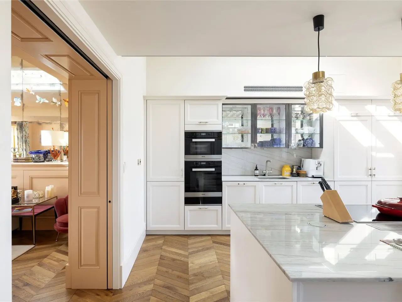 Nestled within one of Notting Hill’s most prestigious garden squares, Leinster Square, this exceptional penthouse apartment offers the rare opportunity to acquire a piece of history with a contemporary twist. This imaginative lateral conversion perfectly blends the elegance of heritage architecture with striking, modern design. This pristine penthouse apartment provides expansive lateral living areas, designed with both beauty and functionality in mind. The space flows effortlessly from one room to the next, with a seamless connection between the modern kitchen, an inviting dining area, and a cozy yet stylish living room. The design offers a wonderful sense of space, making it an ideal setting for both entertaining and everyday living.