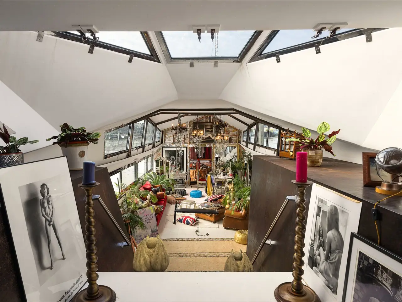 A pioneering 25 metre freehold houseboat; sculpted by artist Cyril de Commargue with its striking polyhedron mirrored exterior as his “Fluxland” project on a reimagined 1950's Dutch grain barge and now delivering sumptuous, light filled and bohemian interiors of 1,688 square feet / 156.9 square metres with ceilings up to 3.69 metres.