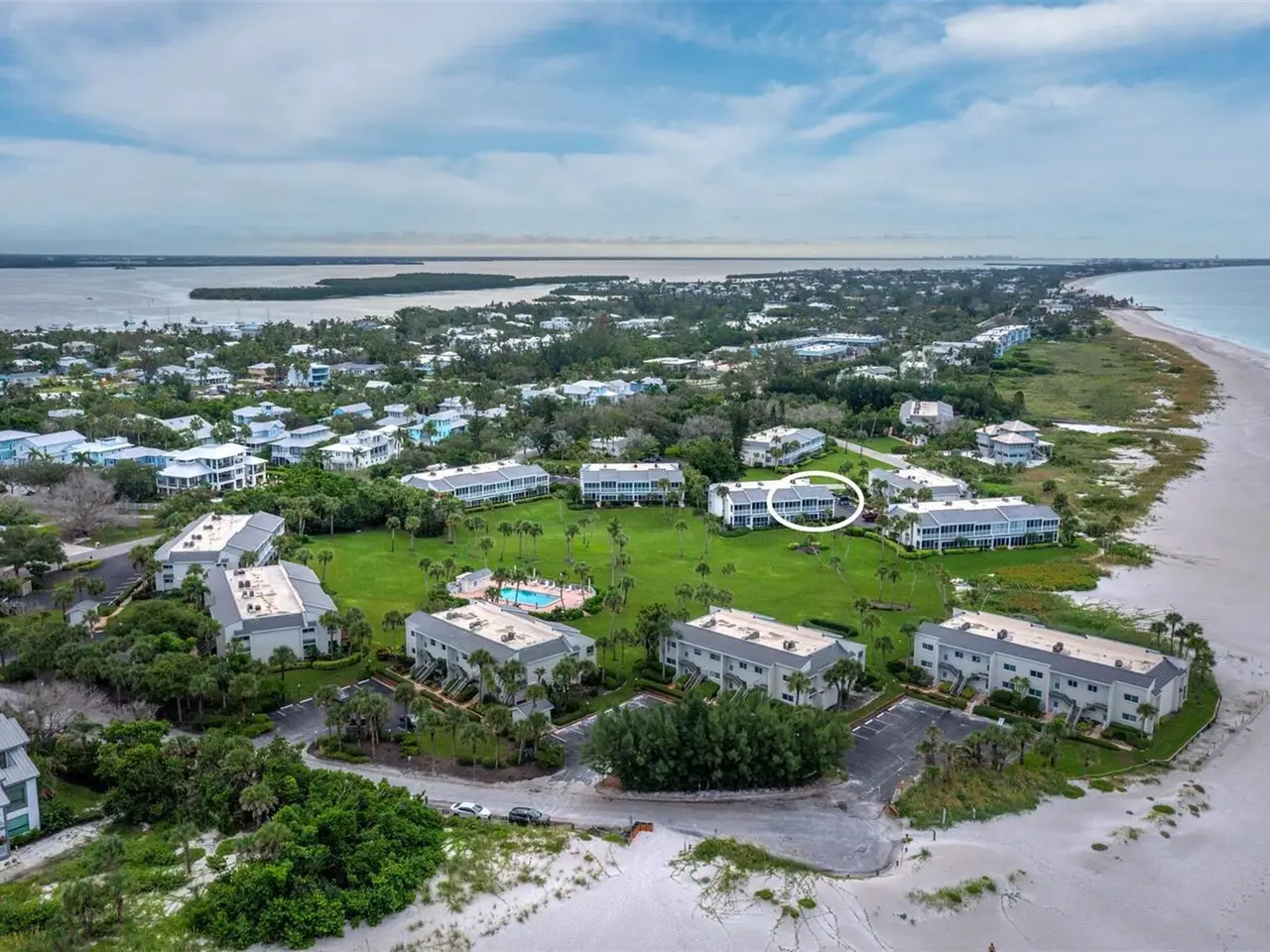 Charming Gulf side 2 bedroom 2 bath condo with bonus room in the serene community of Long Beach on the north end of Longboat Key. Stroll the nearly 3 acres of gulf front/beach property and enjoy...or take a dip in the heated pool, play tennis or relax on the enclosed balcony. This elevated condo (19.5 ft Base Flood Elevation) has been updated and is being sold turnkey furnished for instant enjoyment or an Instant-Income opportunity or homestead and enjoy the significant tax benefits! Enter the front door for the first glance of the gulf and each step brings you closer to the mesmerizing views of the sparking gulf waters and breathtaking sunsets! The screened, enclosed lanai, with access from the living room and primary bedroom, is furnished with a lounge chair and dining table...perfect for morning coffee with the dolphin. Tile floors throughout. Corian/Solid Surface counter tops. Tumbled marble tiles for the kitchen back splash. There is in-unit full size washer and dryer with an optional community laundry for sandy towels. The bonus room provides additional sleeping area, an optional office, or play space. Just across the street there are multiple options for dining and shopping. Meet your neighbors at the pool or the community library. Don't forget to sign up to reserve your tennis court!