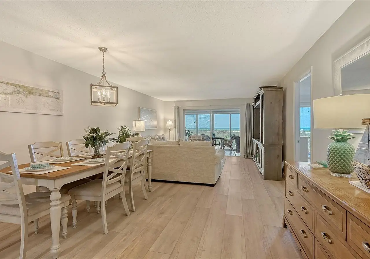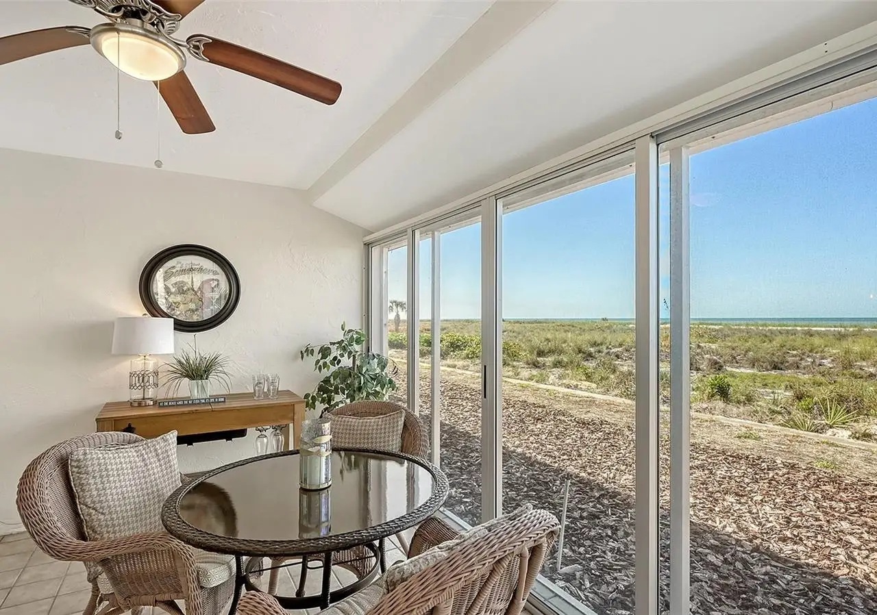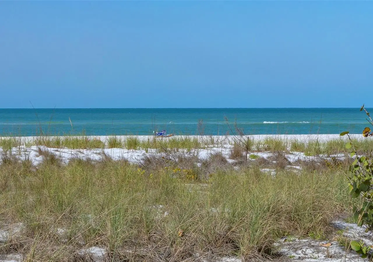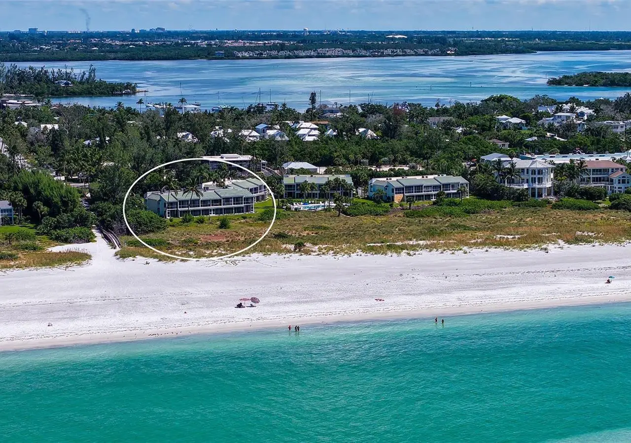 WOW! The minute you open the front door of this first floor Coastal Retreat Seaside condo, you will be captivated by the shimmering, turquoise Gulf of Mexico water view and the Panoramic Sandy White Beach in front of you. You'll be eager to get a closer look from the glassed in Florida Room, so you may overlook the beauty of this updated, attractively furnished & decorated first floor residence at Sea Pines, a small 28-unit beach front condo complex on the north end of Longboat Key, Florida. Since purchasing five years ago, these owners have lovingly transformed this almost 1400 square foot, corner unit with extra windows, open concept, two bedroom with En Suite baths & walk in closets to today's coastal contemporary style tastes. Improvements include light oak color Luxury Vinyl wide plank flooring throughout, Samsung stainless steel appliances including washer & dryer, new HVAC installed, updated the primary bedroom with a quartz counter vanity, tiled & glass door shower, and fitted out closet. The condo's interior was painted as well & new, high quality neutral colored living room, dining & bedroom furniture, rugs, lighting & drapery, artwork and a large entertainment center installed. A new tiled roof was installed on this building in 2024. Additional features include impact resistant windows in both bedrooms & the office adjacent to the kitchen. Plantation shutters cover all these windows. This office area is fitted out with oak cabinetry, desk & drawers, perfect for working at home. The spacious 26-foot-long lanai (Florida Room) can be entered from either the primary bedroom or the living room via sliders. This may be your favorite room with mesmerizing Gulf & beach views over the sea grass pathways to the water. And of course, the magnificent Longboat Key Gulf of Mexico sunsets will thrill you whether watching from your lanai or enjoying on the beach while toasting your good fortune! This turnkey handsomely appointed & attractively furnished seaside retreat offers great rental income if you so wish. There is the potential of keeping on an existing three month (Jan., Feb. & March 2026) tenant. Currently these owners are using RVA Rentals, but a new owner can choose how or if to lease out this unit. Rental friendly Sea Pines can be leased out six times a year with a one month minimum time period. Two additional benefits to this first floor Unit 14 are that these owners will be paying the upcoming $5357 assessment for new landscaping for the complex plus new interior glass sliders will be installed in the living room & primary bedroom & sellers to pay for that as well. Sea Pines has an electronic gated entry for security & privacy. Amenities include a large, heated pool, is large pet friendly & offers excellent rental income possibilities. Charming Longboat Village is nearby with fabulous restaurants like The Shore, Mar Vista, Whitney's, Ventura's & the thriving Whitney Shopping Center. Anna Maria Island is just across the Longboat north end bridge for additional night life entertainment.
