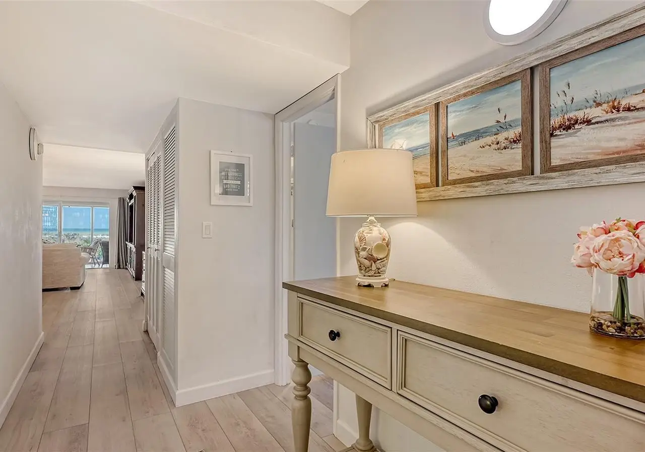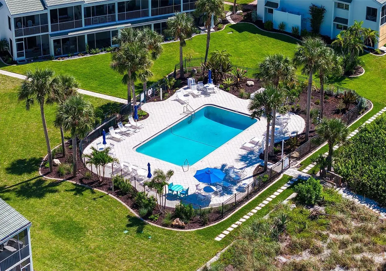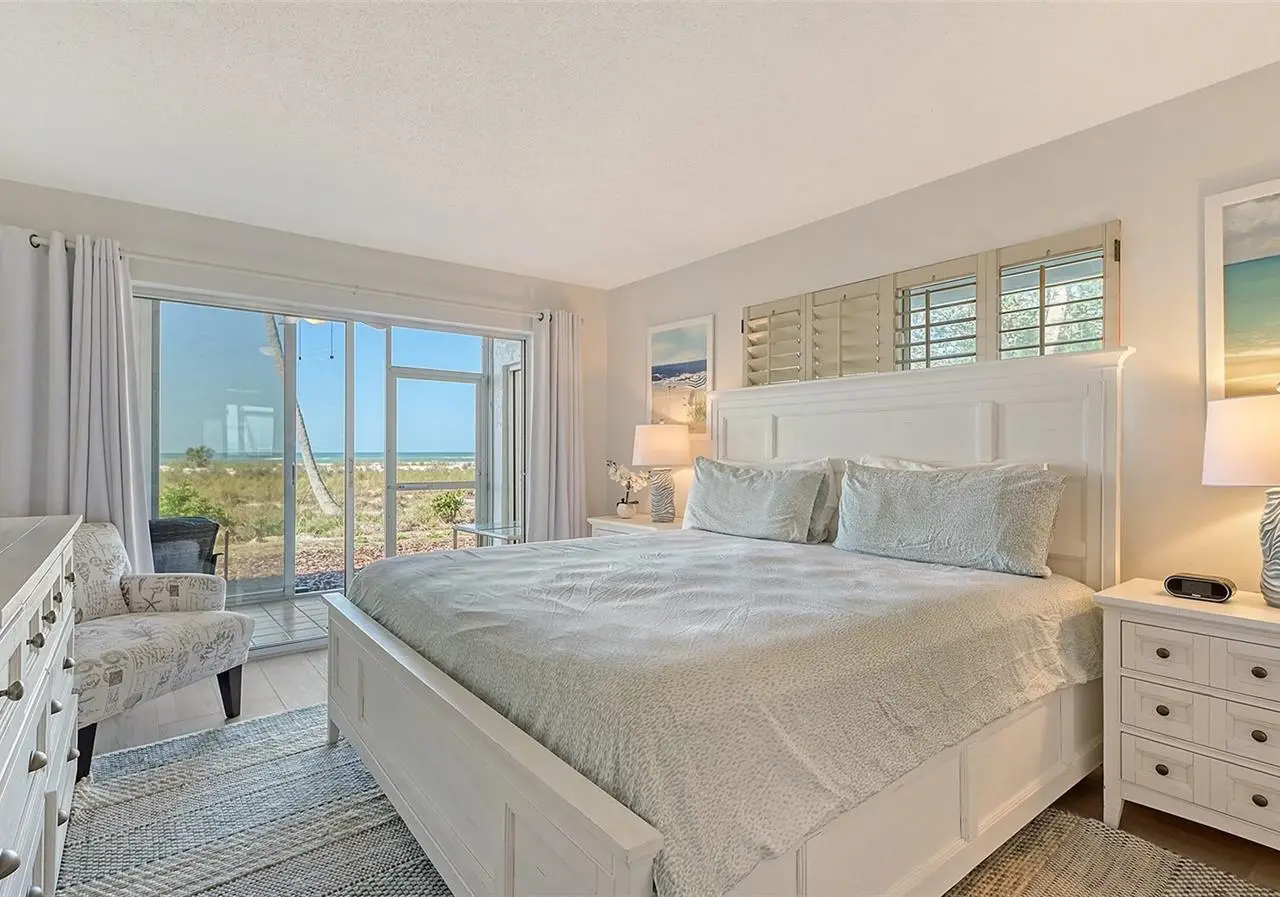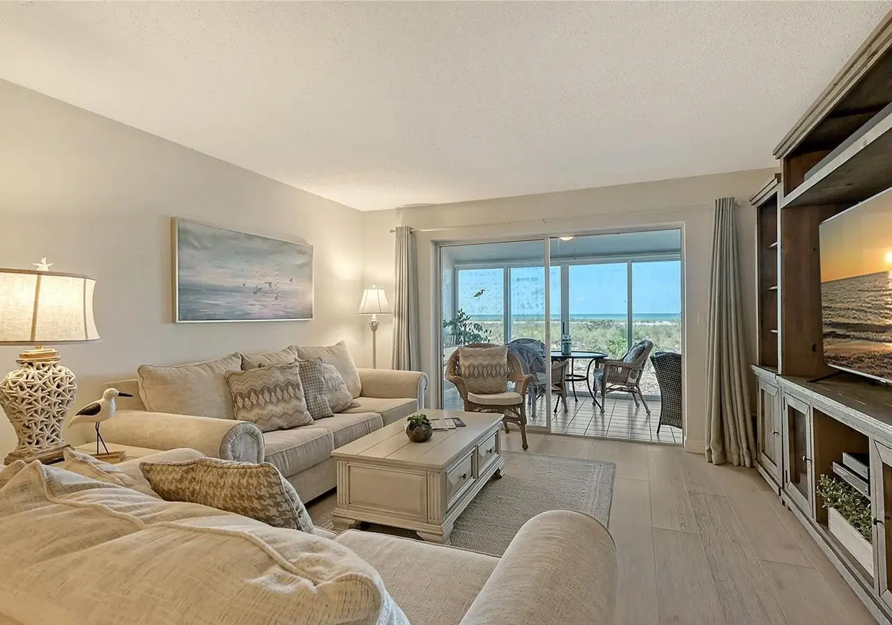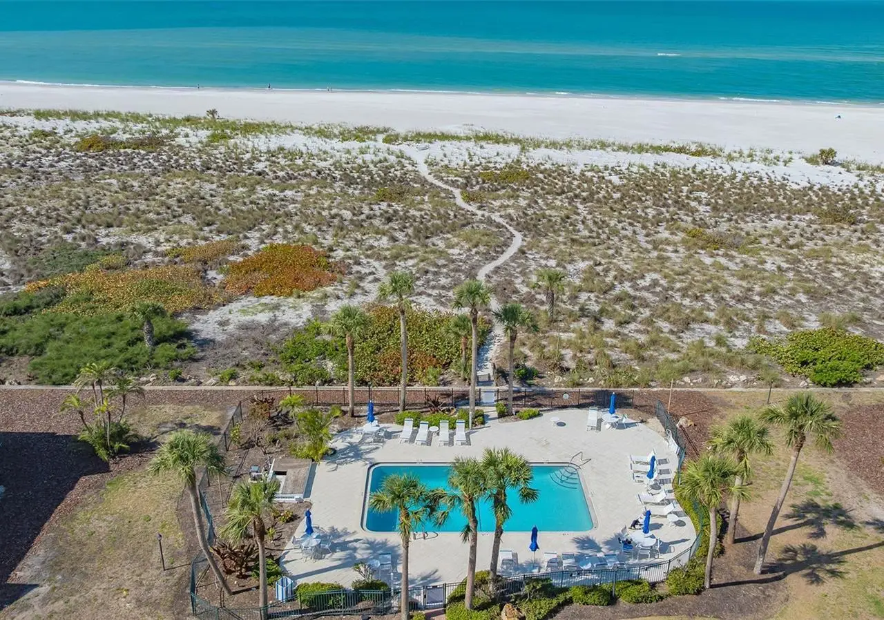 WOW! The minute you open the front door of this first floor Coastal Retreat Seaside condo, you will be captivated by the shimmering, turquoise Gulf of Mexico water view and the Panoramic Sandy White Beach in front of you. You'll be eager to get a closer look from the glassed in Florida Room, so you may overlook the beauty of this updated, attractively furnished & decorated first floor residence at Sea Pines, a small 28-unit beach front condo complex on the north end of Longboat Key, Florida. Since purchasing five years ago, these owners have lovingly transformed this almost 1400 square foot, corner unit with extra windows, open concept, two bedroom with En Suite baths & walk in closets to today's coastal contemporary style tastes. Improvements include light oak color Luxury Vinyl wide plank flooring throughout, Samsung stainless steel appliances including washer & dryer, new HVAC installed, updated the primary bedroom with a quartz counter vanity, tiled & glass door shower, and fitted out closet. The condo's interior was painted as well & new, high quality neutral colored living room, dining & bedroom furniture, rugs, lighting & drapery, artwork and a large entertainment center installed. A new tiled roof was installed on this building in 2024. Additional features include impact resistant windows in both bedrooms & the office adjacent to the kitchen. Plantation shutters cover all these windows. This office area is fitted out with oak cabinetry, desk & drawers, perfect for working at home. The spacious 26-foot-long lanai (Florida Room) can be entered from either the primary bedroom or the living room via sliders. This may be your favorite room with mesmerizing Gulf & beach views over the sea grass pathways to the water. And of course, the magnificent Longboat Key Gulf of Mexico sunsets will thrill you whether watching from your lanai or enjoying on the beach while toasting your good fortune! This turnkey handsomely appointed & attractively furnished seaside retreat offers great rental income if you so wish. There is the potential of keeping on an existing three month (Jan., Feb. & March 2026) tenant. Currently these owners are using RVA Rentals, but a new owner can choose how or if to lease out this unit. Rental friendly Sea Pines can be leased out six times a year with a one month minimum time period. Two additional benefits to this first floor Unit 14 are that these owners will be paying the upcoming $5357 assessment for new landscaping for the complex plus new interior glass sliders will be installed in the living room & primary bedroom & sellers to pay for that as well. Sea Pines has an electronic gated entry for security & privacy. Amenities include a large, heated pool, is large pet friendly & offers excellent rental income possibilities. Charming Longboat Village is nearby with fabulous restaurants like The Shore, Mar Vista, Whitney's, Ventura's & the thriving Whitney Shopping Center. Anna Maria Island is just across the Longboat north end bridge for additional night life entertainment.