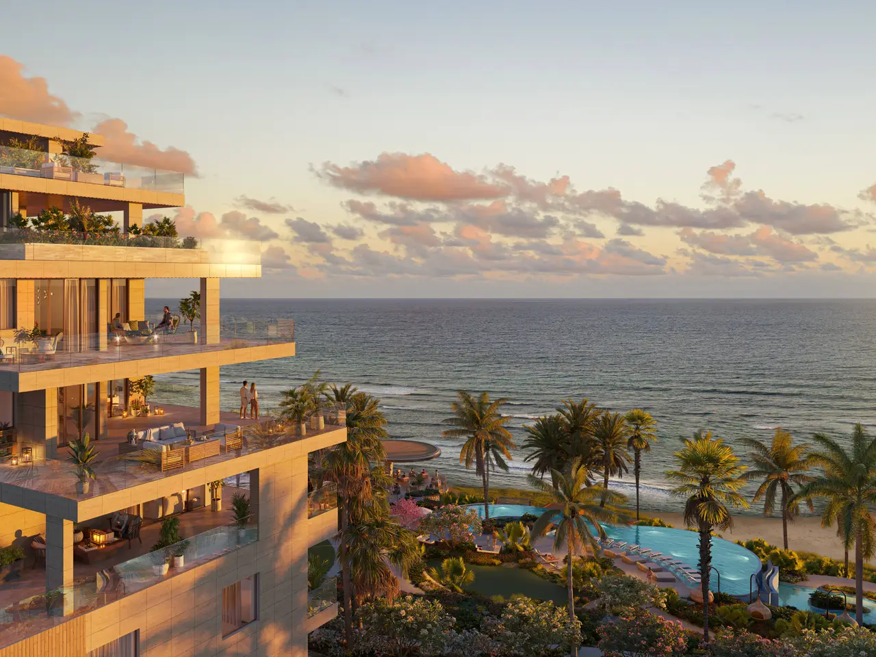 7th floor three-bedroom, three and one-half baths Residence located on the east corner of the East Tower features 3,543 sq ft of interior living area and 949 sq ft of oceanfront terrace, combining for 4,492 square feet of indoor and outdoor living. The unique lateral floor plan provides direct ocean views from all major rooms. The entry gallery opens onto the living room and dining area. Elevated ten-foot ceilings frame floor-to ceiling retractable glass opens onto the front and corner terraces. Gourmet kitchen with seating bar features custom mill work cabinetry, Calacatta counter tops and back splashes with Wolf, Sub-Zero and Gaggenau appliances. The primary bedroom suite has a large 5-fixture bathroom featuring a windowed seating area, windowed soaking tub and spacious shower room with ocean views. Second and third bedrooms offer ocean views and en suite bathrooms. Baths are appointed in a selection of natural stones including Travertine and Clef Cut Limestone.Seven-inch-wide Grey Oak flooring is hand-laid throughout the interior, seamlessly integrating with the Grey Wood Plank Porcelain tiling the outdoor terrace. Wrap-around corner terrace and grilling area is good for catching the sunrise and outdoor dining.