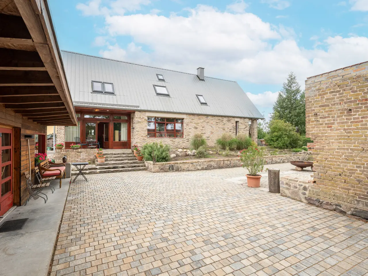 This impressive 923 m² courtyard and garden property is just a 25-minute drive south of Berlin and Potsdam. Nestled in the protected Nuthe-Nieplitz nature park, it offers a peaceful, natural environment. The location creates a fascinating contrast to the urban density of the cities and invites you to enjoy nature in all its beauty. A place that combines peace, nature and space. From the street, you enter the property via a paved entrance courtyard, which was designed in the style of the historic three-sided courtyards in the neighborhood. This is reflected in the courtyard development and the building materials used. A wide fieldstone staircase leads up to the main house, which was built about one meter above the ground to enhance the sweeping views of the landscape. This exceptional architect-designed house, which was built in 2017, harmoniously combines modern construction quality with traditional elements and impresses with its high-quality workmanship and flexible floor plan. With around 183 m² of living space and around 90 m² of usable space, this property offers plenty of room for individual living, working and development. The solidly built house combines modern energy efficiency with charming details. Energy efficiency class A ensures low operating costs, while inside, a harmonious blend of historic wooden beams and exposed concrete in the ceilings creates a special atmosphere. Large windows with triple glazing and shutters allow plenty of light into the home. The south-west orientation makes it possible to experience the changing rhythm of sunlight in a subtle way. Sustainable energy is provided by a solar thermal system, underfloor heating and a double-sided wood-burning stove, which can optionally provide additional heat via an adjustable opening in the attic. A fiber optic connection is available. The heart of this house is the first floor with its spacious open-plan living and dining area, which flows seamlessly into the terrace and garden. There is also a small home office, a barrier-free shower room, a timeless kitchen and a practical kitchen pantry. Warm real wood oak floorboards and clay plaster on the ceilings and walls create a cozy atmosphere. A wide staircase takes you to the top floor, which impresses with its exposed carpentry. Here you will find two loft rooms for living and sleeping, a dressing room, the utility area and a bathroom with bathtub. The offset timber and glass façade also offers a wonderful view of the unobstructed landscape. The space on offer is complemented by an approx. 60 m² heated coach house, which can be used as an office, guest house, sauna or fitness room, as well as an approx. 30 m² workshop, which serves as a utility building or cellar replacement room. The well-kept outdoor area is lovingly landscaped: The so-called "ruin courtyard" with seating walls and a U-shaped brick wall serves as a wind-protected retreat and is complemented by a small, sheltered patio courtyard as well as covered alcoves that can be used for both sunny and shady stays. The property boundary is bordered by historic brickwork, hedges and a picket fence. Exterior lighting with motion detectors creates a cozy atmosphere, while roof drainage is provided by two retention and soakaways in the courtyard and garden area. There are also two garden water connections. There is ample space for vehicles and there is the option of building a large carport. This house harmoniously combines old and new, high-quality craftsmanship, authentic materials and modern living quality. It is a home with character and a wide range of possible uses, which impresses with its special atmosphere and individual design.