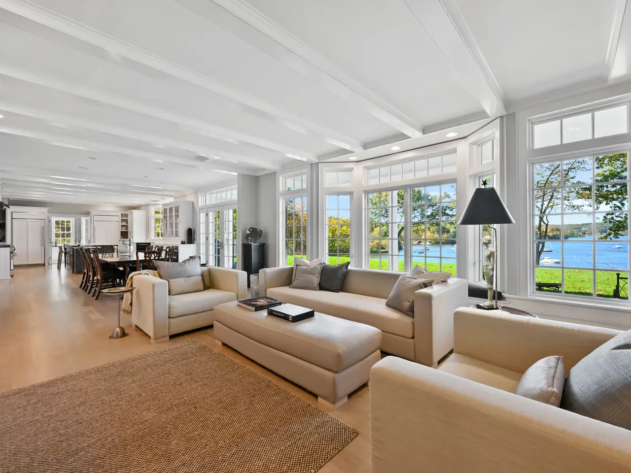 Architect-designed and inspired by Palladio's symmetry and Mount Vernon's timeless colonial grace, the essence of classic balance, symmetry, and luxury. A center-columned portico anchors the perfect proportion between two grand wings, while the interiors reveal artistry at every turn-gleaming wood floors, custom millwork, and walls of windows framing Hamburg Cove's deep-water yacht basin-where sails and yachts drift across shimmering water lusters reflecting a symphony of mystical moorings that capture what is widely considered the most breathtaking panorama on the Cove. Two magnificent semi-rotunda sunrooms at each end bathe the space in natural light, blending formal entertaining and cozy private havens that are elegant yet casual and comfortable. The chef's kitchen features a large center island and commercial-grade appliances. Two primary suites-one on each level. A large guest apartment rests over three of the six garages. The finished lower level includes a gym, billiards, and a kitchen. Landscaped grounds embrace a hardscape-wrapped pool, private expansive lawns, and stone walls-all overlooking a nightly display of fiery sunsets. The property includes one of the deepest private docks in this area-and beyond-with direct access to the Connecticut River and Long Island Sound. This remarkable waterfront residence combines architectural elegance, coastal serenity, and a setting of rare natural beauty-an extraordinary lifestyle between Boston and New York.