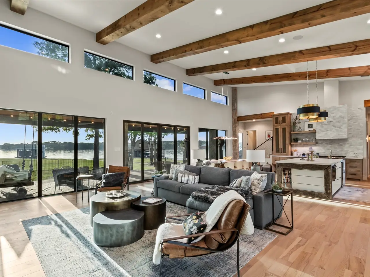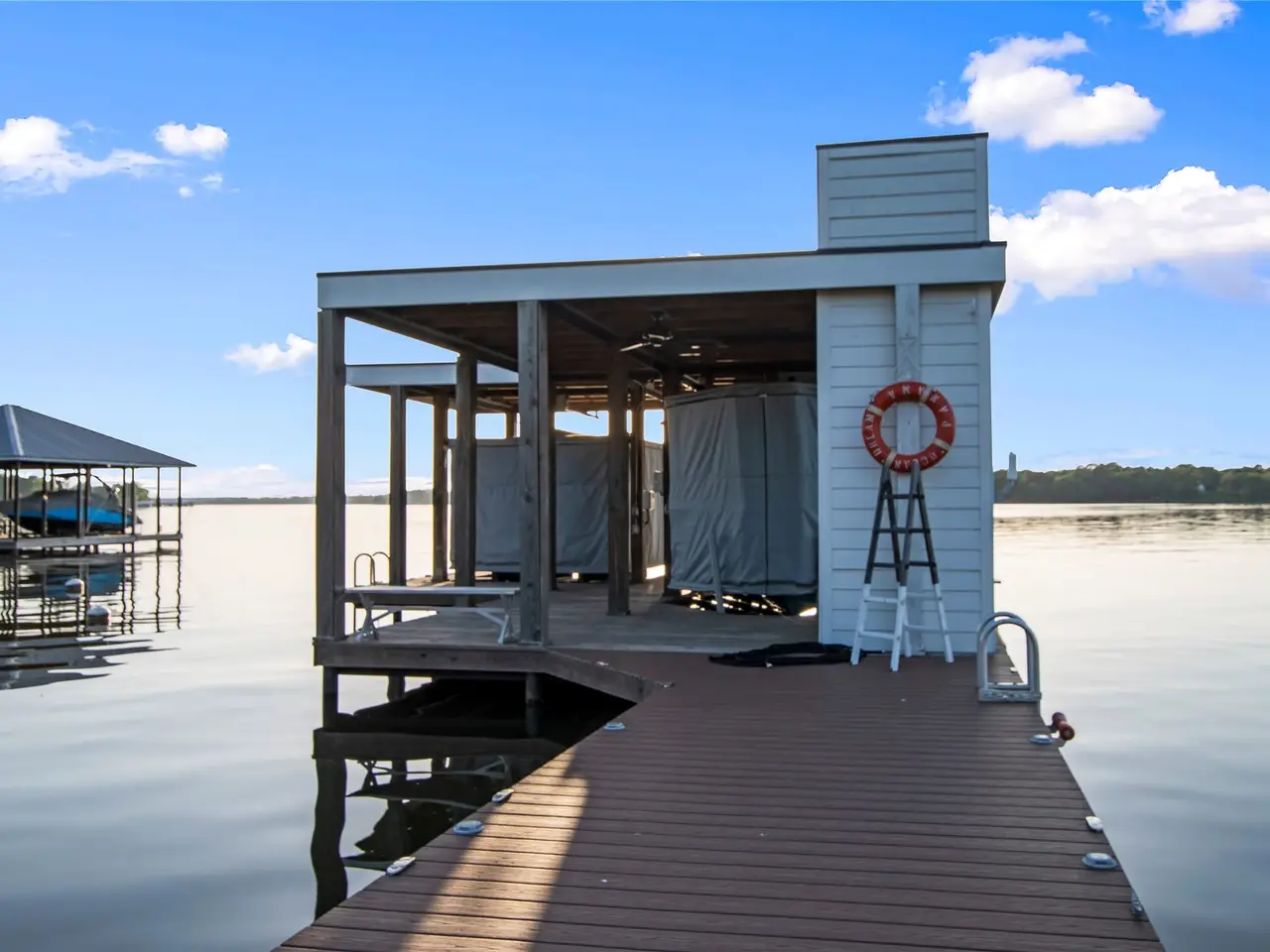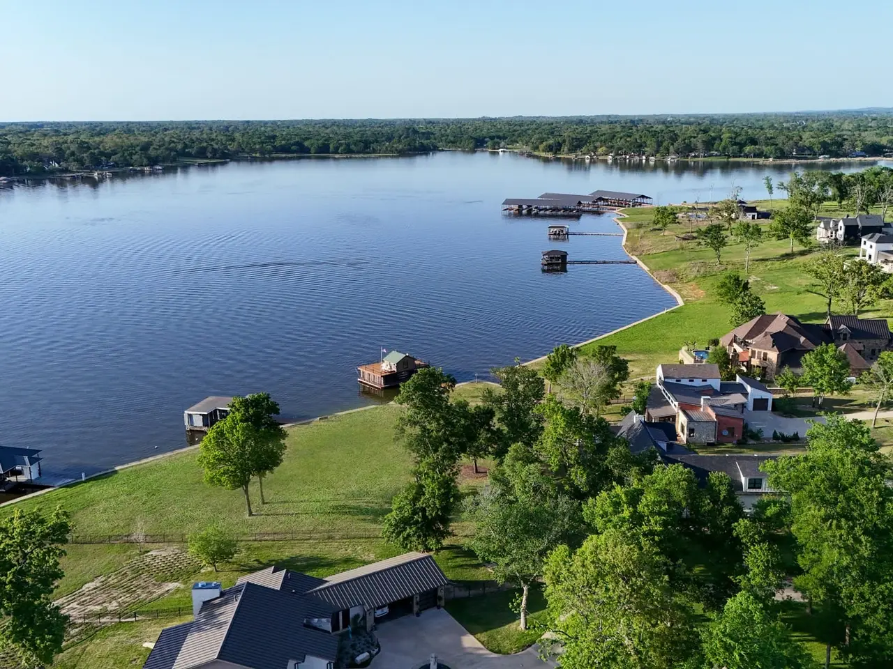 Welcome to your dream lakefront escape in The Bluffs, a prestigious gated community on Cedar Creek Lake. Situated on a beautifully landscaped acre lot, this modern retreat blends natural materials like stone, wood, and iron to create an inviting, luxurious atmosphere. Inside, the home is bathed in natural light thanks to soaring wood beamed ceilings and a dramatic wall of windows framing picturesque lake views. The chefs kitchen is a true showstopper, featuring a professional Thermador propane gas range, island seating, farmhouse sink, built-in ice maker, and a striking glass door wine cellar, perfect for entertaining. Genuine hardwood floors flow throughout, leading to a first floor lakeside primary suite with wood beam ceilings and spa like ensuite bath offering dual vanities, a walk in shower, and a relaxing soaker tub. Three more additional guest bedrooms, two with built in bunk beds for added flexibility. Outdoor living is just as impressive, with multiple entertainment areas designed for true lake life. A large covered composite deck with automatic screens provides the ideal setting to enjoy the view, mosquito free. The wrought iron fenced yard is perfect for kids and pets, while the private boathouse includes automatic lifts and covers for both a boat and personal watercraft, making lake access effortless. Residents of The Bluffs enjoy a waterside clubhouse, community firepit, and picnic areas. Located in a prime spot on the lake once home to a waterski school, this area is beloved for its smooth waters, fishing, and recreational fun. Sold furnished with a few exclusions. Watercraft available separately. Additional boat slip in community marina available for $55,000.00.