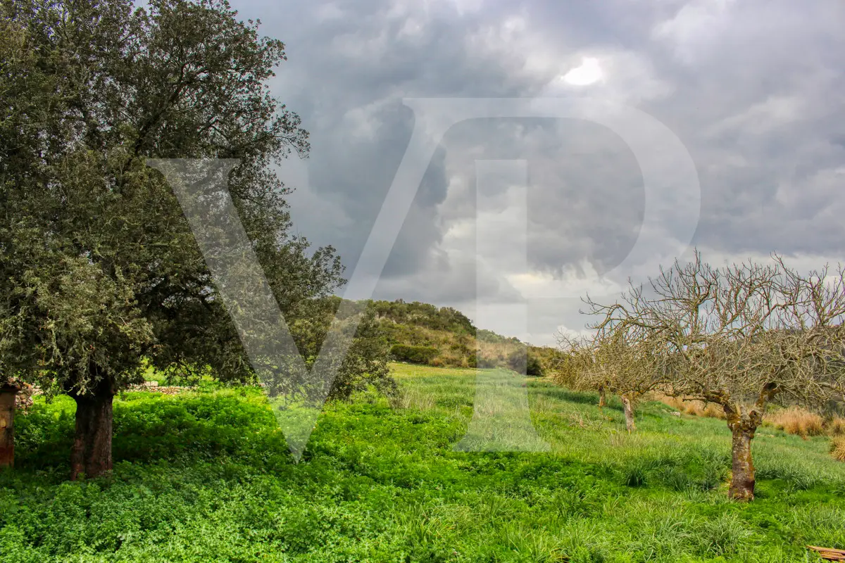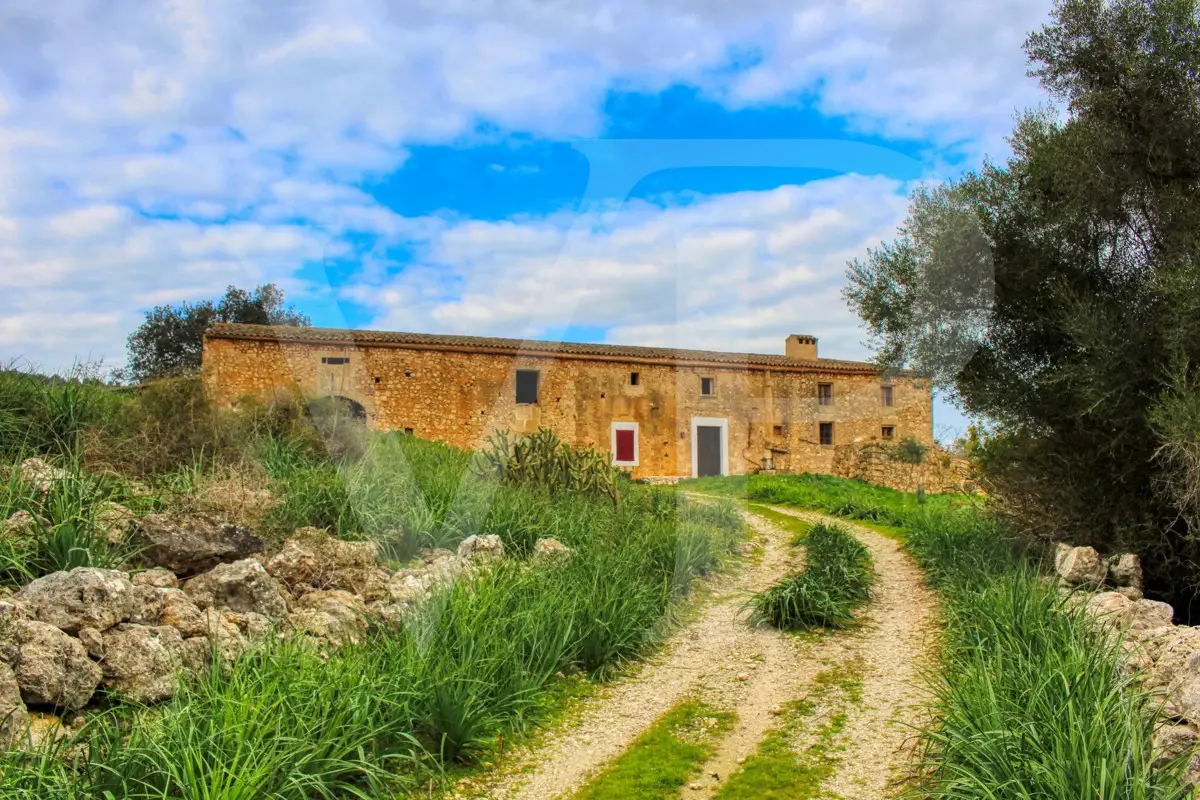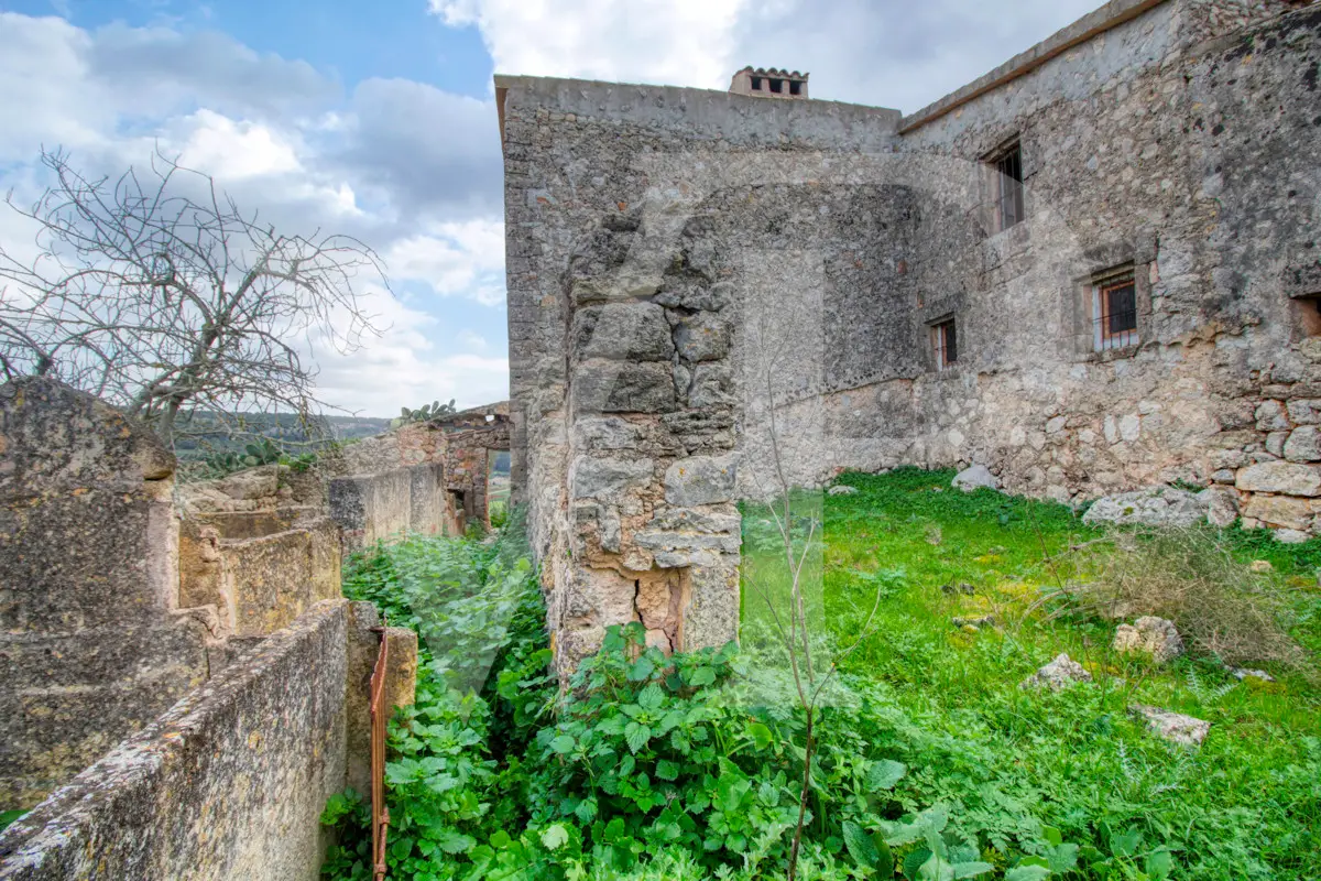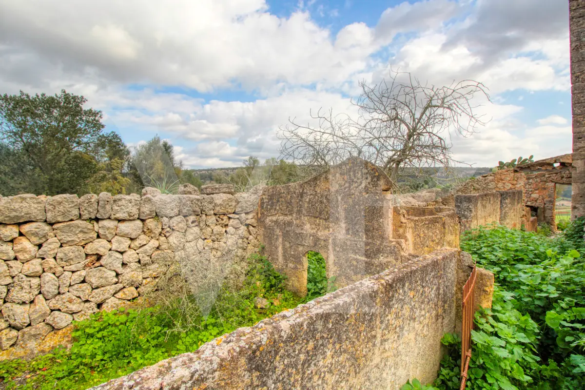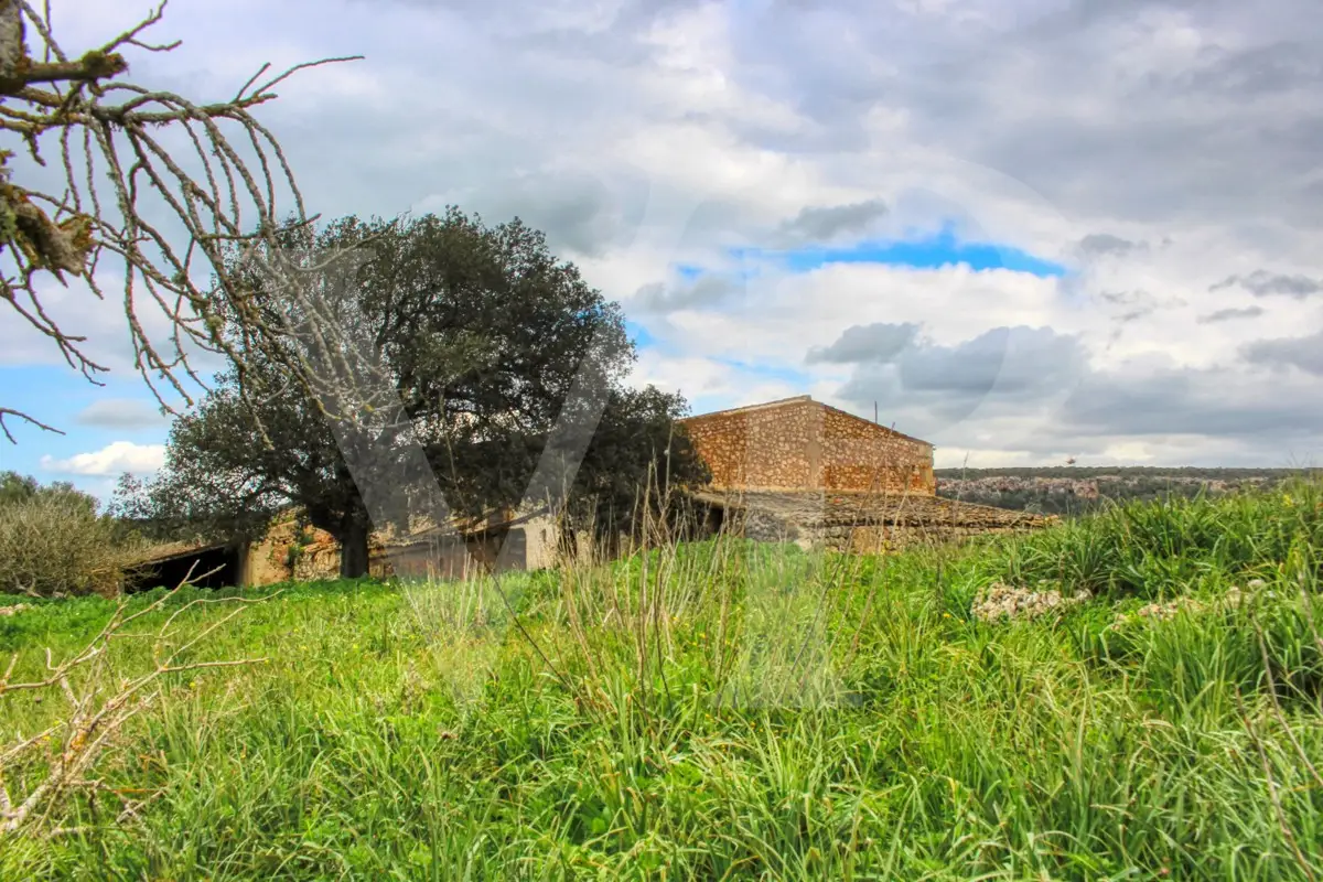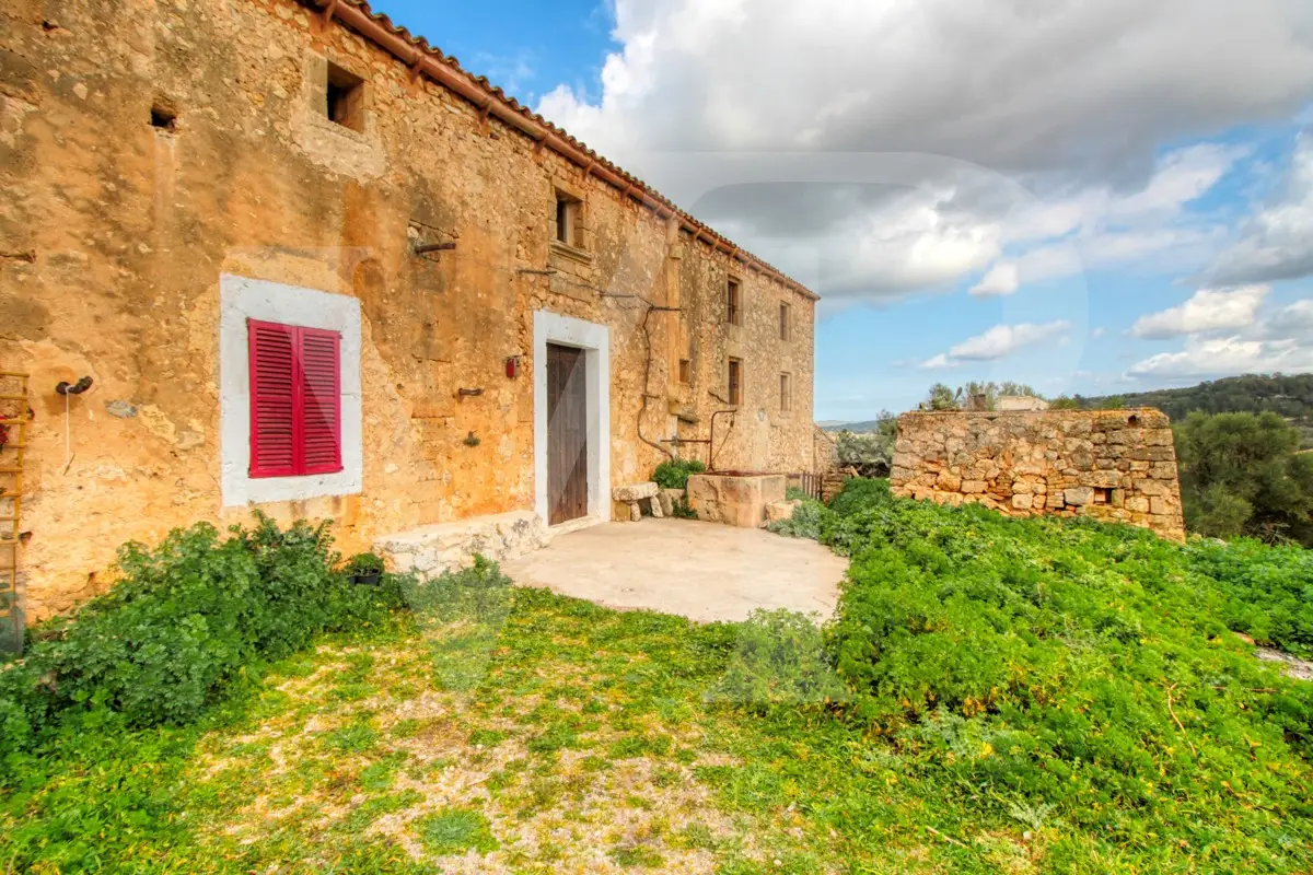 Spectacular finca for sale with fantastic Mallorcan "possessió" house in a unique enclave, a beautiful hill in the north of Manacor. This spectacular finca sits on the top of a hill between the municipalities of Petra, Ariany and Manacor and covers almost 47 hectares of land. Overlooking the valley of Manacor, where the view extends to the beautiful mountains of Ferrutx and Arta. Surrounded by a varied landscape, incredible cliffs, cultivated fields, Mediterranean forests and beautiful hills. Access is via a country road with a few properties and through a deciduous forest to the house. Distributed over two floors, in a good state of conservation, with a total area of 760 square meters, built before 1956. It has an old kitchen/dining room with large fireplace, pantry, three bedrooms and a large open space upstairs. The kitchen has access to a charming small courtyard "cloister", former stables and verandas. Two old stables, large threshing floor, the property is completely fenced with grids and stone walls. Large cistern with large water storage capacity, own 60 meter well in the old orchard. There is also a water source with a constant inflow from the mountains, about two tons per day. At the top of the finca's hill there is a large flat area with a unique view. Most of the property is located in a Natural Area of Special Interest, a protected natural area.