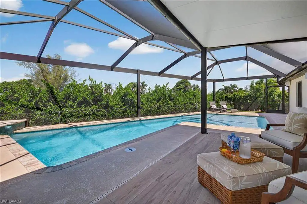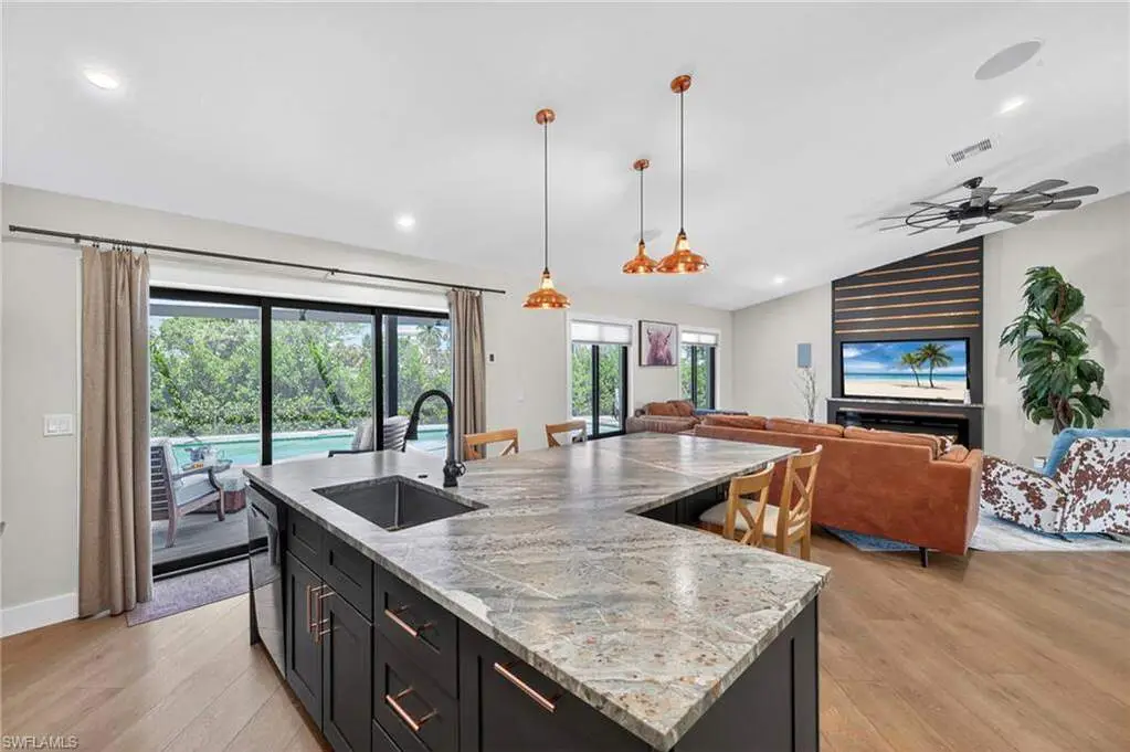 Welcome to 1030 Hartley Street in desirable Marco Island location. This 4 bedroom/3 bathroom single family house with a modern farmhouse aesthetic has been completely redesigned and renovated in 2023 ideal for today's living. Enter into a welcoming foyer to an open-concept living space featuring wide plank light oak flooring and vaulted ceilings. Spacious living room features a linear fireplace and contemporary accent wall. Wall of glass opens to fabulous outdoor living space seamlessly blending indoor/outdoor living. Large pool with sunshelf and spa, putting green plus a private grassy rear yard ideal for dog lovers and play. A true chef's eat-in kitchen features shaker cabinetry, slate finish stainless steel appliances, contemporary backsplash and oversized island ideal for daily dining and entertaining. Master suite oasis with spacious bedroom, spa-like master bathroom and a walk-in closet. 3 guest bedrooms, 2 guest bathrooms plus an additional bedroom currently used as a home office. Oversized 2-car garage could accommodate up to 4 vehicles with an added lift or RV. Desirable location mere minutes from beaches, shopping and dining. Totally renovated inside and out in 2023 including new facade, new garage door, new roof, new impact-resistant windows and doors, new HVAC system, new hot water heater, new plumbing and electric, new pool, spa and lanai, new landscaping, new irrigation, new paver driveway, as well as new interior flooring, new surround sound, new kitchen and new bathrooms this is a truly exceptional home with no expense spared. Turnkey.